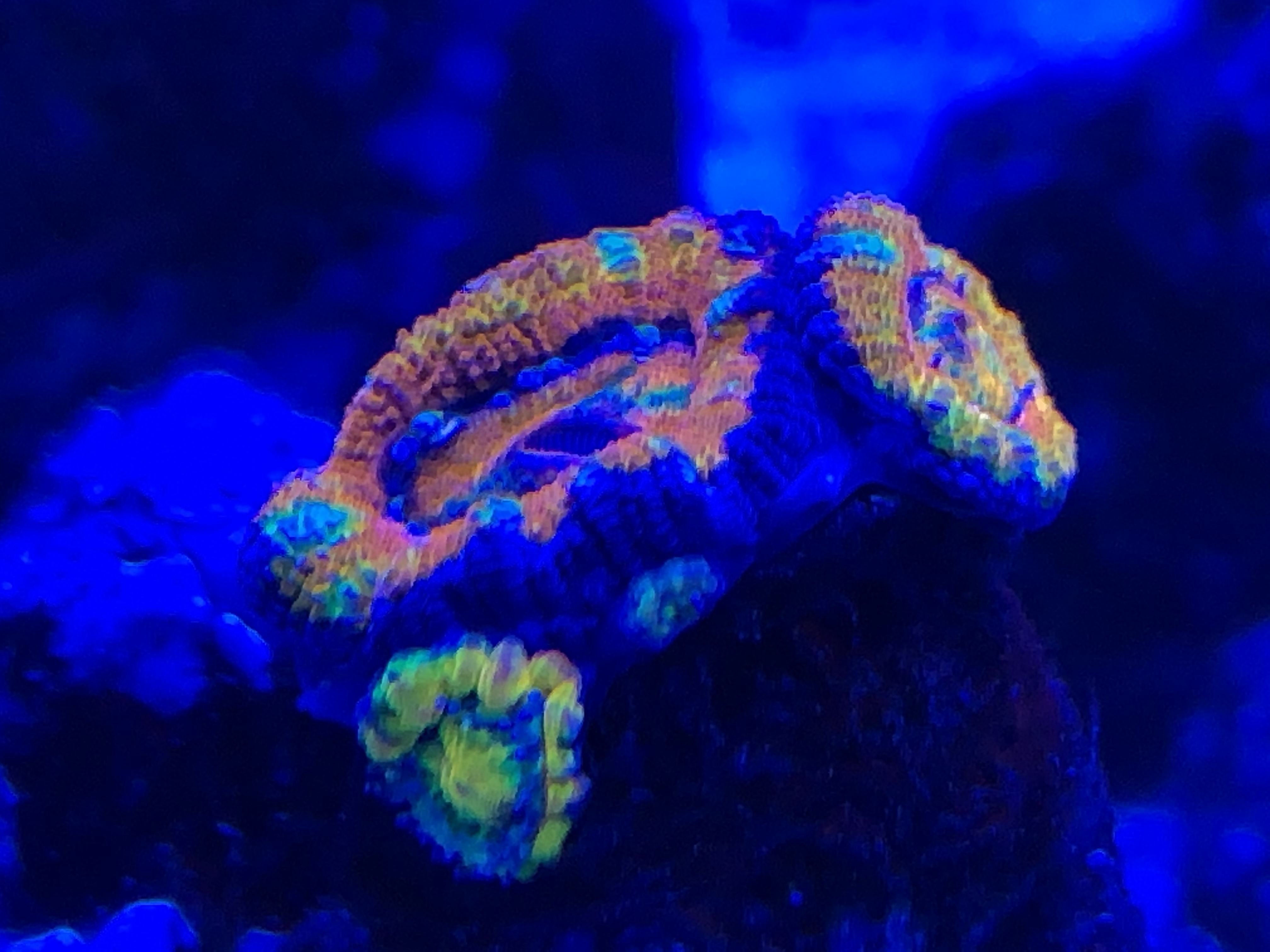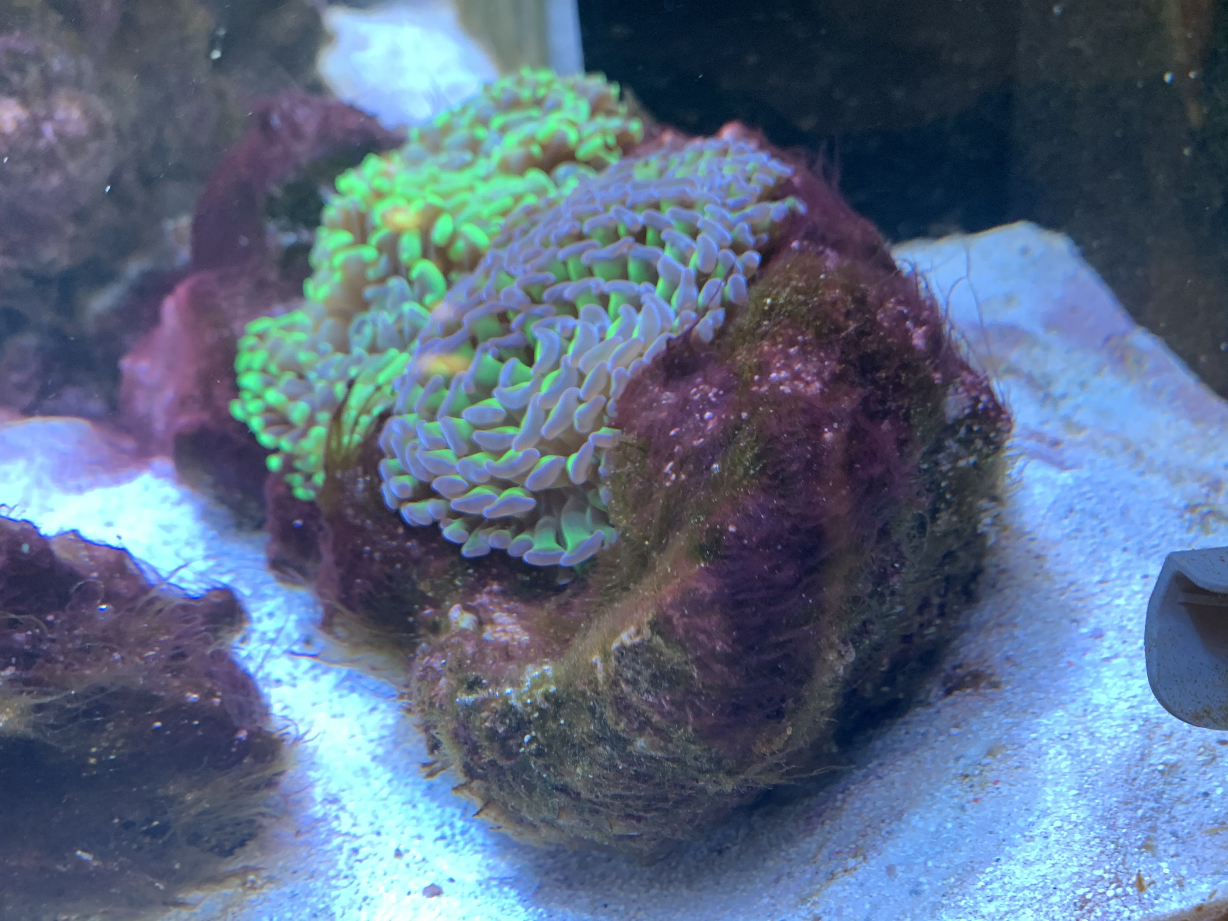 Meine Acan :love: Hatte ich vor 3 Jahren von meinem Meerwasserlädchen als einzelnen Polypen bekommen (der war echt übel teuer), aber ich habe solche Freude dran. Anders als die blau-grüne Acan (komplett gefressen) lassen die Terroristen diese Acan fast zufrieden (rechts ist sie mal wieder etwas angefressen).