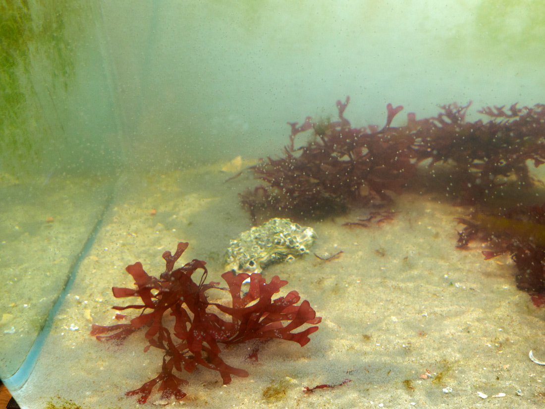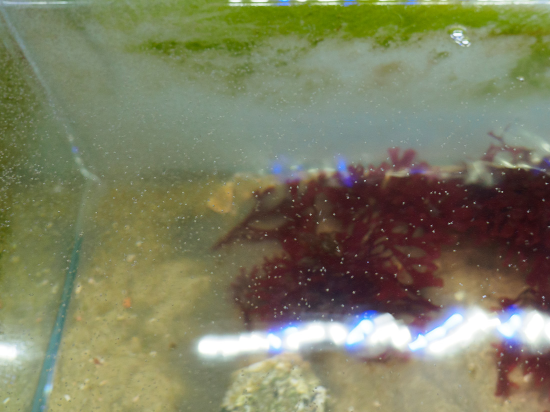 Die sandigen Flecken im Kreisel sind noch Schwebstoffe aus dem Nordseewasser, ich hatte den Kanister nicht vorsichtig genug gehandhabt. Aber den Larven ist das egal. Morgen kommt eh alles raus, dann gibt's UV-behandeltes Wasser und Absolute Ocean als Mix. Dann trennt sich in der Sortierschüssel die Spreu vom Weizen, die schnellsten am Licht werden weiter großgezogen.