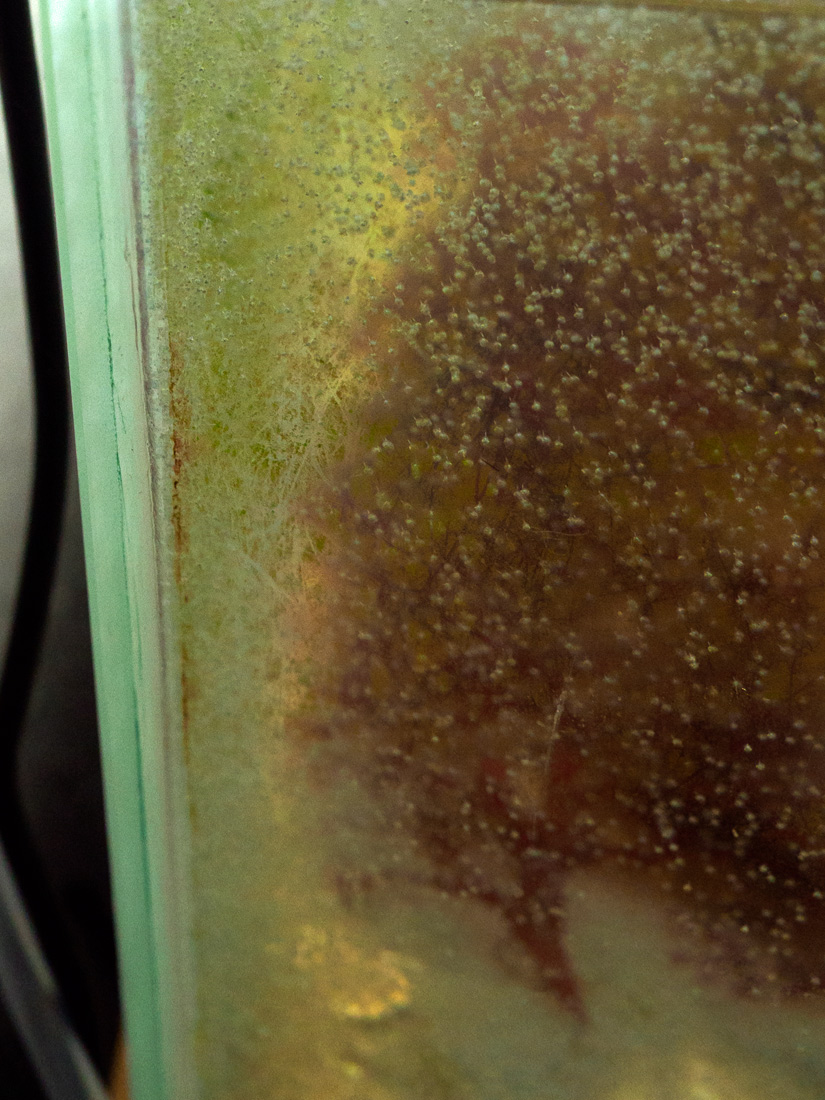 Der graue Belag auf dem Sand, das sind die toten Larven. Die weißliche Trübung, das sind die lebenden.