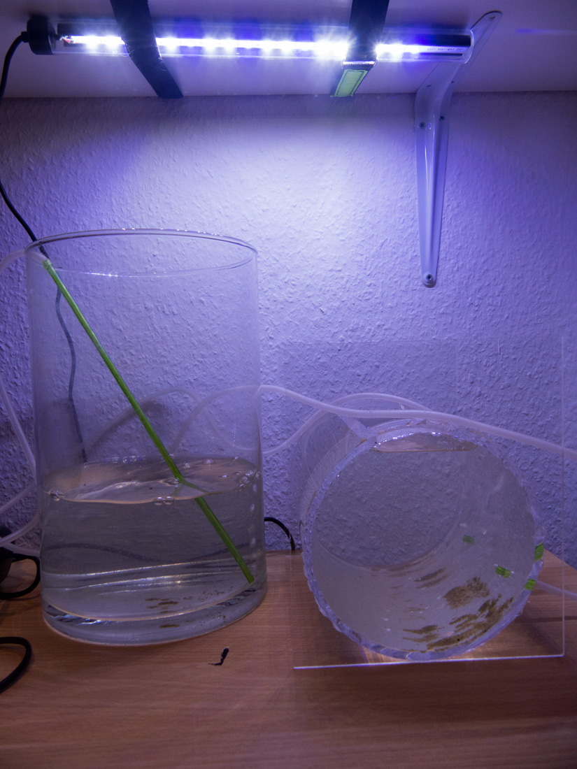 Ich muss mir jetzt überlegen, wie ich das Aquarium sauber bekomme mit Madame drin. Die andere Hälfte ist aber sehr vital! Ich habe einiges mit einem Glas abgeschöpft und Kreisel plus Vase besetzt.