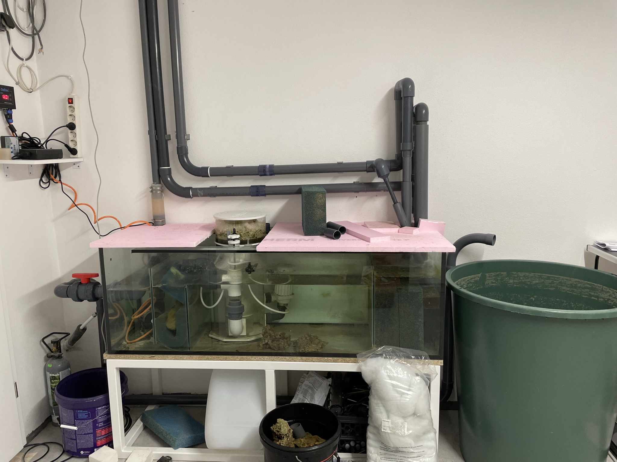 Die ehemalige Rückwand dient jetzt als Rampe, darunter befindet sich der Filter (die Rampe kann angehoben werden), hinten ist alles mit Filterschwamm abgedichtet. Das Düsenstrahlrohr ist die Rampe herunter gerichtet und beströmt die lebenden Austern, die jetzt auf der Rampe liegen.