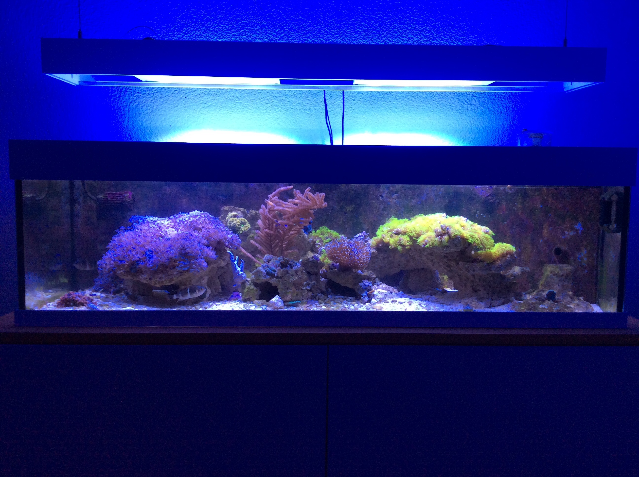 Das Becken ist sehr einfach gehalten. An Technik vorhanden ist ein Miniflotor, eine Tunze 6045 und ein Juwel Pümpchen als Förderpumpe aus dem Technikabteil, welches ganz einfach mittels schräg eingeklebter Forexplatte gebastelt wurde. Beleuchtet wird das Becken von 3 AI Sol blue welche extrem runtergedimmt werden müssen. Dafür habe ich eine fast flächige Beleuchtung und kaum Abschattungen.