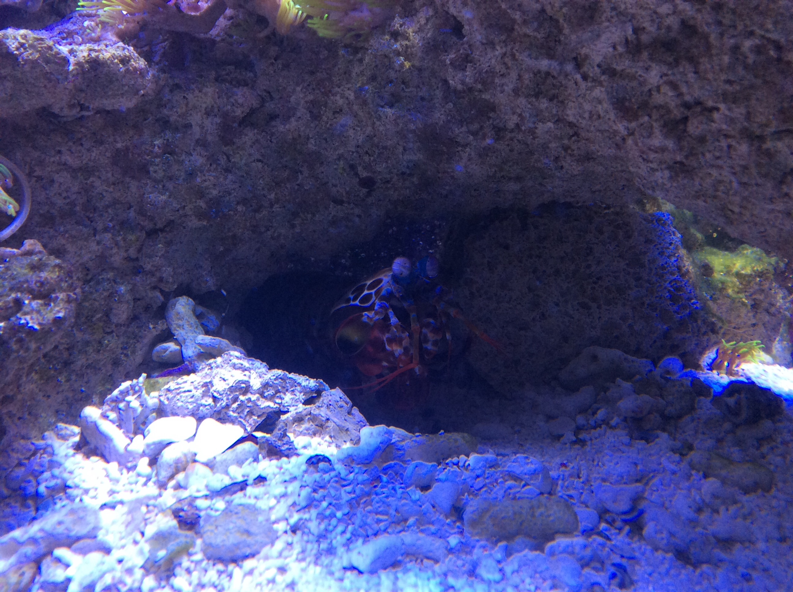 Gefüttert wird 2-3 mal pro Woche, hauptsächlich mit ungekochten Nordseegarnelen, manchmal mit etwas Lipovit angereichert. Zwischendurch gibts auch mal Meeresfrüchtemischung, allerdings traue ich dem Zeug nicht so, da das meist gekocht und geschält ist, was nach meinem Verständnis nicht einer möglichst natürlichen Nahrung entspricht. Wilma wird grundsätzlich nur mit der Pinzette gefüttert, wobei wir so auch gleich ihre Schlagwaffen trainieren. 3 mal im Jahr bringe ich ihr Schnecken, kleine Strandkrabben, Felsengarnelen oder Einsiedler vom Urlaub mit. Brutal, aber Natur. Bin mir aber noch nicht klar wie wichtig Lebendfutter tatsächlich ist.