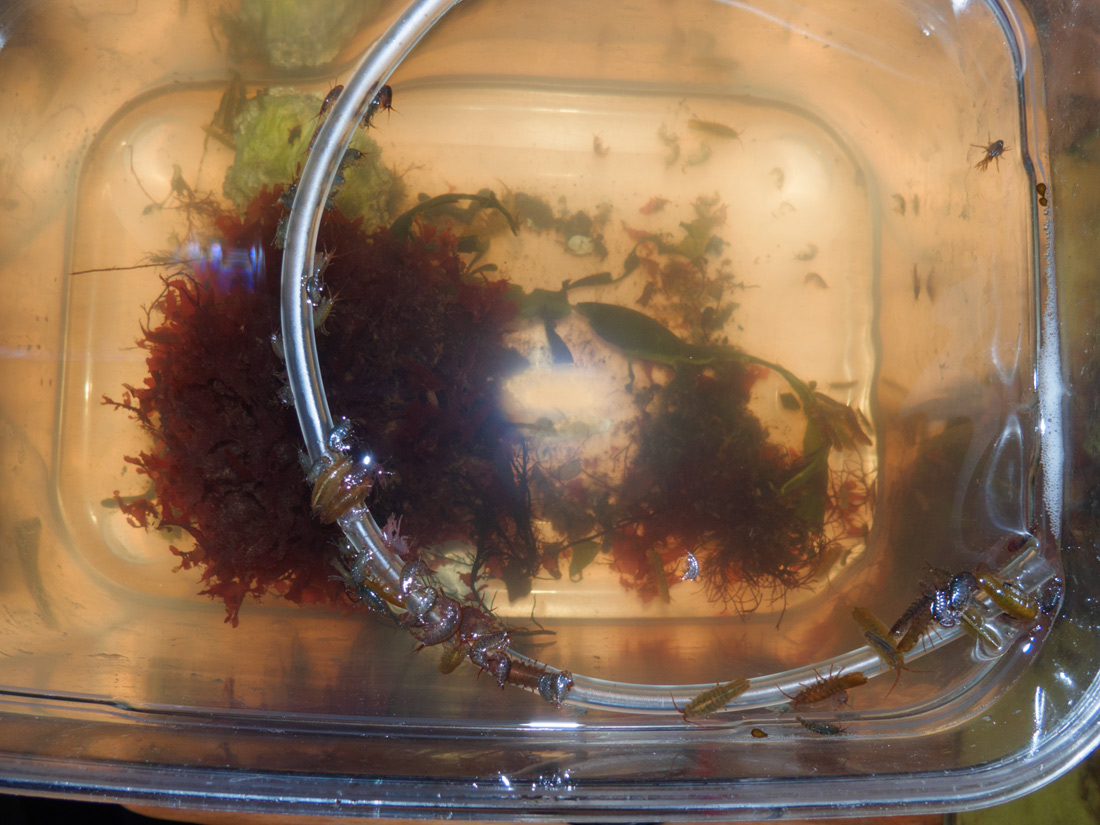 Die ca. 30 Klippenasseln fahren am Donnerstag nach Borkum. Die Flohkrebschen haben wieder die Felsengarnelen bekommen.