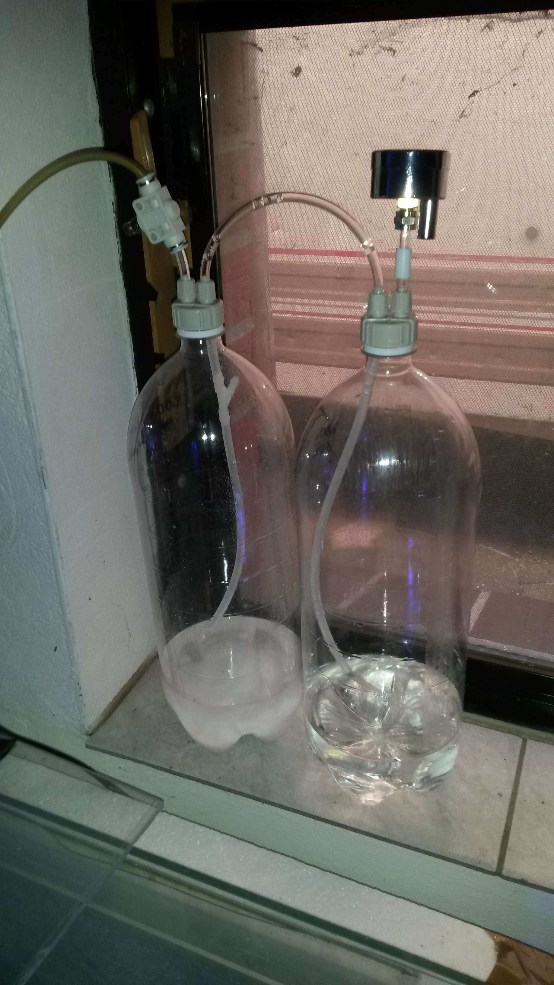 Aber dann ging das Ventil auf (ich war leider nicht live dabei) und nach etwa 2 Stunden war die komplette Zitronensäure in die andere Flasche mit dem Natron gelaufen. Der Druck stieg dann auf über 4 bar ... gute Flaschen, nix explodiert :)