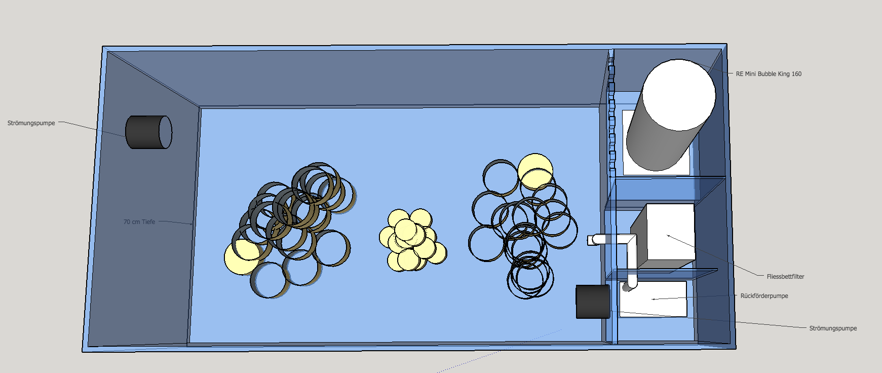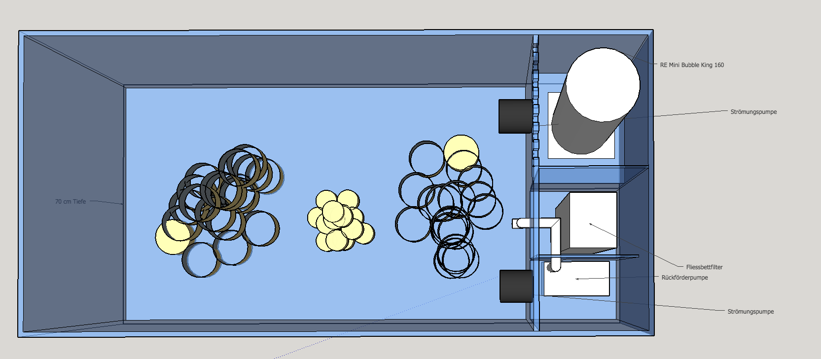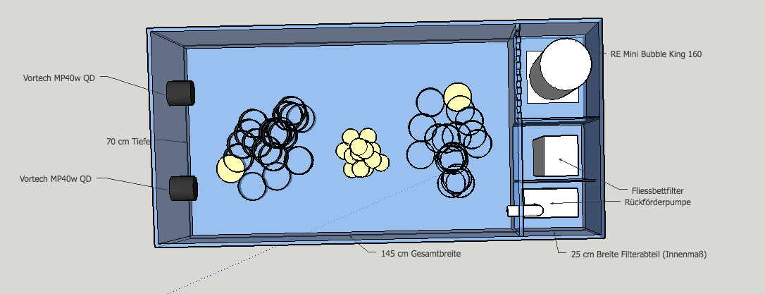 b) zwei Strömungspumpen gegenüber vom Filterabteil => hier strömt dann natürlich die Förderpumpe entgegengesetzt zu den Strömungspumpen. Der Auslass der Förderpumpe könnte natürlich noch anders geplant werden, ist nur eine grobe Planung.