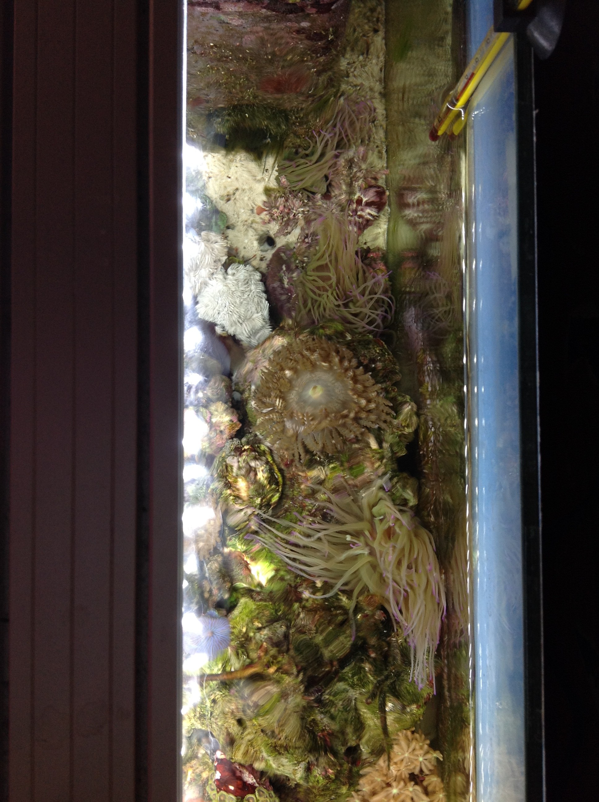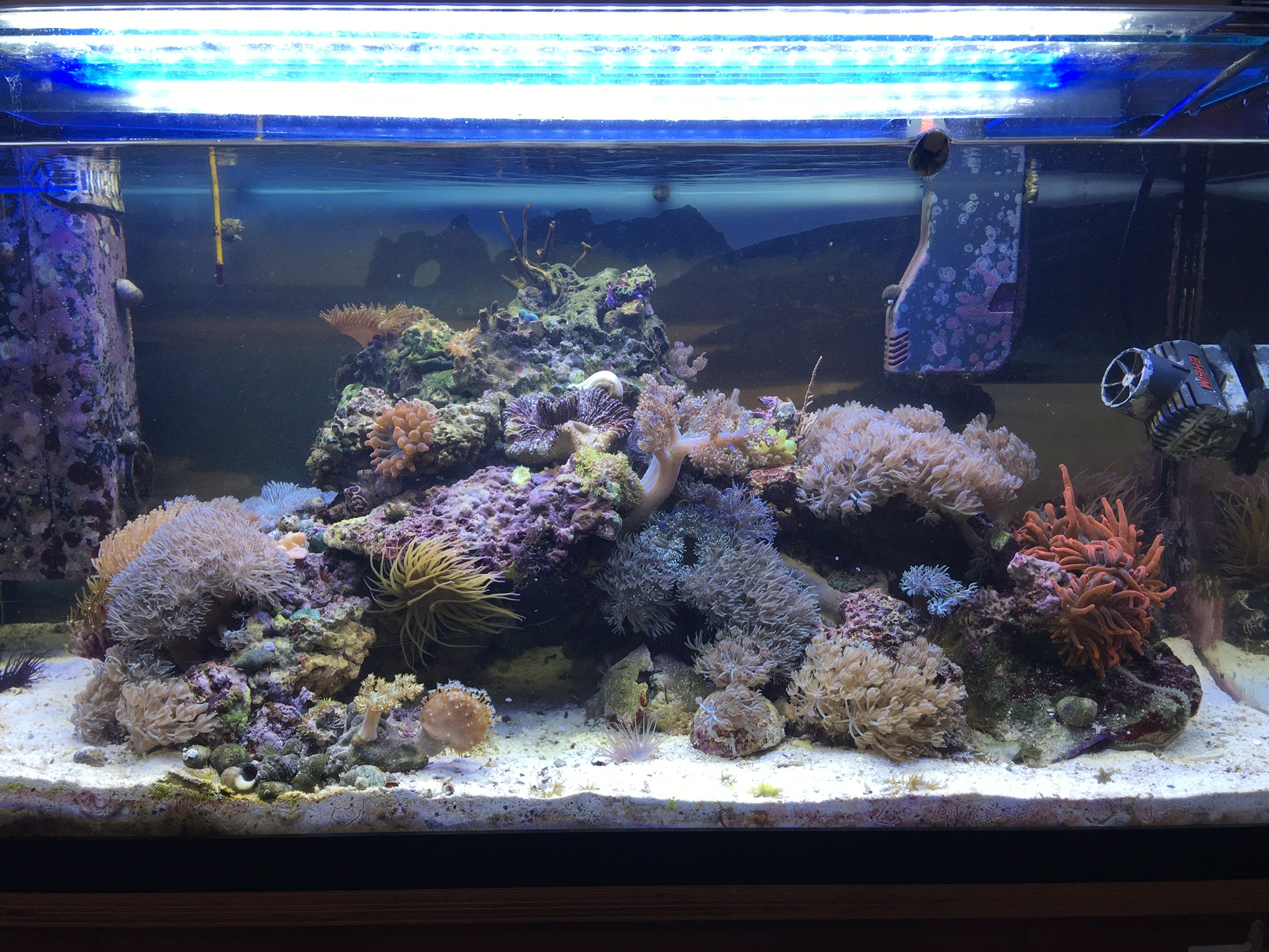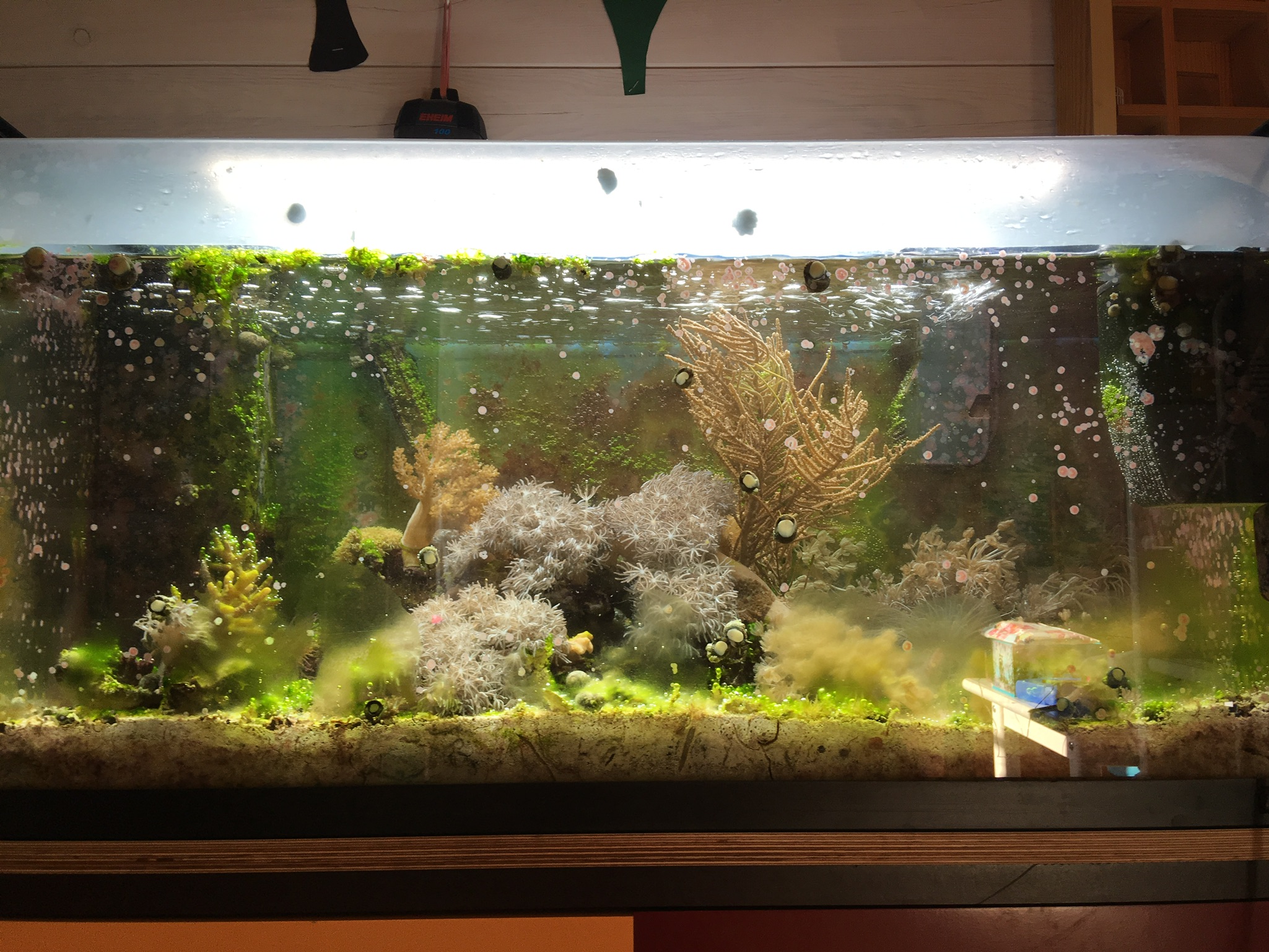 Möchte hier mein Anemonenbecken vorstellen. Entstanden aus Mathildas Becken, in dem ich zuletzt ja ziemlich mit grünen Cyanos zu kämpfen hatte. Als Mathilda noch drin war, hab ich meistens einmal am Tag alles abgewedelt, zwei Filter aus dem Süßwasser mitlaufen gehabt und ständig die Watte gewechselt. Ich hab mal ne Zeitlang täglich Synechococcus zugegeben, das hat ein bisschen was gebracht, aber wenn man einen oder mehrere Tage ausgesetzt hat, war alles wieder zugeschleimt. Außerdem hab ich immer wieder Special Blend dosiert, damit hab ich bei roten Cyanos mal Erfolg gehabt. Es war einigermaßen im Griff, aber sobald ich ein paar Tage nix gemacht hab, wurde es schlimmer.