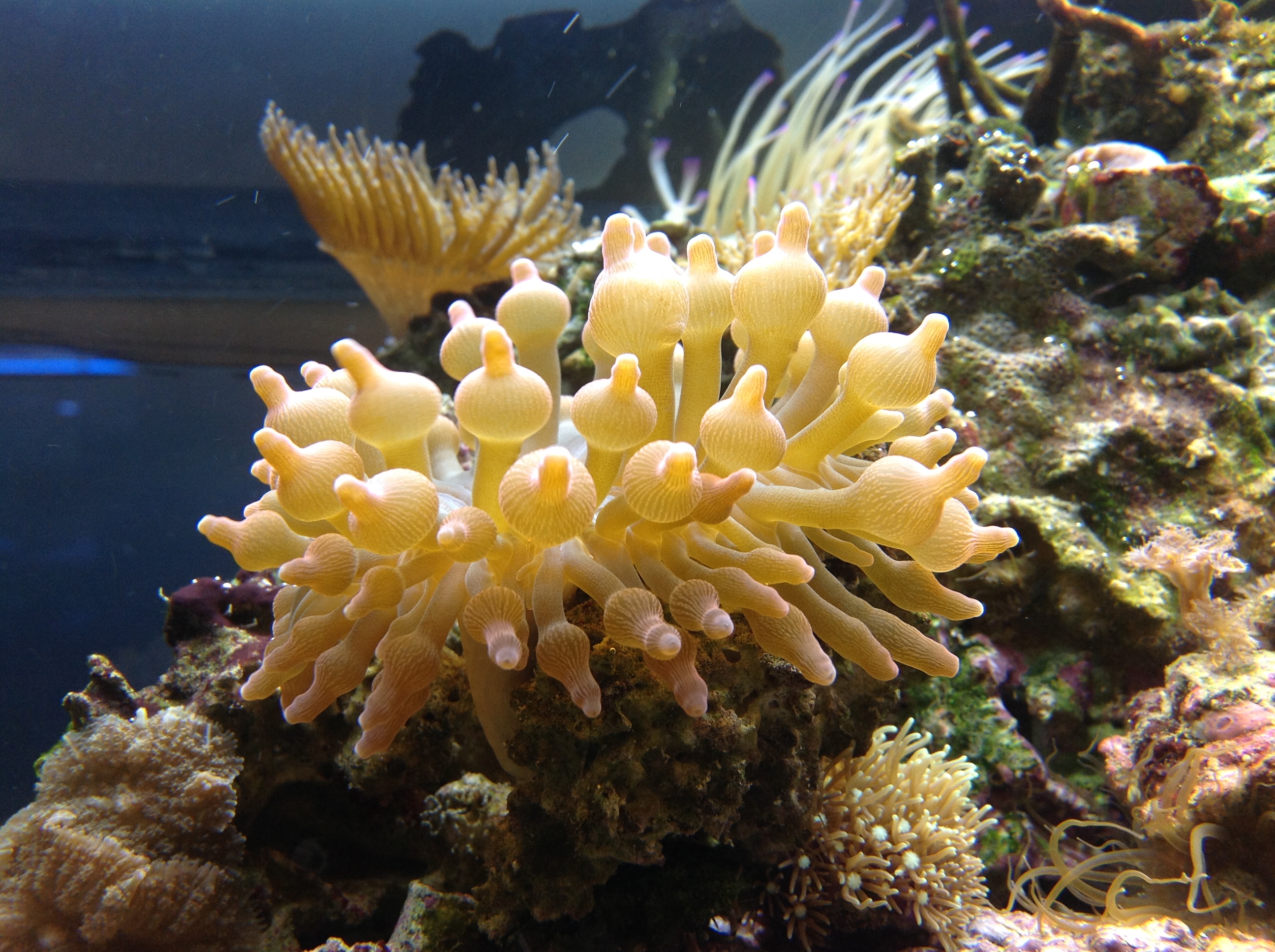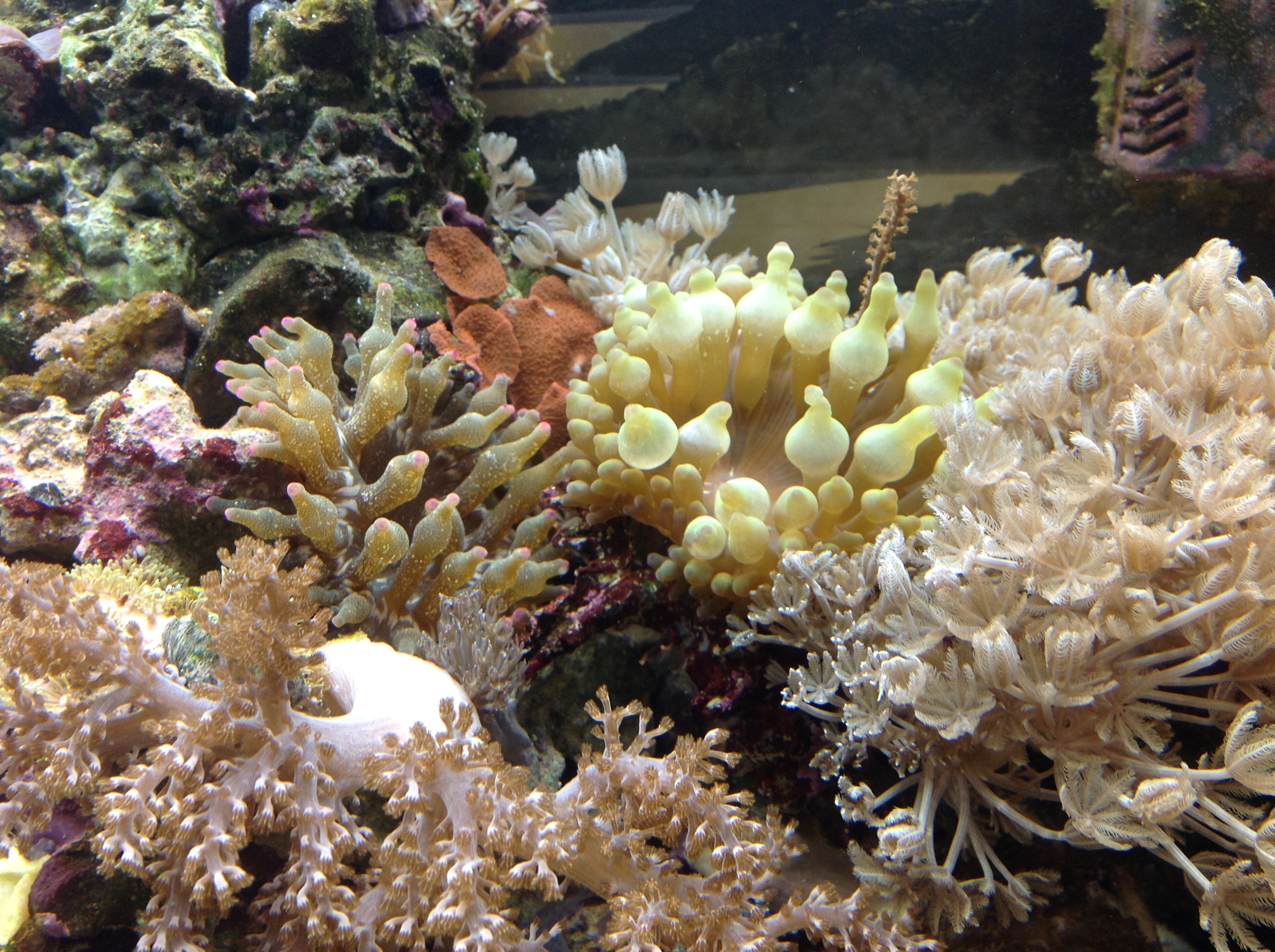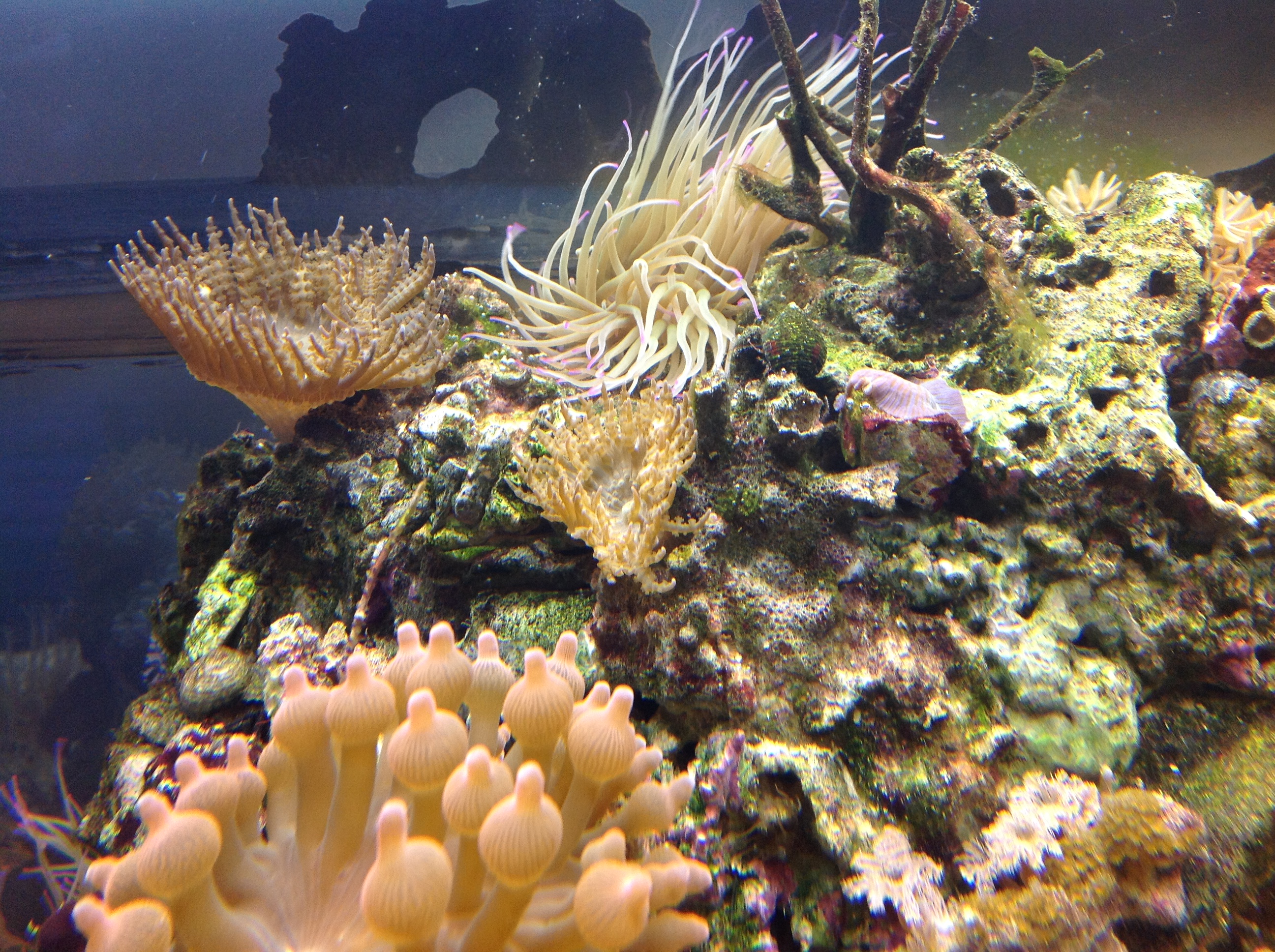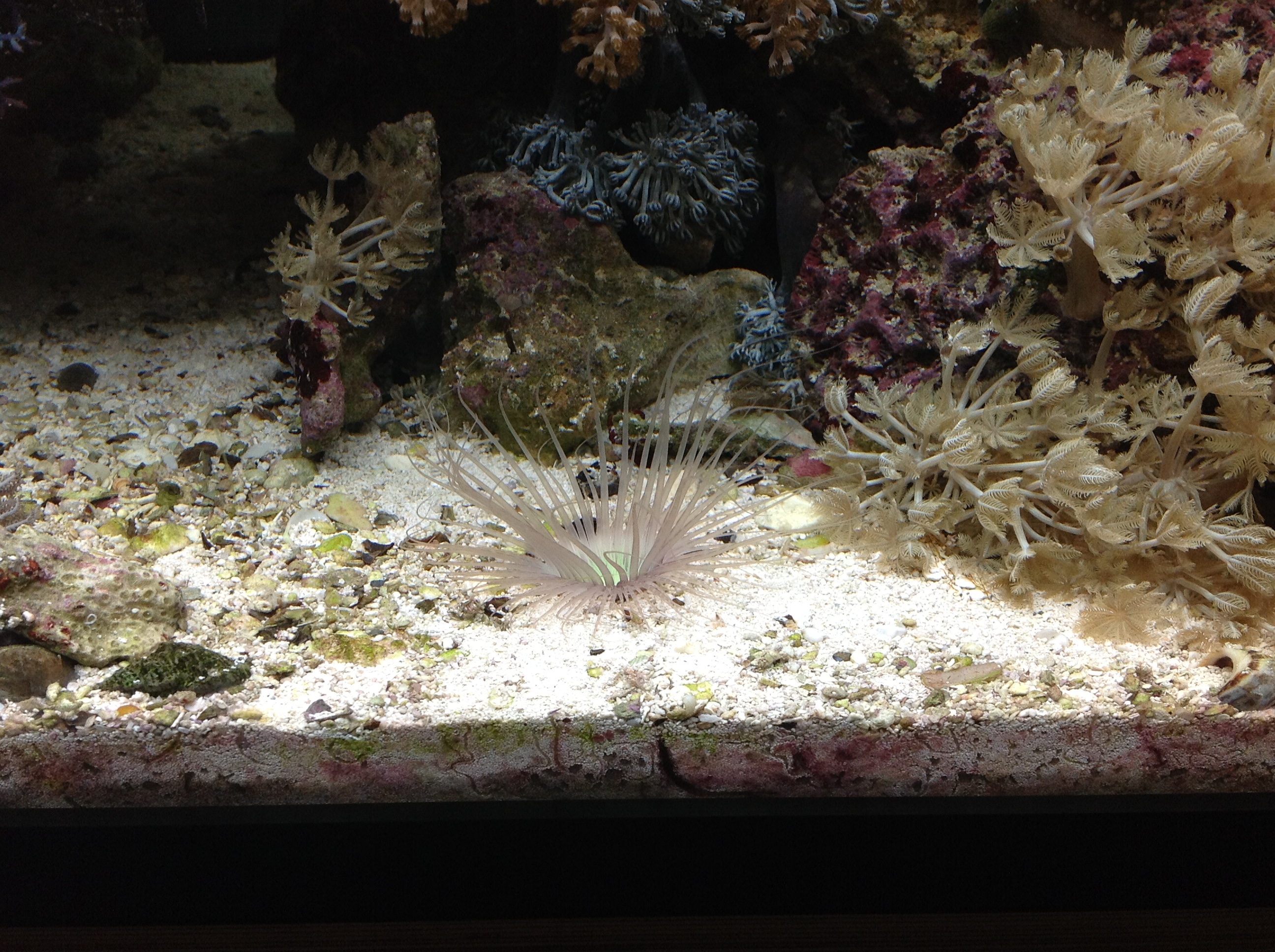 Ansonsten einfach ein paar Fotos. Bisher läuft alles gut. Die grünen Cynos sind nicht wieder aufgetaucht, den meisten Anemonen gefällt es anscheinend da, wo sie sind, nur eine Wachsrose auf Wanderschaft wurde von mir mit einer flachen Pinzette vorsichtig entfernt und in ihr Eckchen zurück verwiesen...