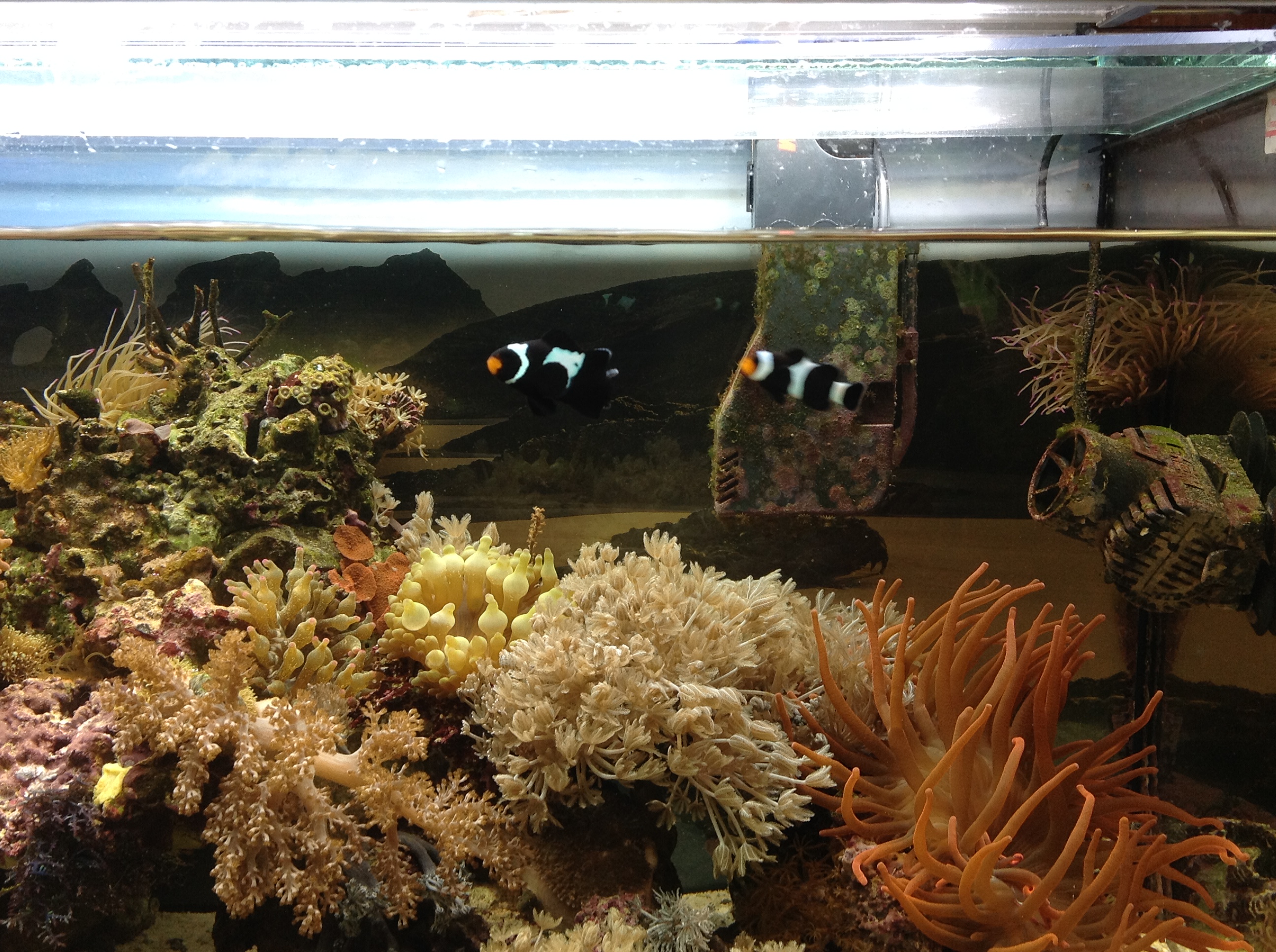 Die Nemos sind von der Fülle an Anemonen überhaupt nicht beeindruckt, sie schwimmen einfach so rum. Aber Feinde oder Stress haben sie in dem Becken ja nicht, so dass es irgendwie auch keinen Drang gibt, sich in die Anmeone zurückzuziehen. Egal, irgendwann werden sie es vielleicht noch merken...