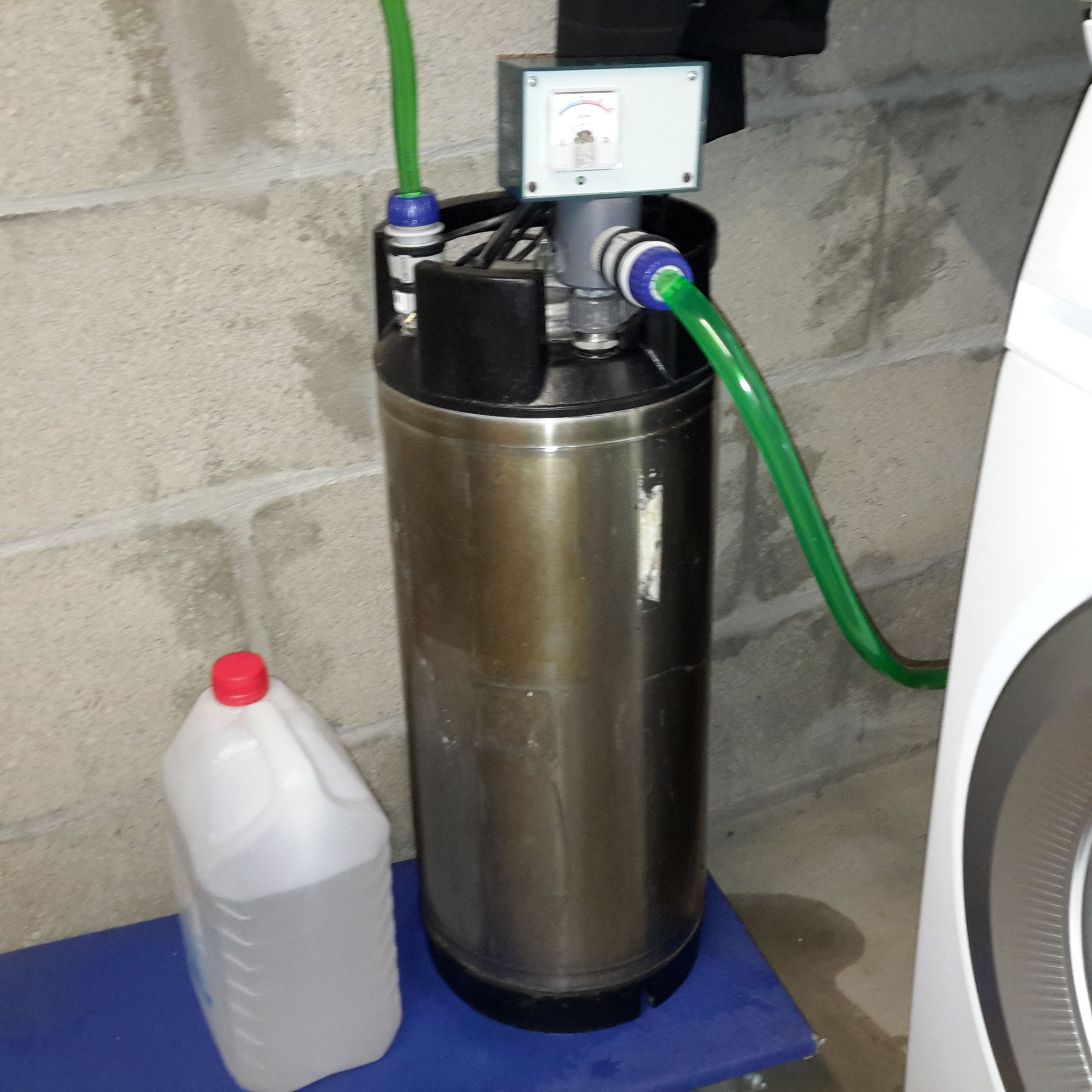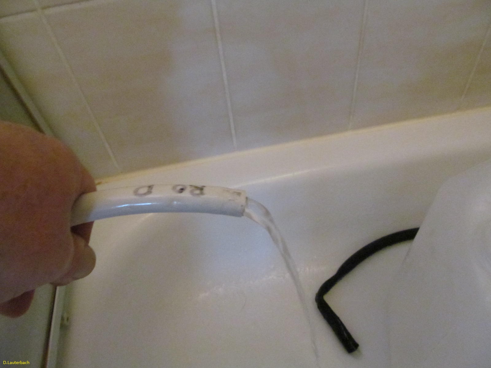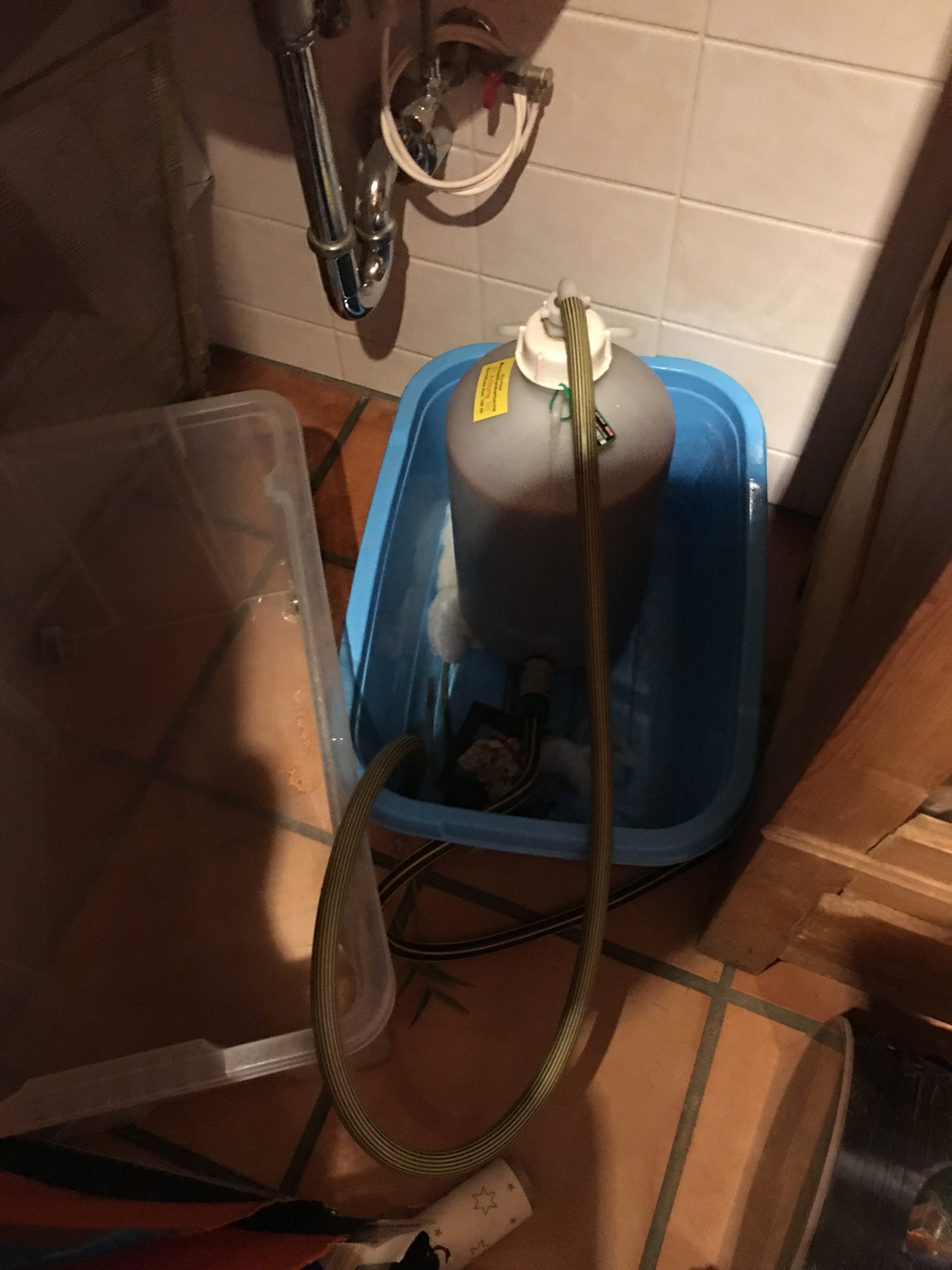 Hier mal ein Bild der Schlauch unten ist an den Wasser Hahn recht s angeschlossen den man nicht auf dem Bild sieht, dann geht das Wasser durch den Filter, und das saubere Wasser kommt dann in den Kanister.