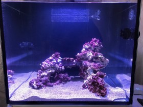 Die Kupferanemone ist inzwischen wieder ausgezogen- die kleine war eine Künstlerin im Wandern. Ansonsten sind wir nach und nach am Weiterbesetzten. Wir haben inzwischen noch eine Mördermuschel, einen grabenden Seestern, einen Schlangenseestern, einige Zoas und unsere erste Acropora.