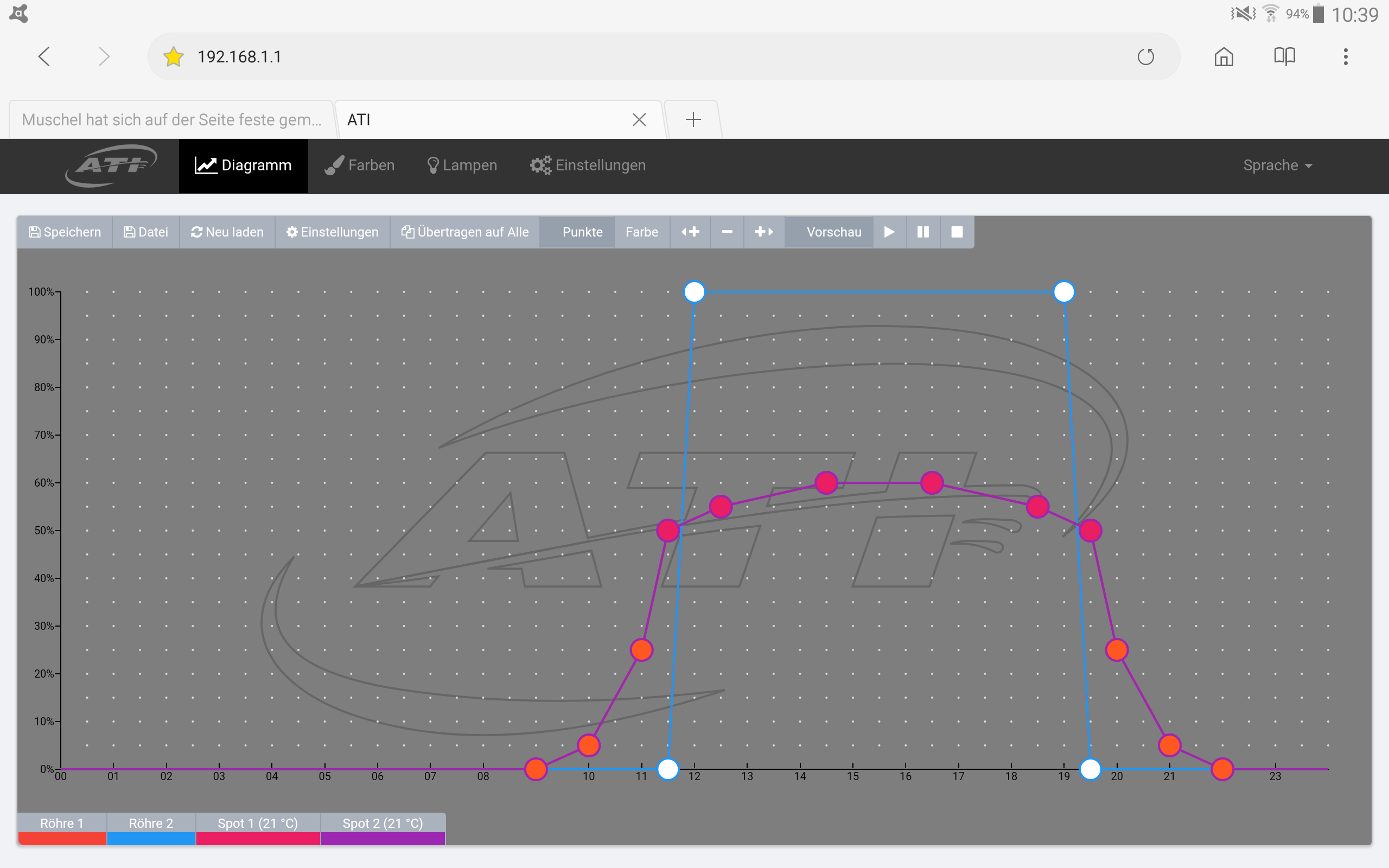 es sind mit der ATI Hybrid genügend Watt über sdem Aquarium. T5 vier mal 39 Watt ( laufen auf 100% 159 Watt ) LEDs zwei mal 75 Watt ( laufen auf 60 % 90 Watt )