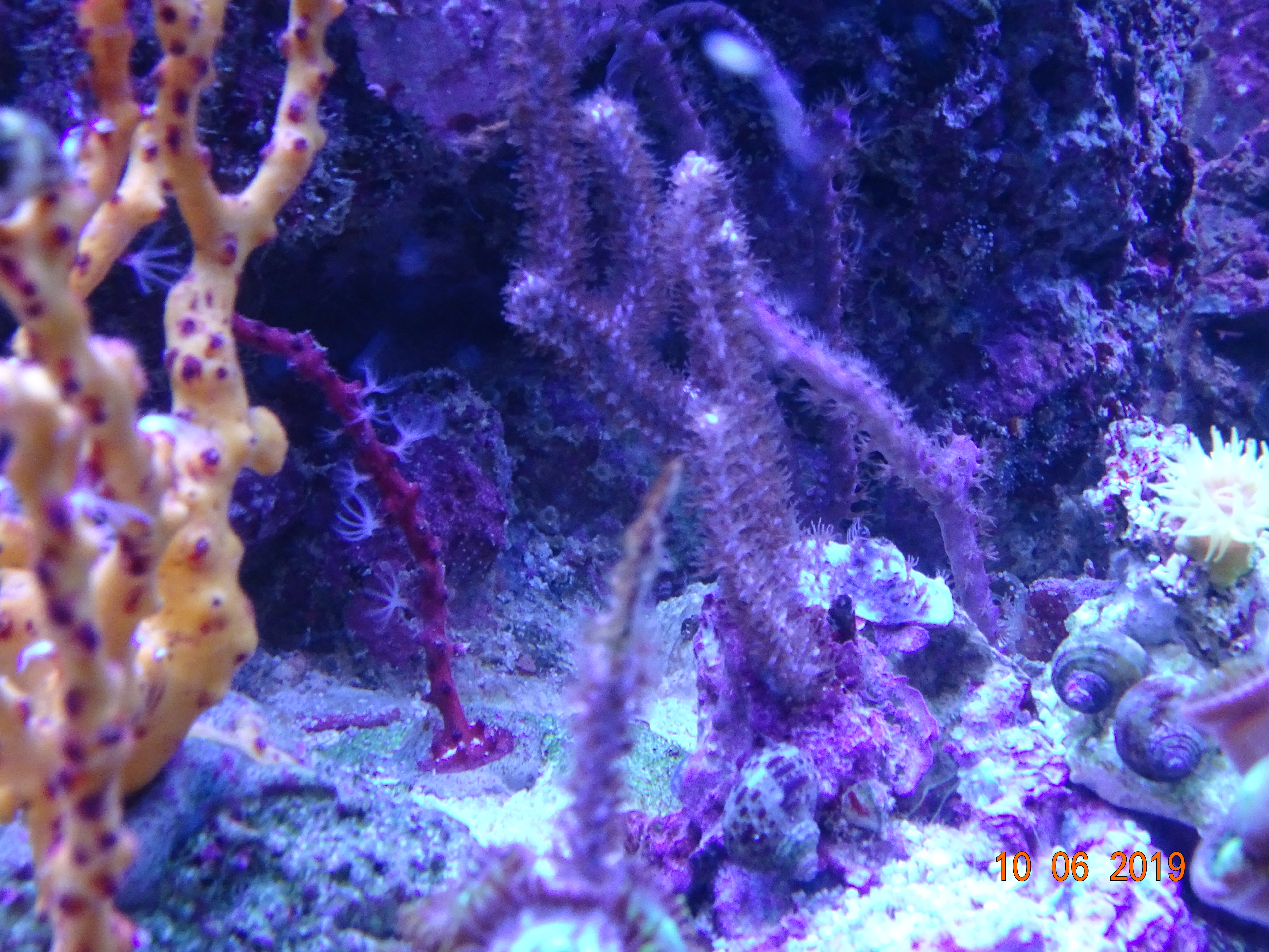 Nachdem ich etwas Luft gemacht habe, die Caulerpa ausgedünnt und einige der Xenien eingefangen habe, die im Becken herumgeschwirrt sind, sieht das Becken jetzt etwas konfus aus. Da muss ich erst was machen, so kann ich es nicht zeigen