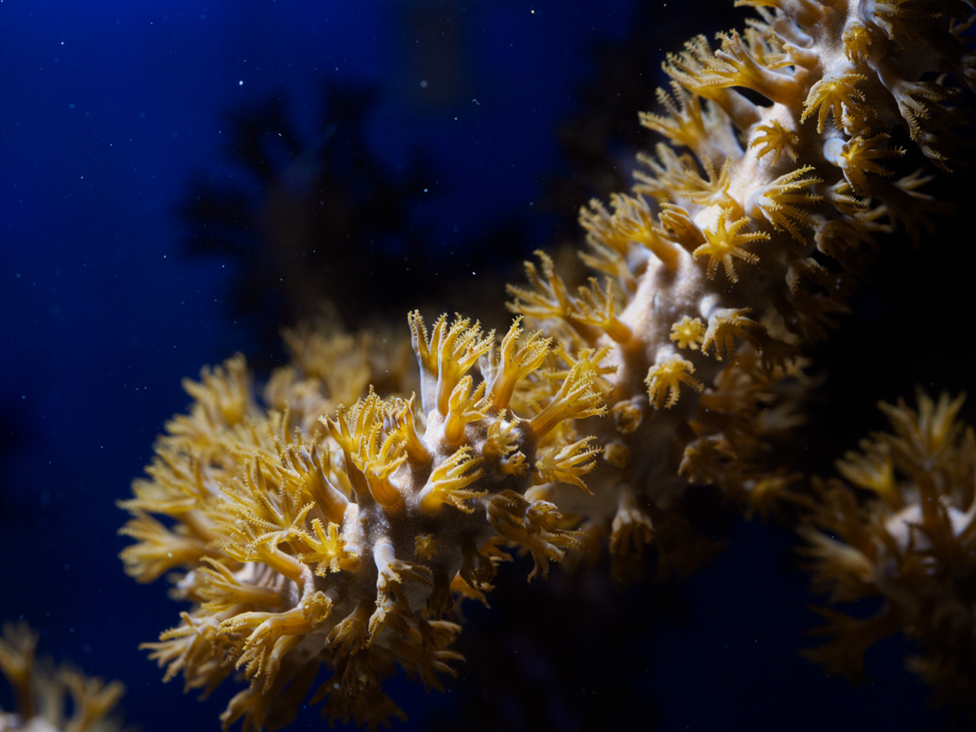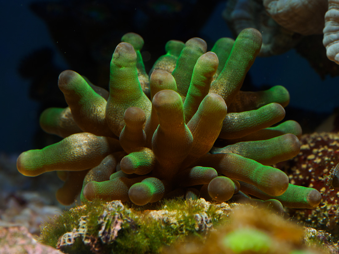 Es ist nur Lebendgestein. Das sah beim Vorbesitzer schon echt übel aus. Die DIY-Leuchte hatte ich schon mal ein Jahr über einem kleinen Nano, lief gut, keine Probleme mit Cyanos. Strömung kommt auch überall hin. In den 10 Litern plus Technikabteil habe ich eine 300-Liter-Pumpe, die macht schon Wind, sollte m.M. nach auch ausreichend sein