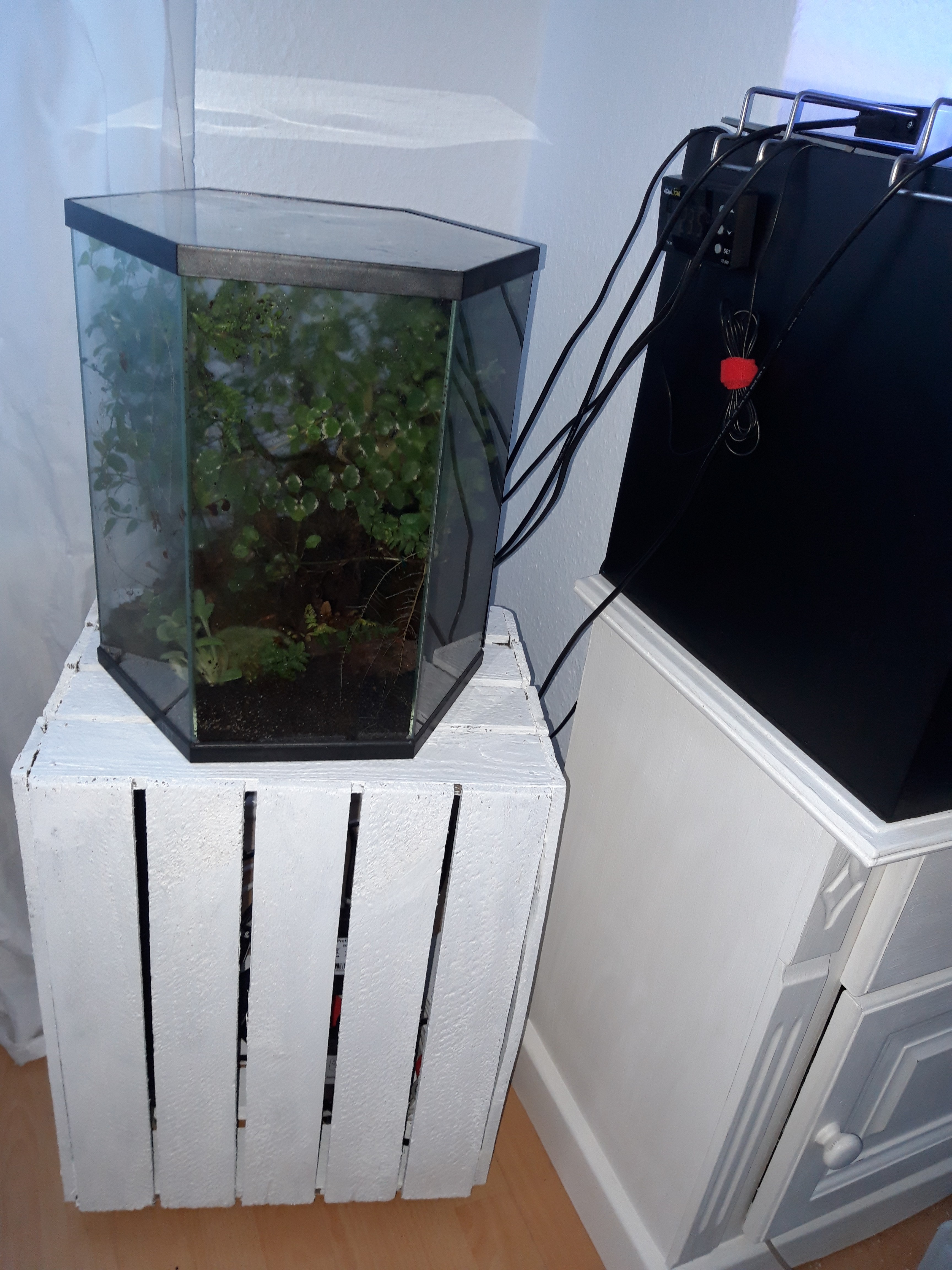 • Das Glas ging mir auf den Senkel, durch den gewölbten Boden ist der Aufbau immer wieder verrutscht :cursing: Ich habe das zwar schon so gemörtelt, dass das nicht passieren sollte, war dem Glas aber egal. Also hatte ich etwas weiter gekruscht :lachen: Und tadaa, es fand sich noch ein olles 30x20x20-Aquarium im Schrank, transparent verklebt.