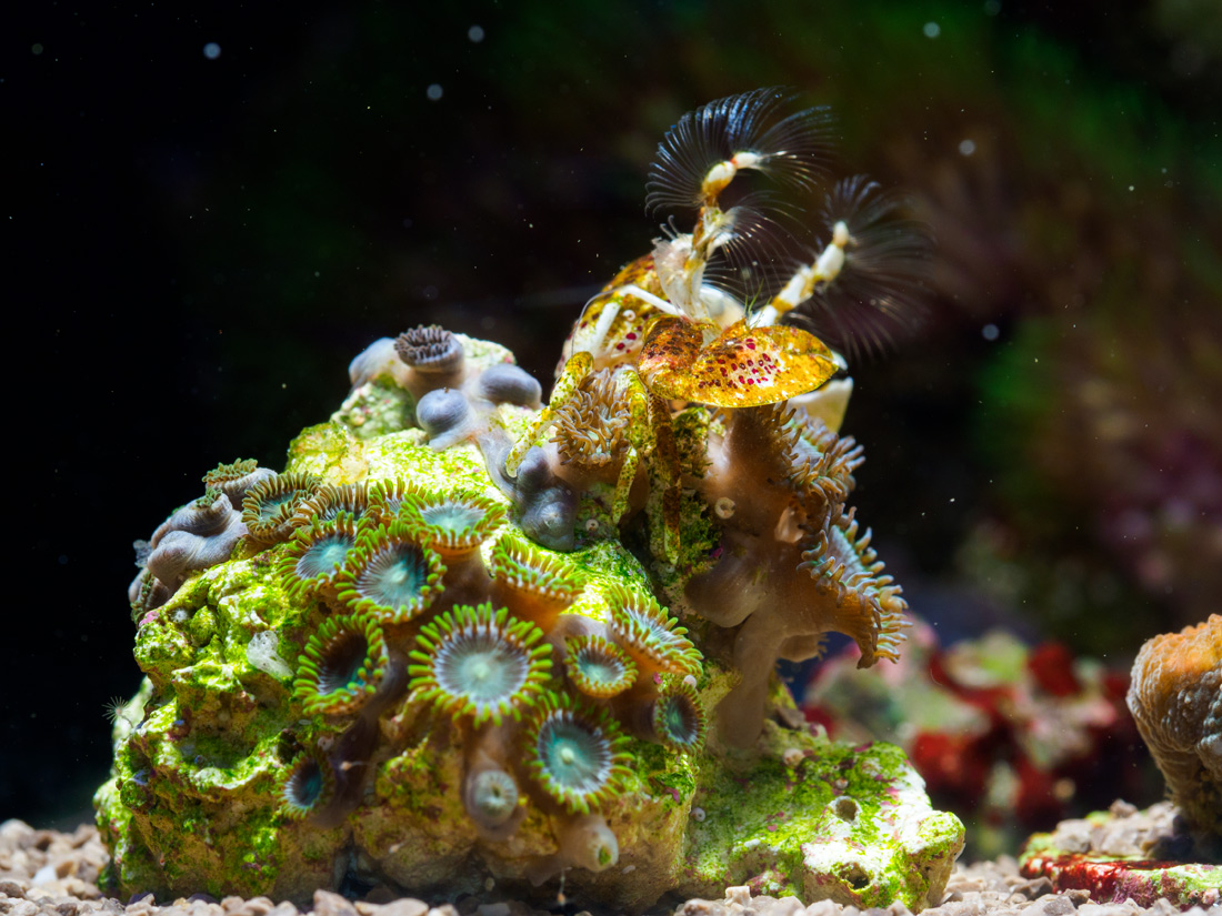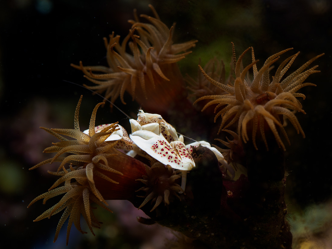 Der Porzellankrebs ist eh eine Wanderdüne. In seinen Anemonen sitzt er am wenigsten, meist knautscht er irgendwelche anderen Korallen