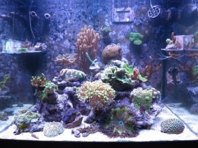 Anfänglich hatte ich überwiegend Scheiben-, Krustenanemonen, Weich- und Röhrenkorallen. Diese habe ich dann mit abnehmendem Nährstoffgehalt nach und nach durch LPS und dann auch SPS ersetzt, bis zu dem heutigen Bild. Die Blaue Xenia ist bei mir ein invasiver Plagegeist!