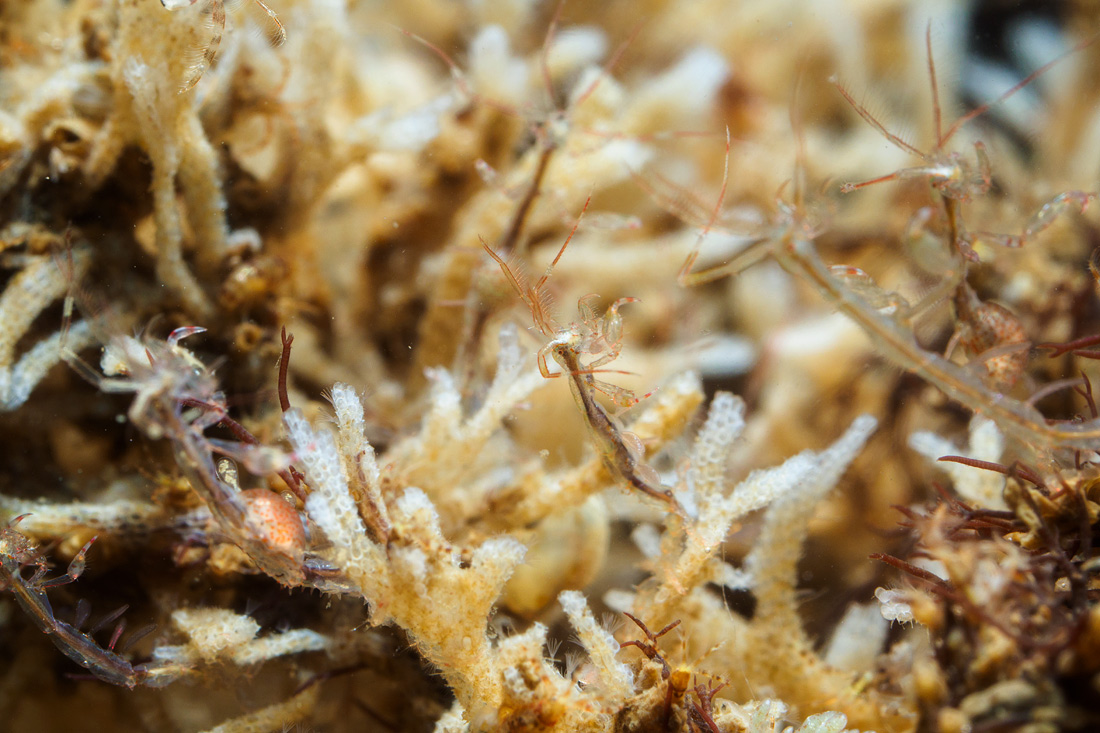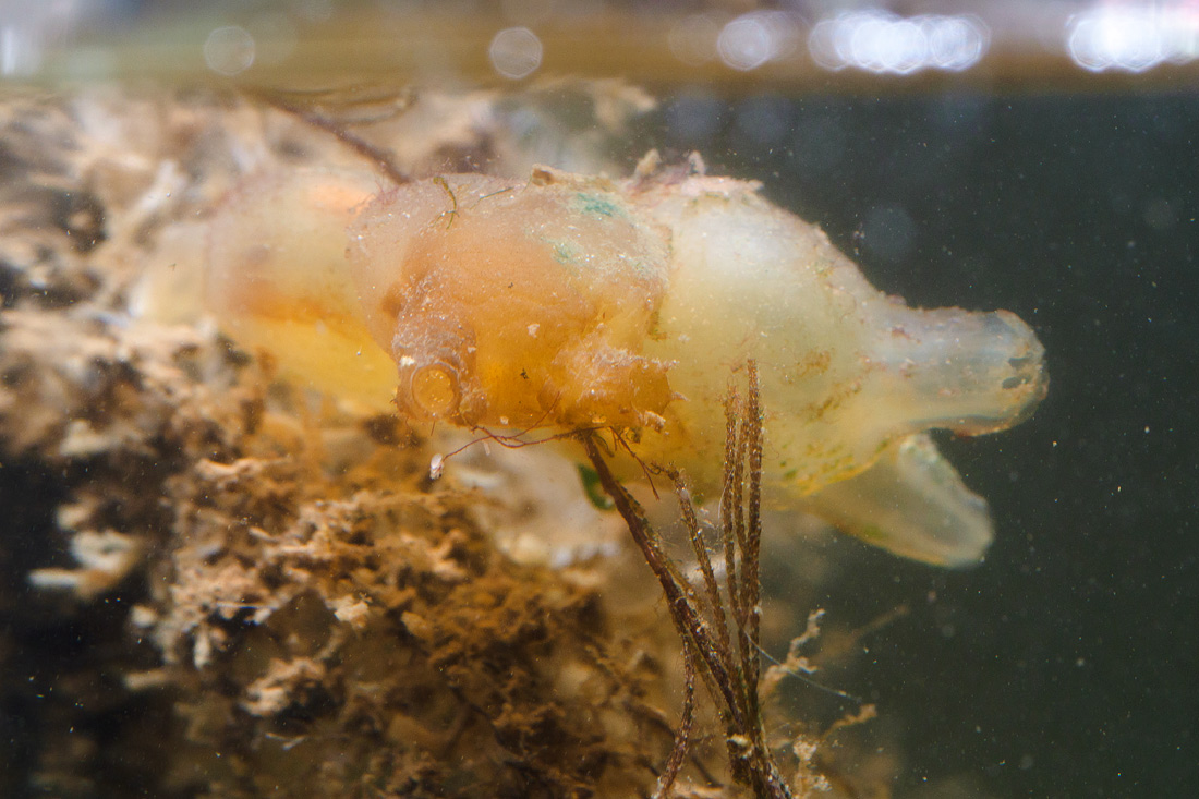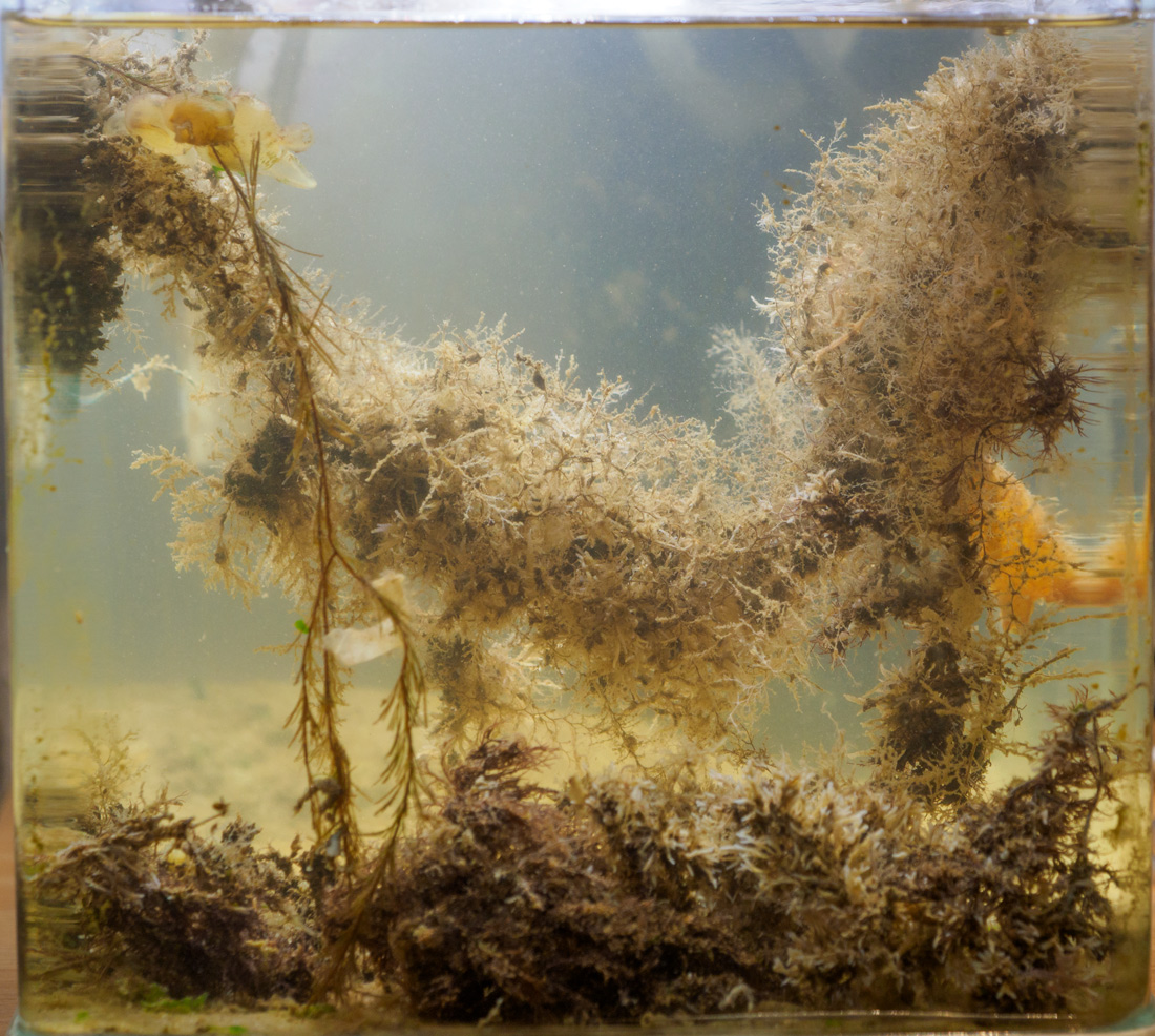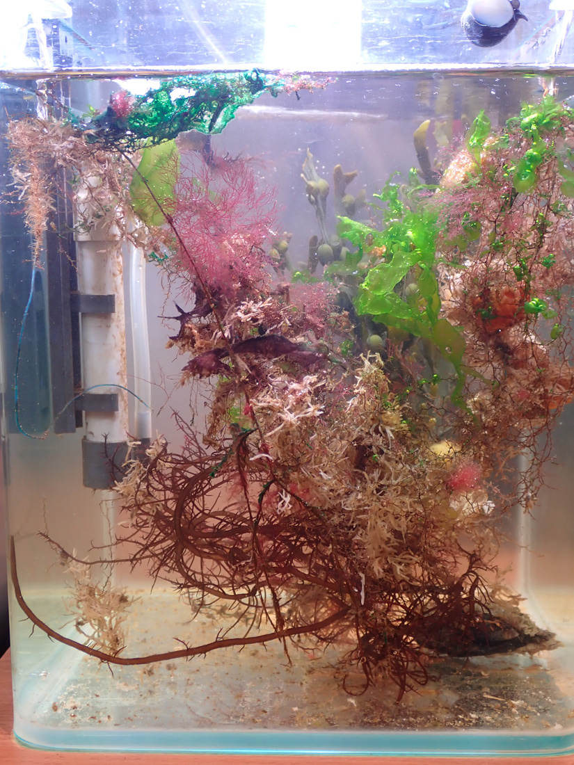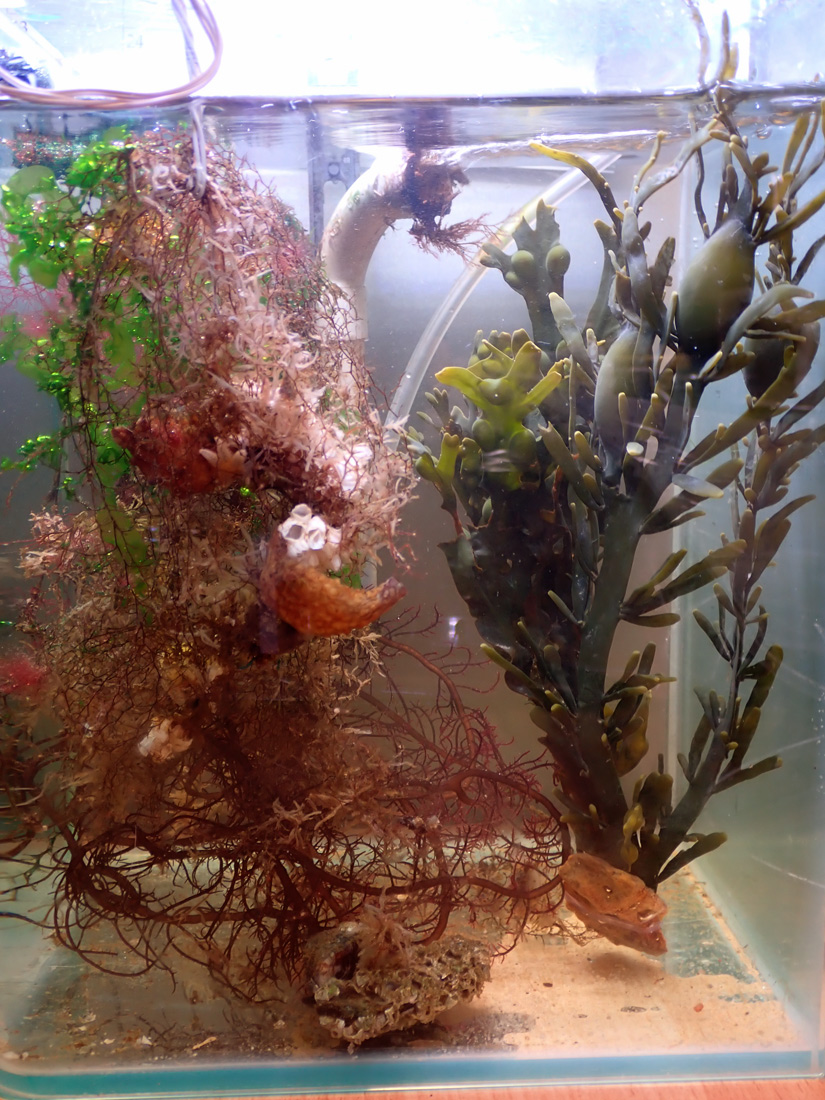 ). Darin wohnen jedemenge Gespenstkrebschen und Sichelflohkrebschen. Eine japanische Keulenseescheide (Styela clava) ist auch mit dabei (das gelblich-orange-farbene Dings rechts in Richtung Seitenscheibe).