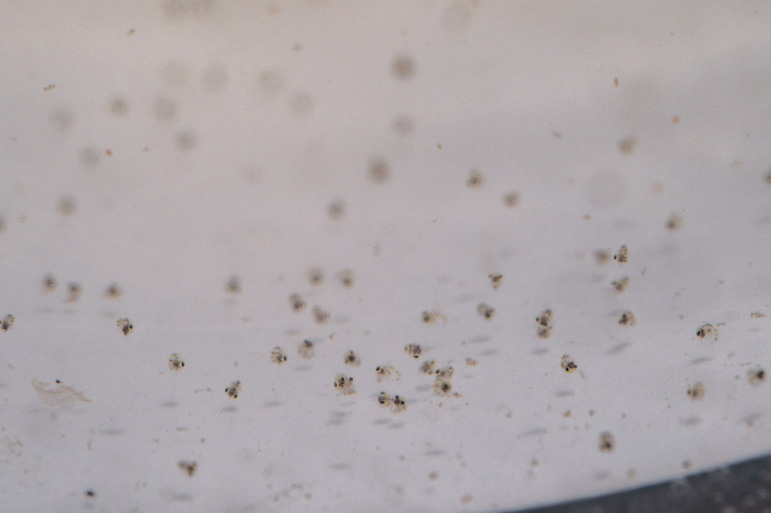 Da die Larven nicht so gut in der Wassersäule blieben und sich oft am Boden niedergelassen haben, habe ich sie in einen ungeheizten Kreisel (~17-18°) gesetzt. Zu Fressen gibt's erst mal Brachionus und ab heute abend auch ein paar frisch geschlüpfte AF430. In einem Bericht stand drin nur Nauplien, in einem anderen anfangs Brachionus und dann Nauplien. Die Larven sind recht winzig, immerhin passten ca. 400-500 davon unter die Bauchklappe einer Krabbe mit 12mm Carapaxbreite!
