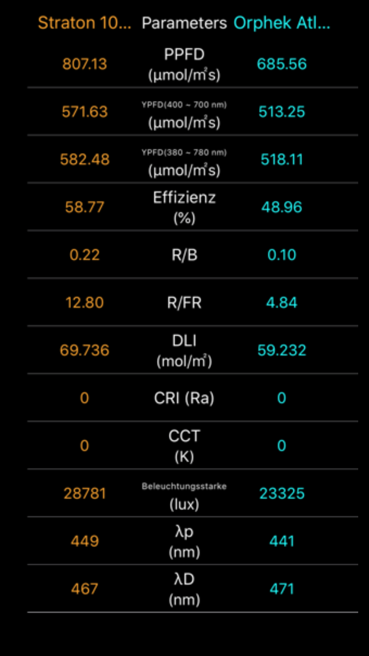 Als Vergleich, für die wo die VErgleiche nicht so im Kopf haben, liegt die Orphek Atlantik V4 mit einer Leistungsaufnahme von 212Watt bei ca. 700 µmol/m2/sec.