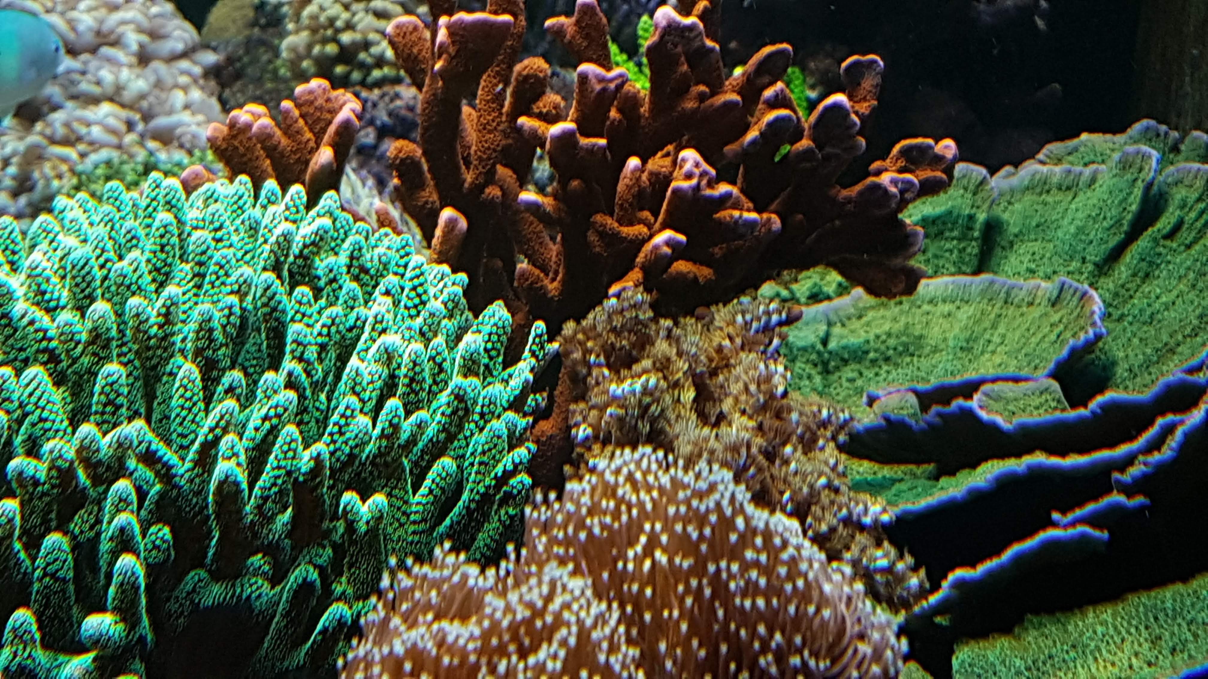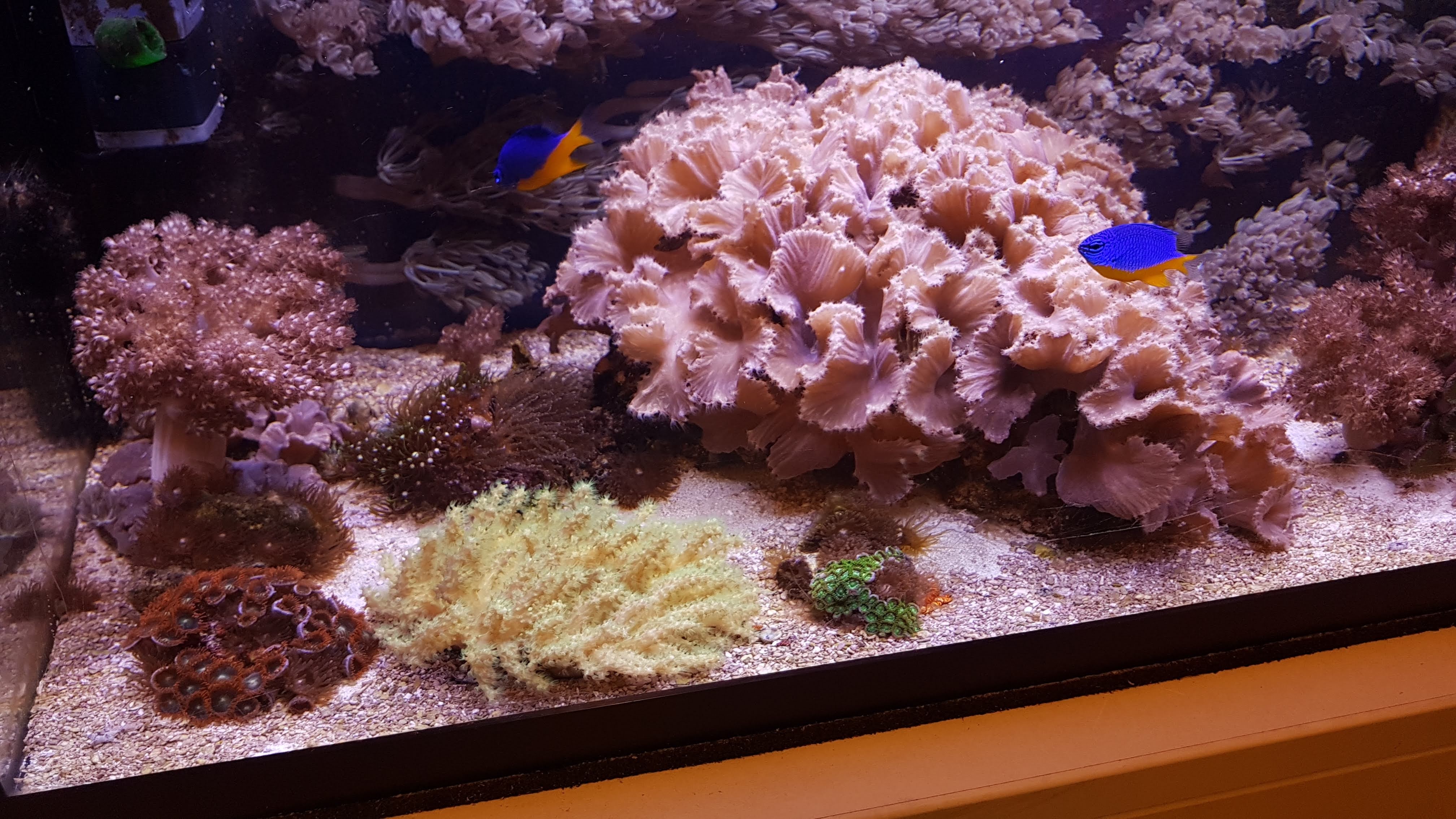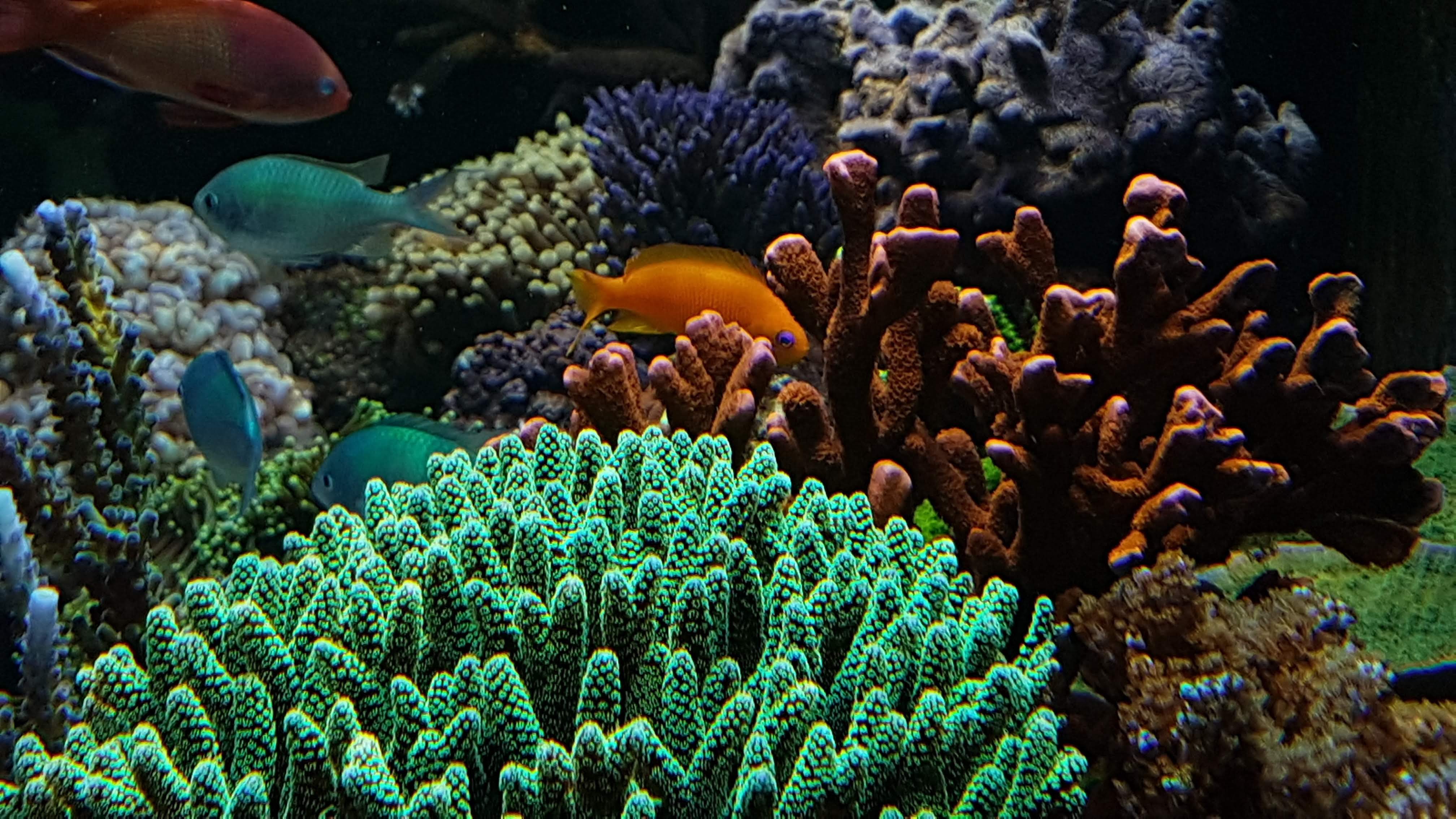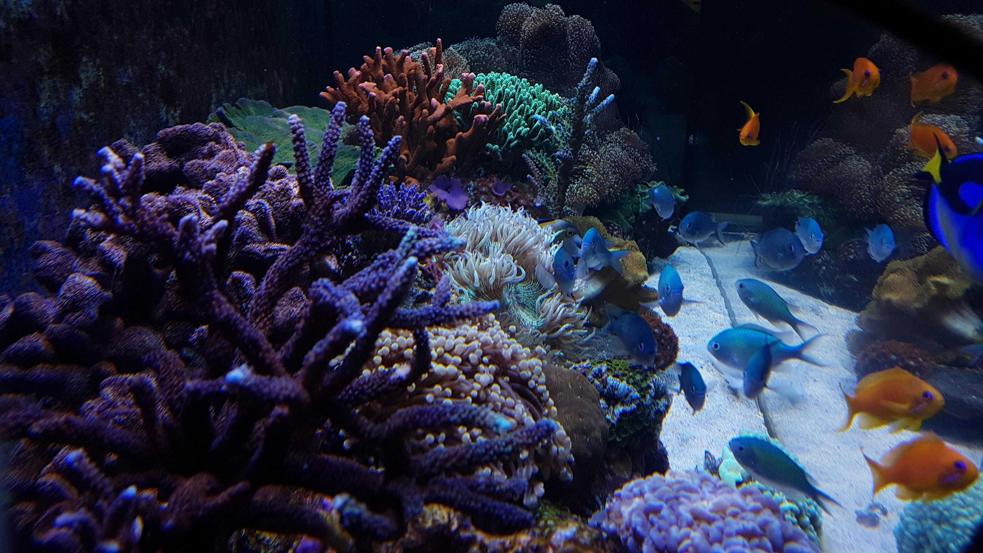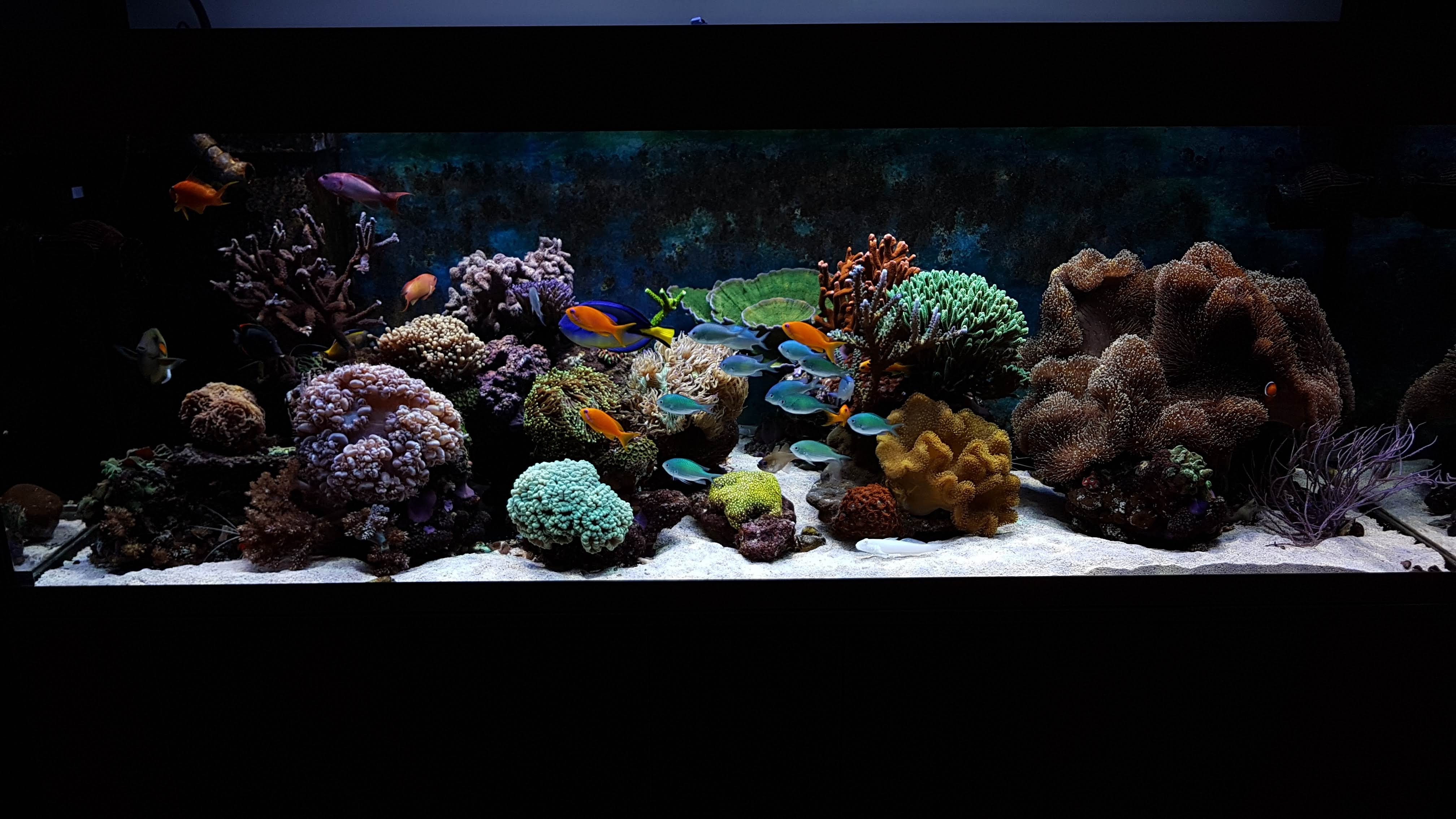 und das in Form von einem Korallenrückschnitt im linken Bereich des Aquarium. Es ist wirklich erstaunlich wie Korallen wachsen können und das in nun gerade mal 1 1/2 Jahren. Entschlossen haben wir uns das in angriff zunehmen weil sich die grüne und rote Montipora so massiv ins Riff gedrückt haben das es schon zu ziemlichen massiven Vernesselungen durch z.b. der Schmuckkoralle gab und wir hatten das Gefühl da muss was passieren. Wir haben fast alles was wir geerntet haben mit unserem Freund und Händler zu Ablegern verarbeitet und alles steht zum Verkauf in seinem Laden. Ich kann euch sagen das die ganze Aktion einen ganzen Tag gedauert hat, allein die ganzen Montiplatten Essteller gros da im guten rauszubekommen war schon eine Herausforderung. Schade ist nur das wir von den einzelnen Korallen keine Bilder gemacht haben, naja aber wenigstens vorher und nachher Bilder :thumbup:
