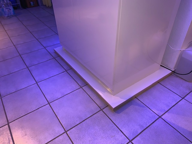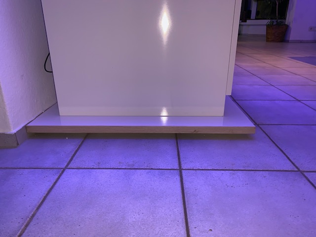 Darunter wurden (über die Fläche des Aquariums herausragend) Styrodurplatten verlegt. So wurde dem Aquarium eine ebene Auflagefläche geschaffen und, durch die Eigenschaften des Styrodurs, wurden die Unebenheiten "weggeschluckt". Die Holzplatte auf der das Aquarium steht scheint nun über dem Boden zu "schweben".