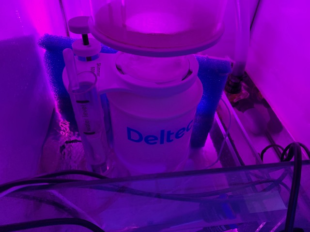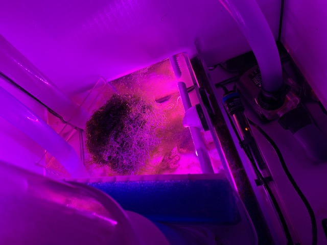 Im Technikbecken habe ich mittels Lichtrasterplatte und einer, mit Kabelbindern daran befestigten, Filtermatte, ein Abteil für ein kleines Algenrefugium abgegrenzt.
