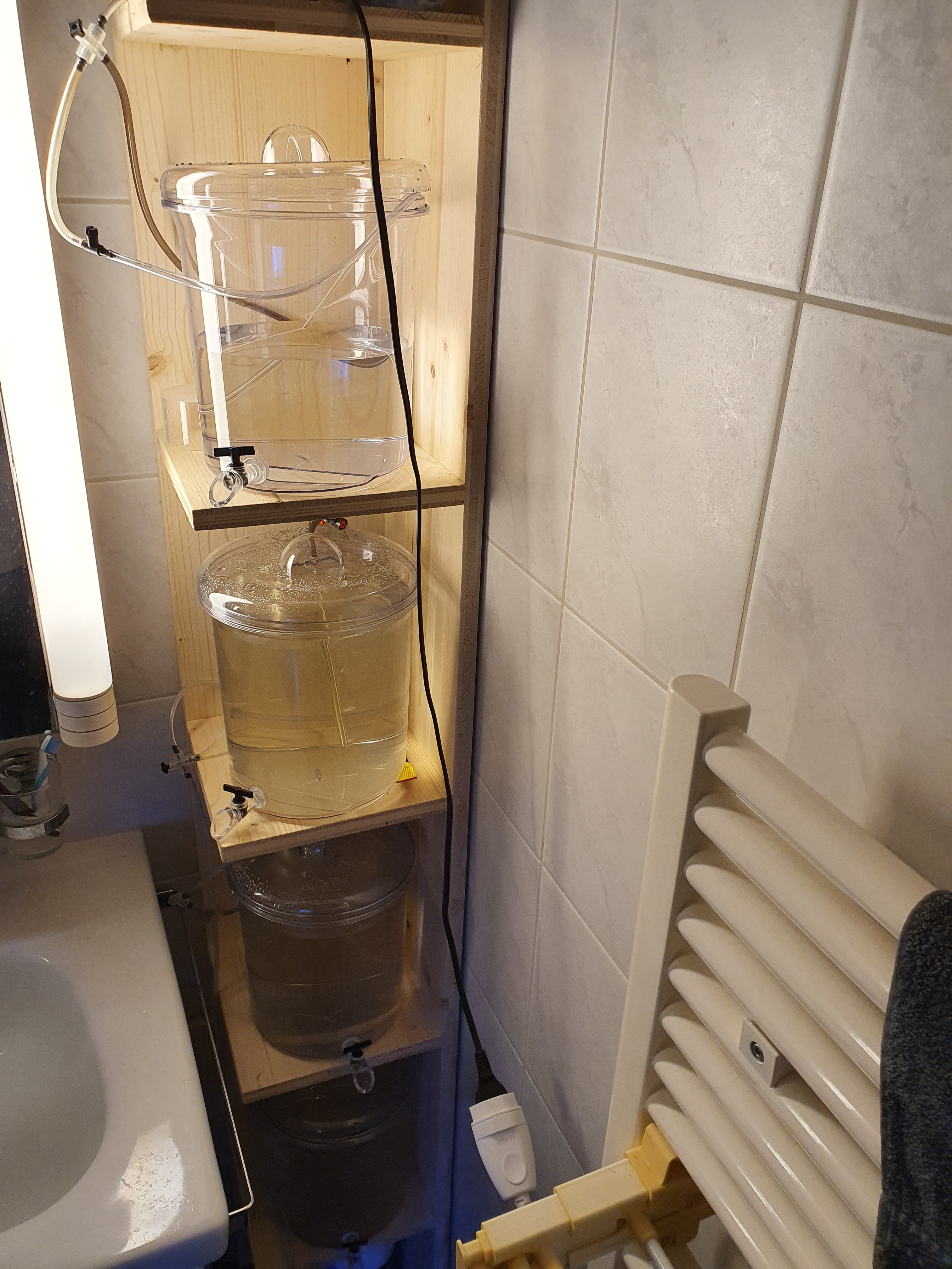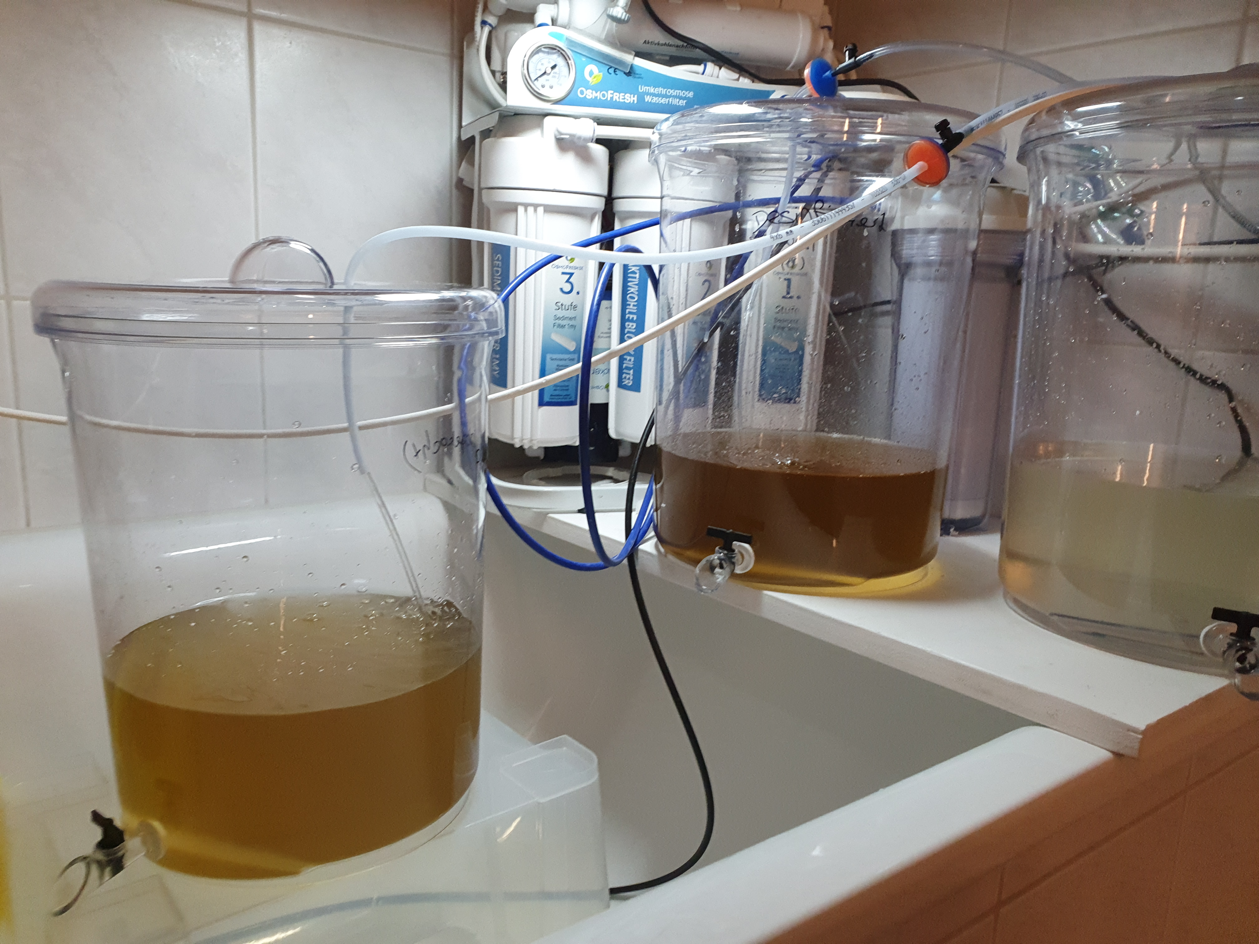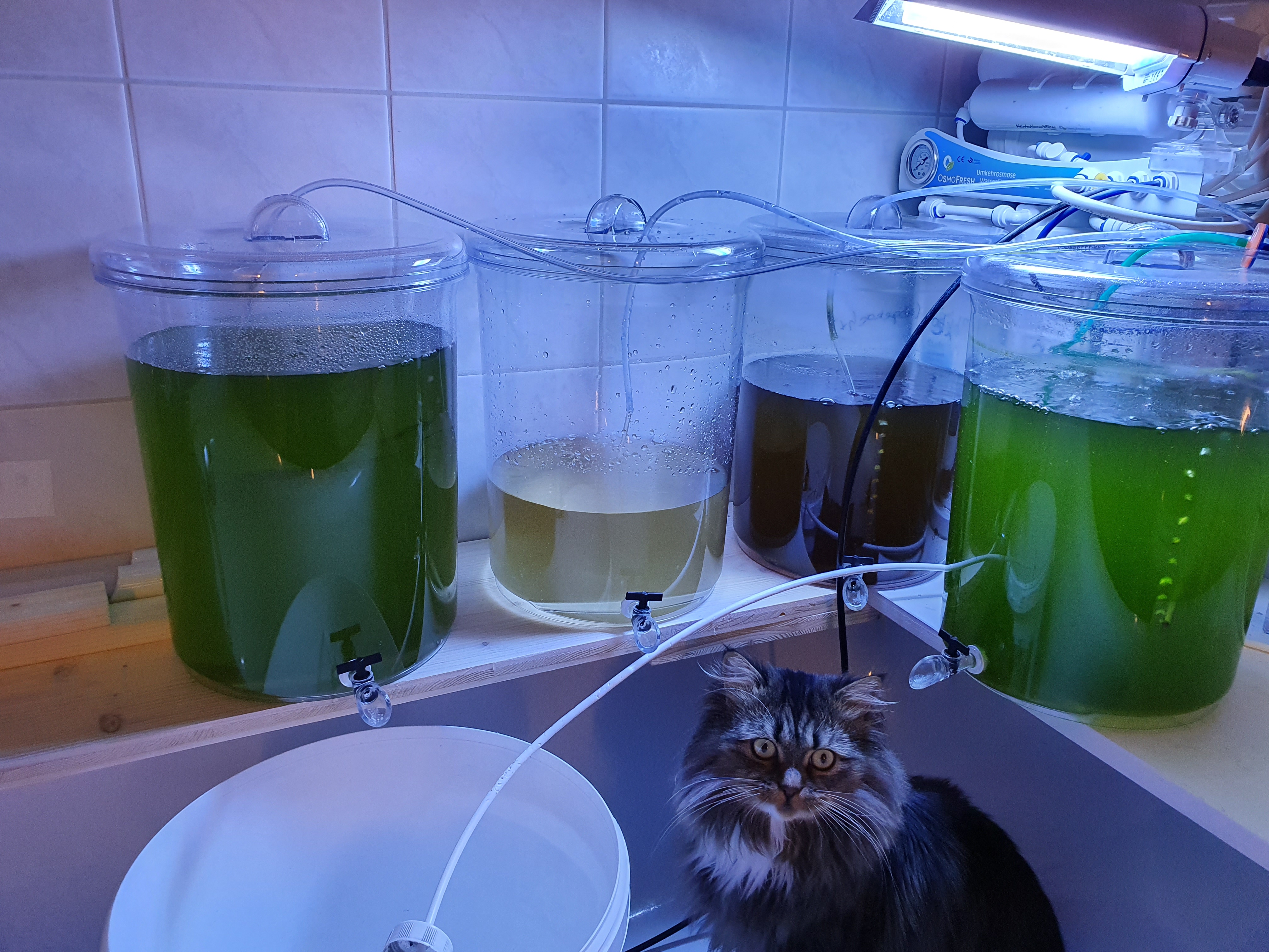 Anbei noch ein Bild des Setups. In den beiden linken Gefässen ist das Isochrysis und im Behälter ganz rechts sind die Parvos drin. Im Filmchen seht ihr, wie stark ich die Parvos belüfte.