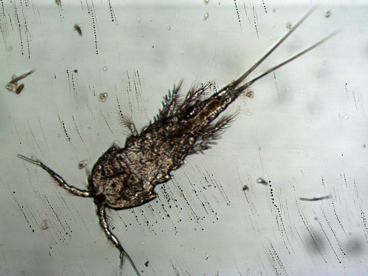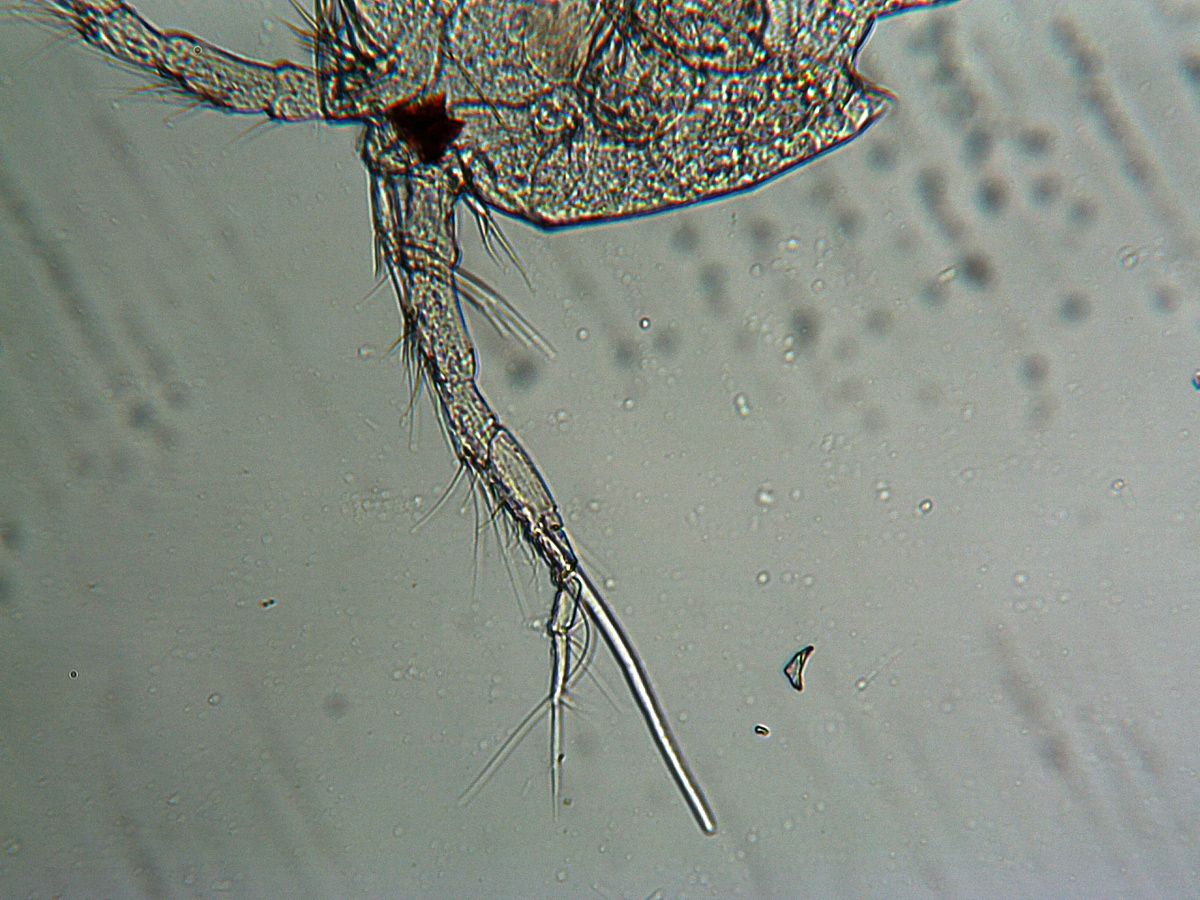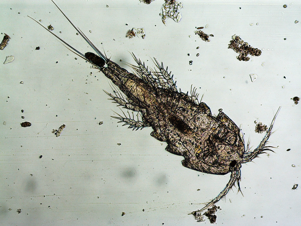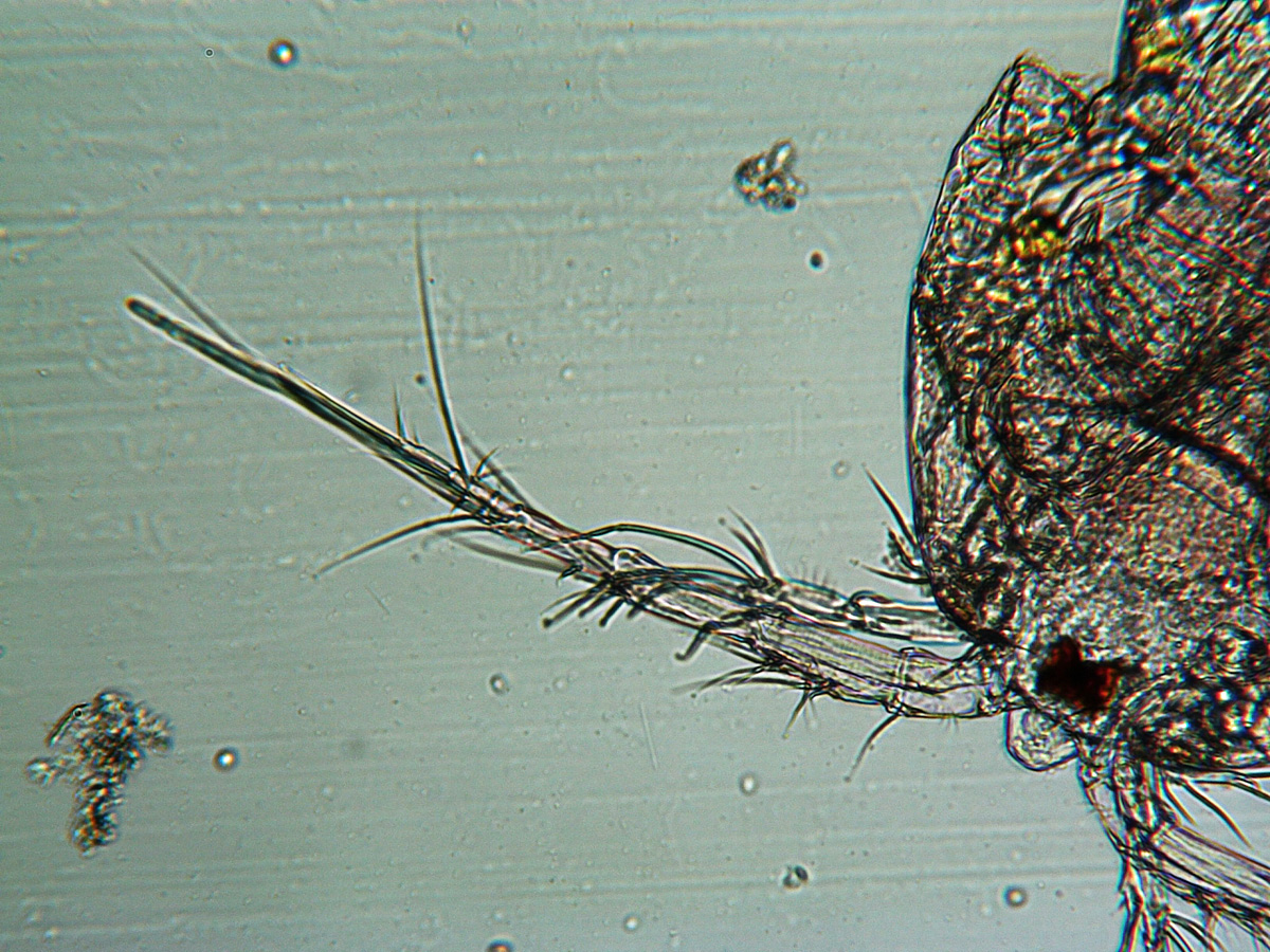 Was süß war, unter dem Abdeckgläschen wuselte eine Copepodennauplie herum. Erst als sie die Exuvie einer Krabbenlarve gefunden hatte, hielt sie mal Ruhe für ein Foto. Der Ausschnitt ist ca. 300µm breit.