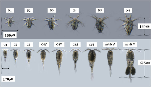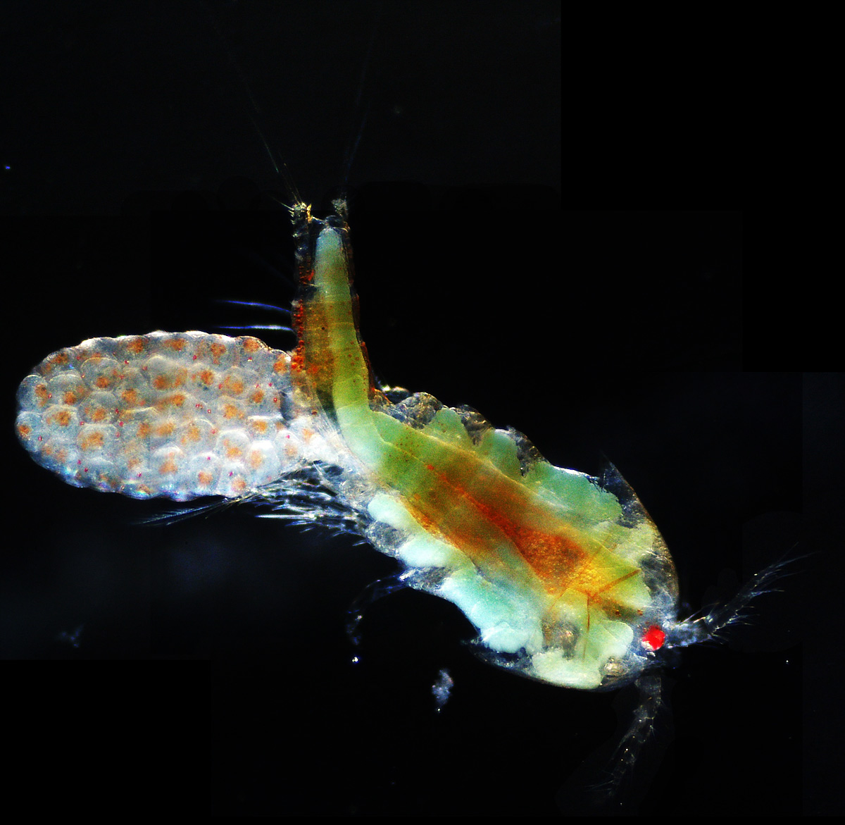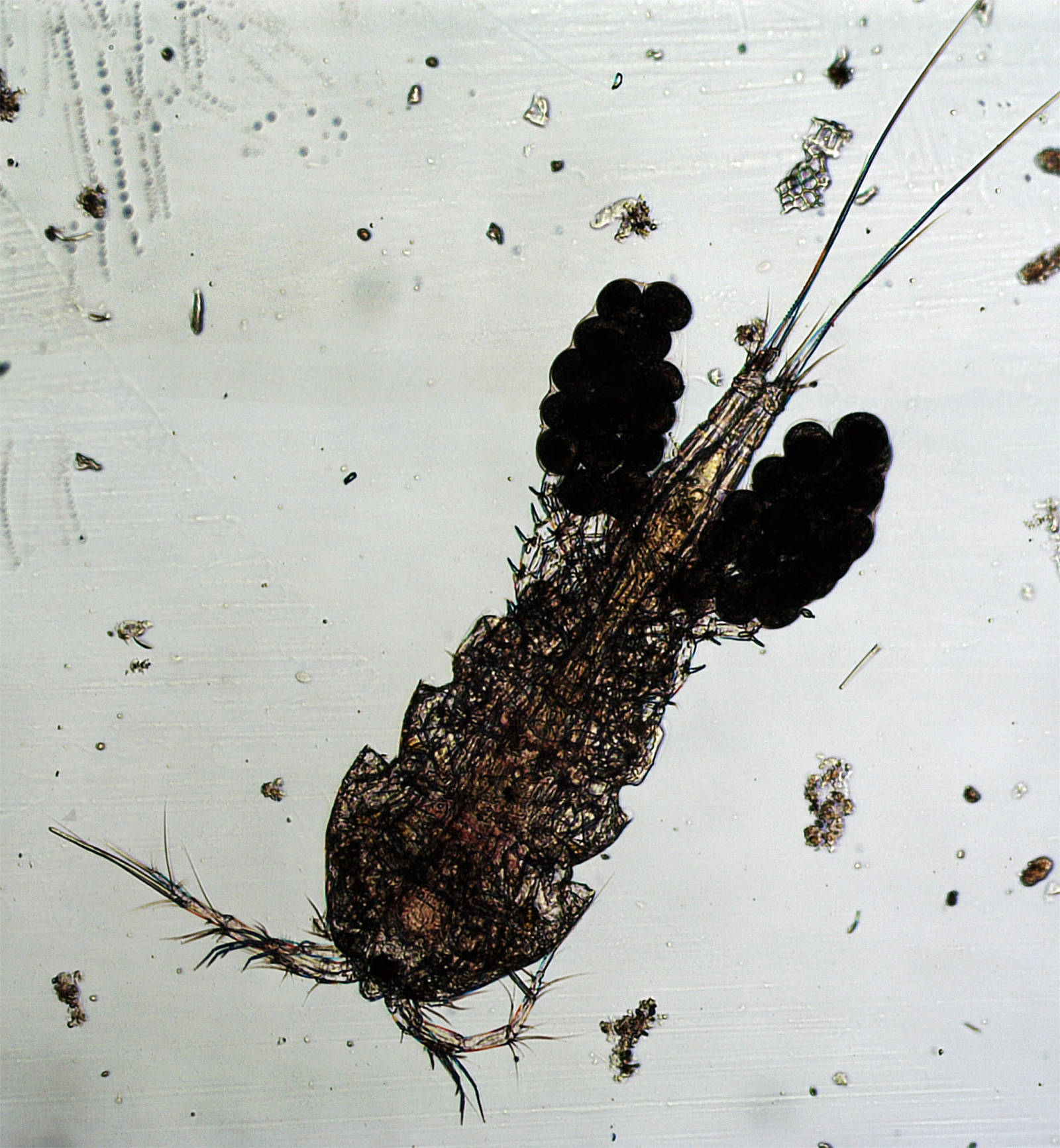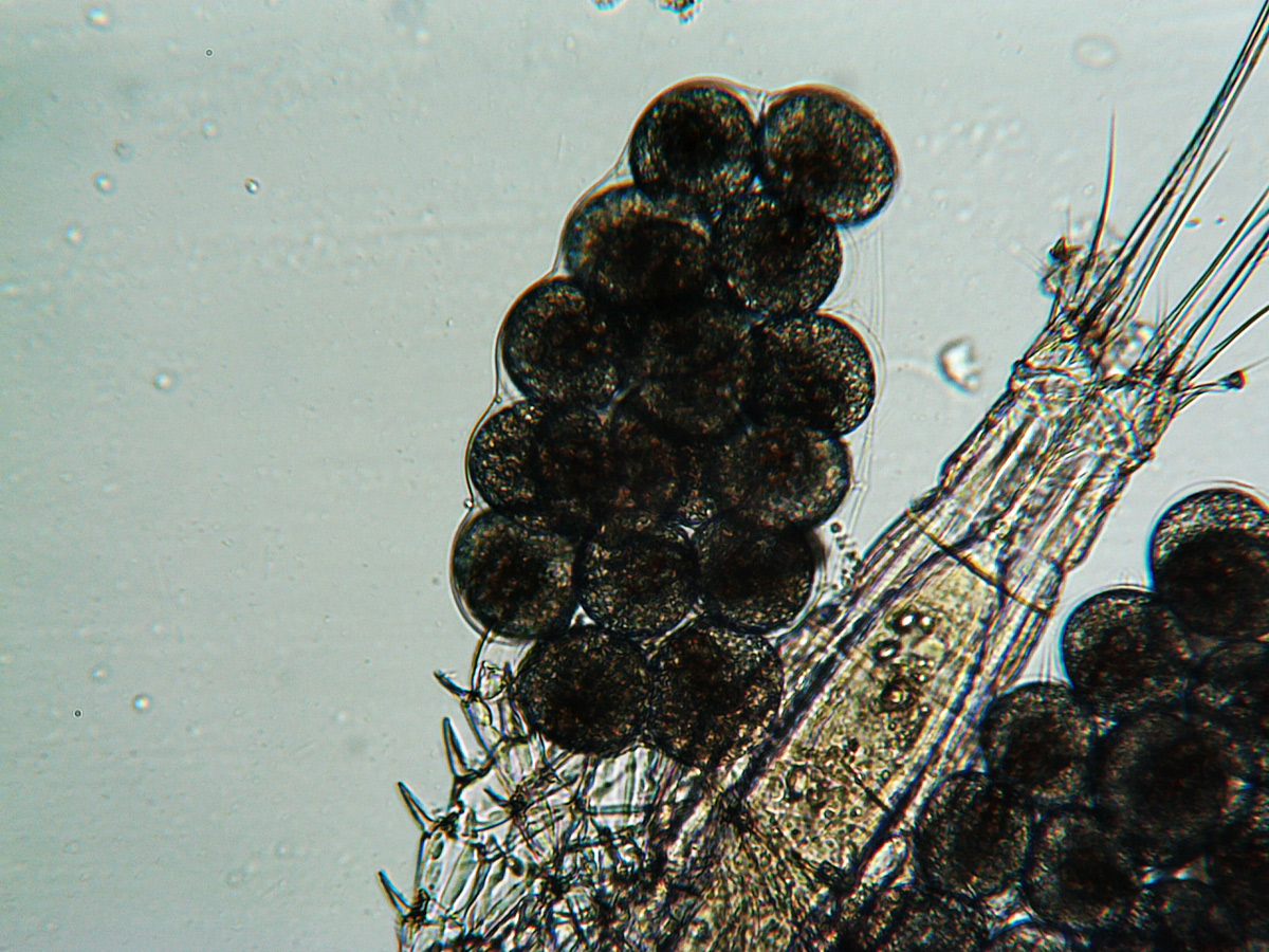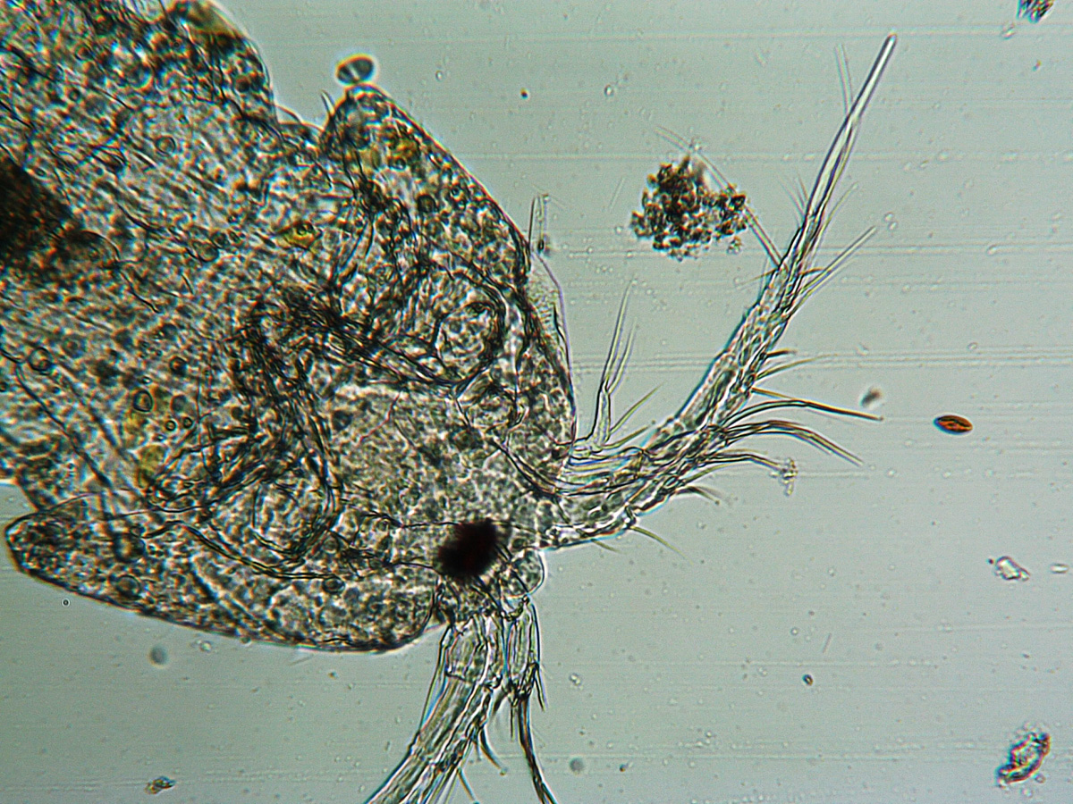 Was süß war, unter dem Abdeckgläschen wuselte eine Copepodennauplie herum. Erst als sie die Exuvie einer Krabbenlarve gefunden hatte, hielt sie mal Ruhe für ein Foto. Der Ausschnitt ist ca. 300µm breit.