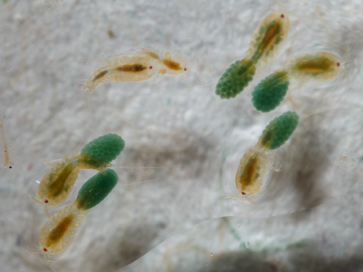 Könnten das Tiggerpods sein?Sie sind mit bloßem Auge als zweifarbig zu erkennen, sind aber kleiner als die Cops, die ich die ganze Zeit als Tiggerpods hatte. Die fotografierten Mädels sind max. 1,3-1,5mm lang (samt Eipaket).