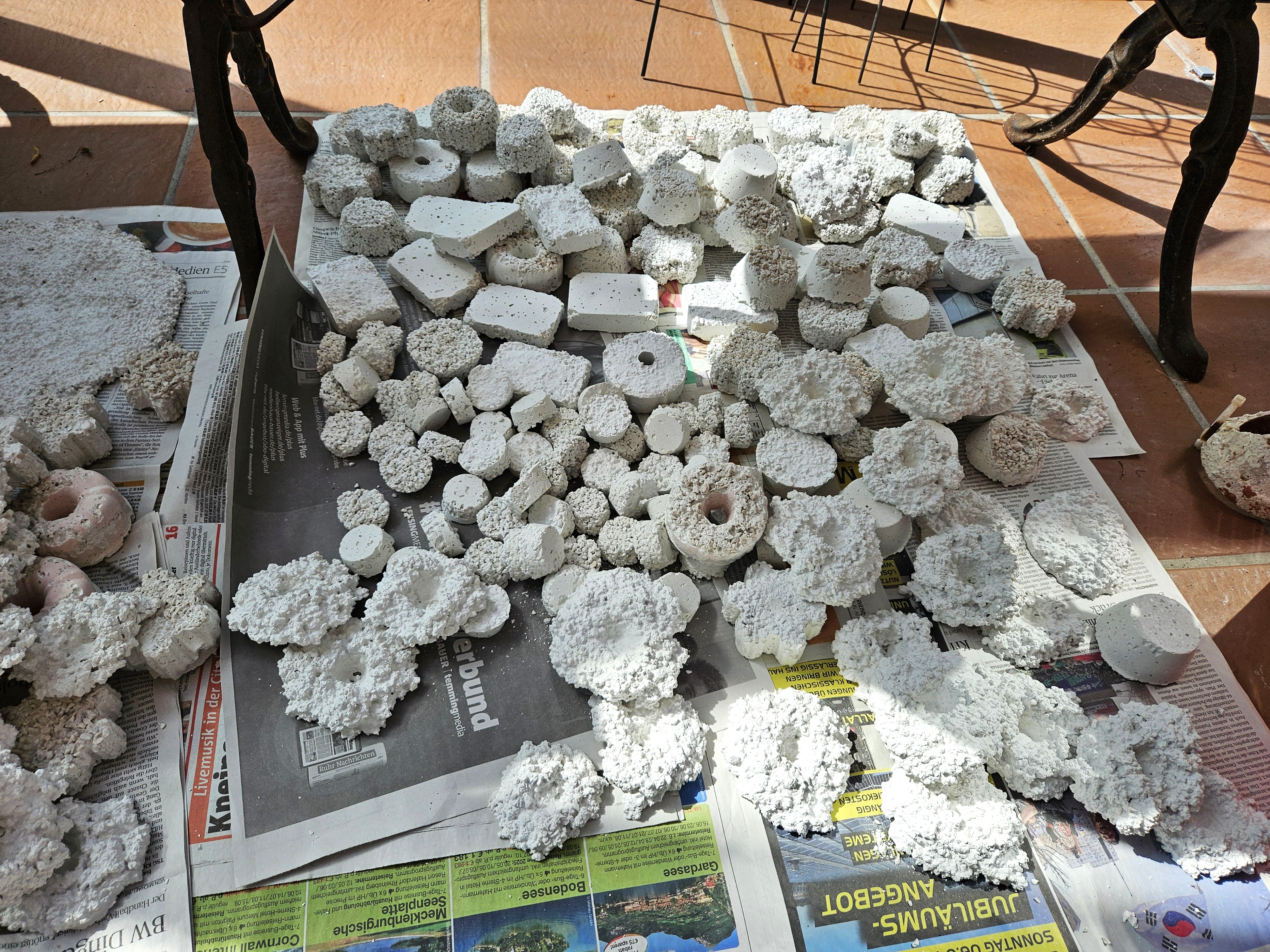 Das Rezept für die Steine ist ca. 250 ml Korallensand und 100 ml Weisszement.