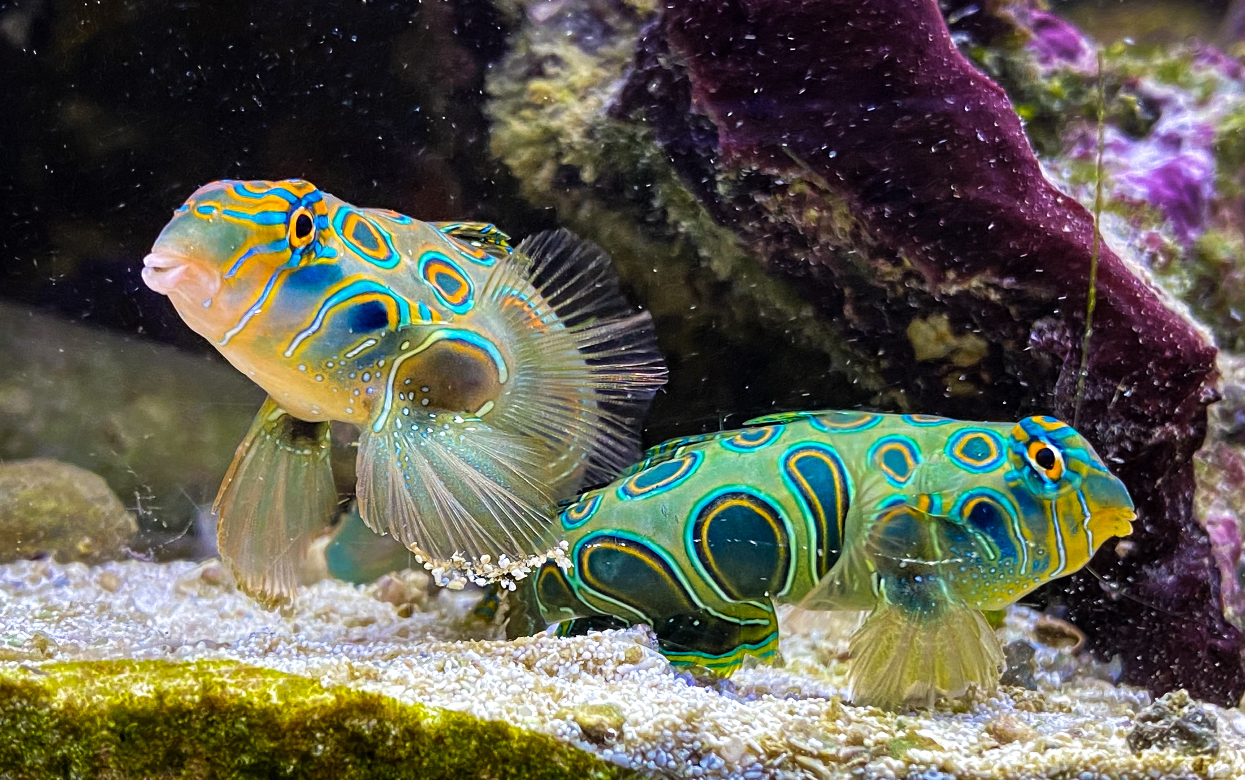 Ich habe das Männchen in ein größeres Becken getan, wo es sich gut akklimatisiert hat. Es hat sowohl Frost-Artemien gefressen als auch im Becken rumgepickt.