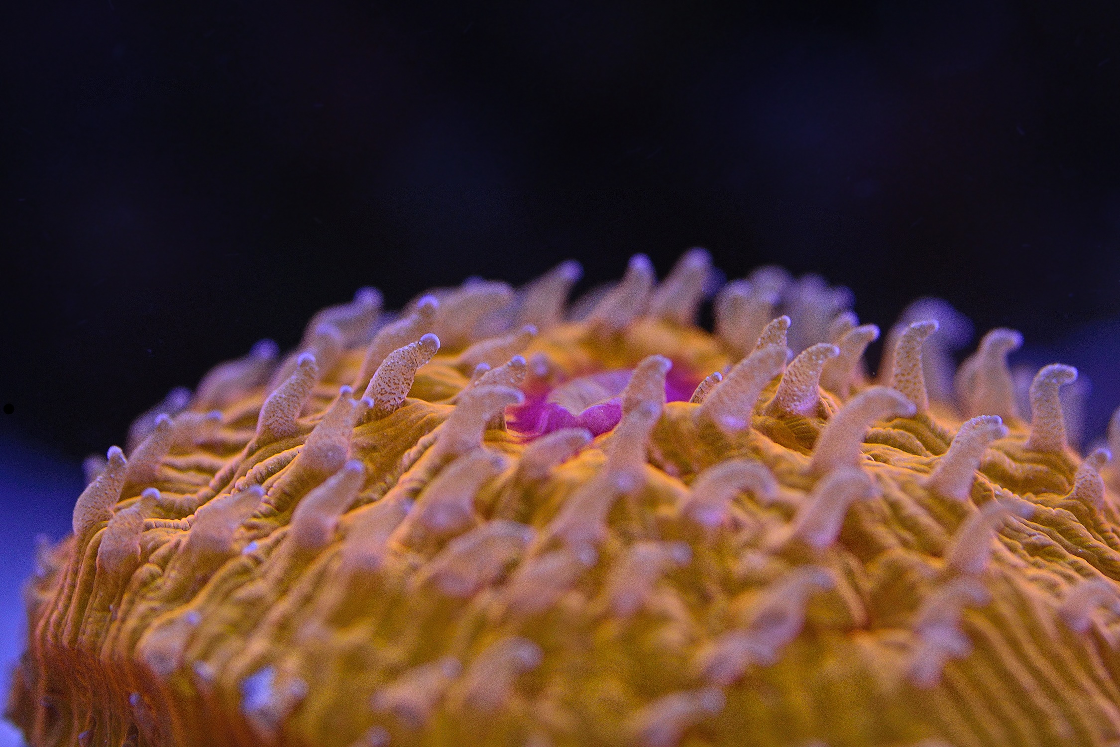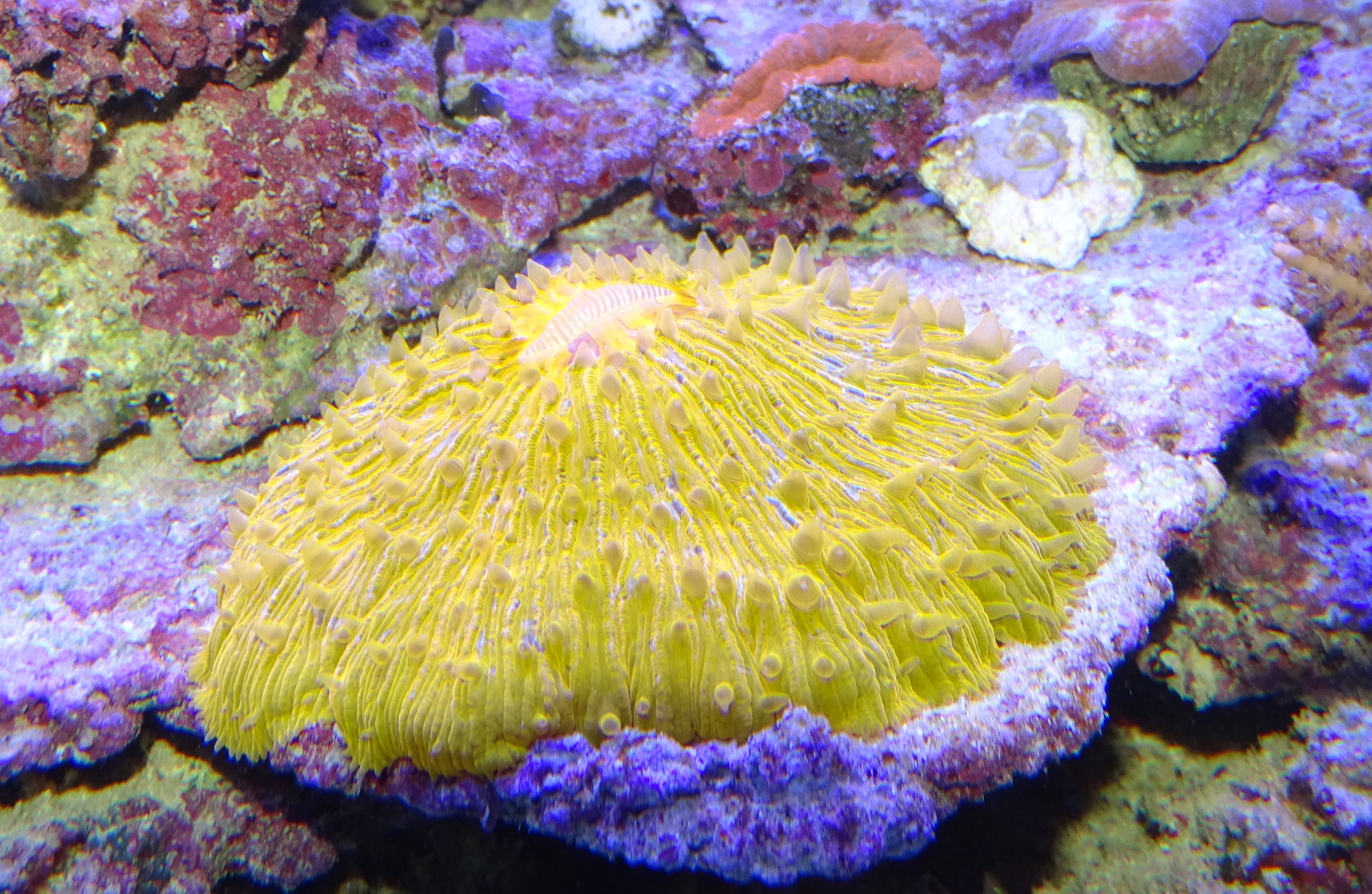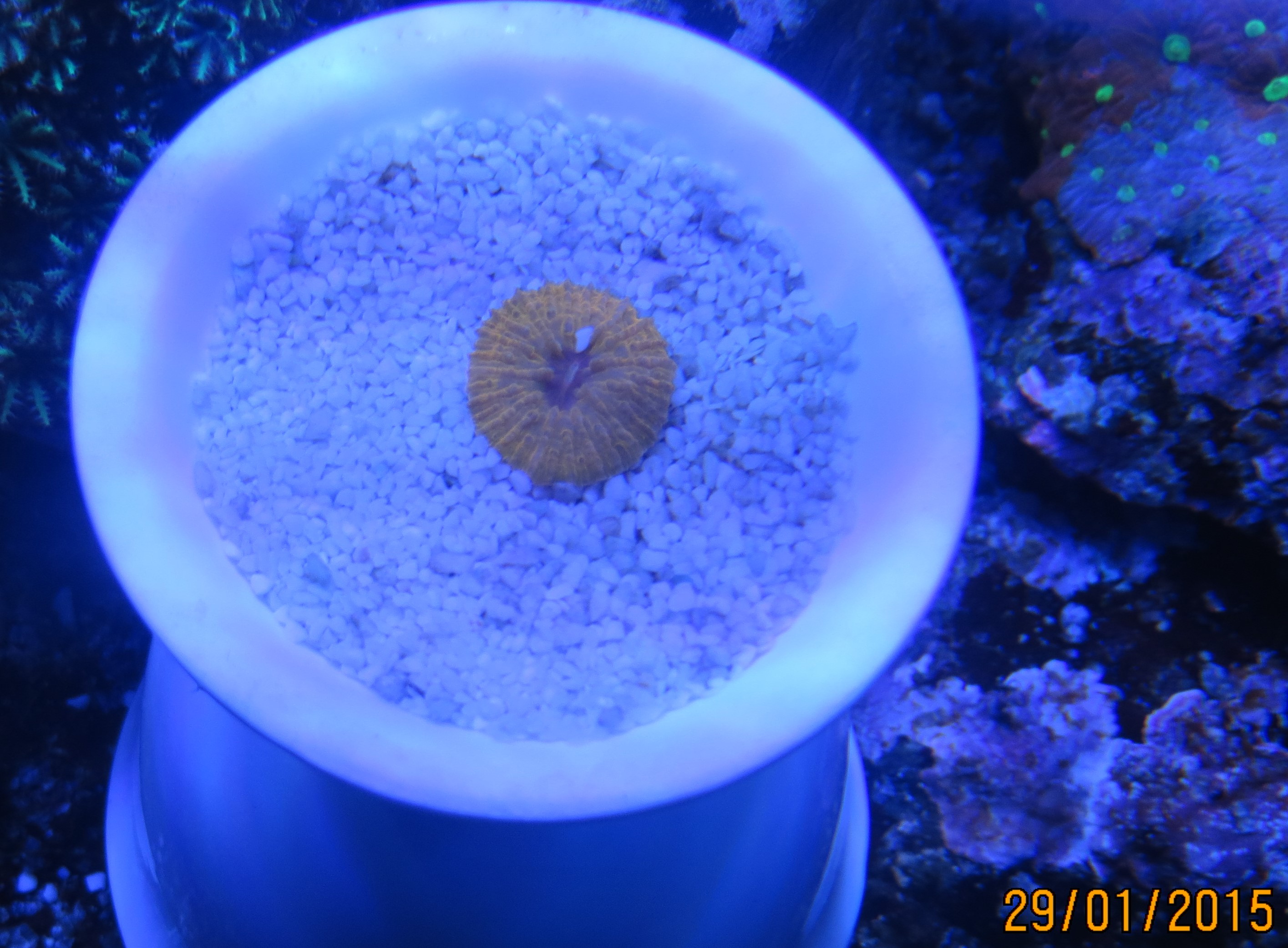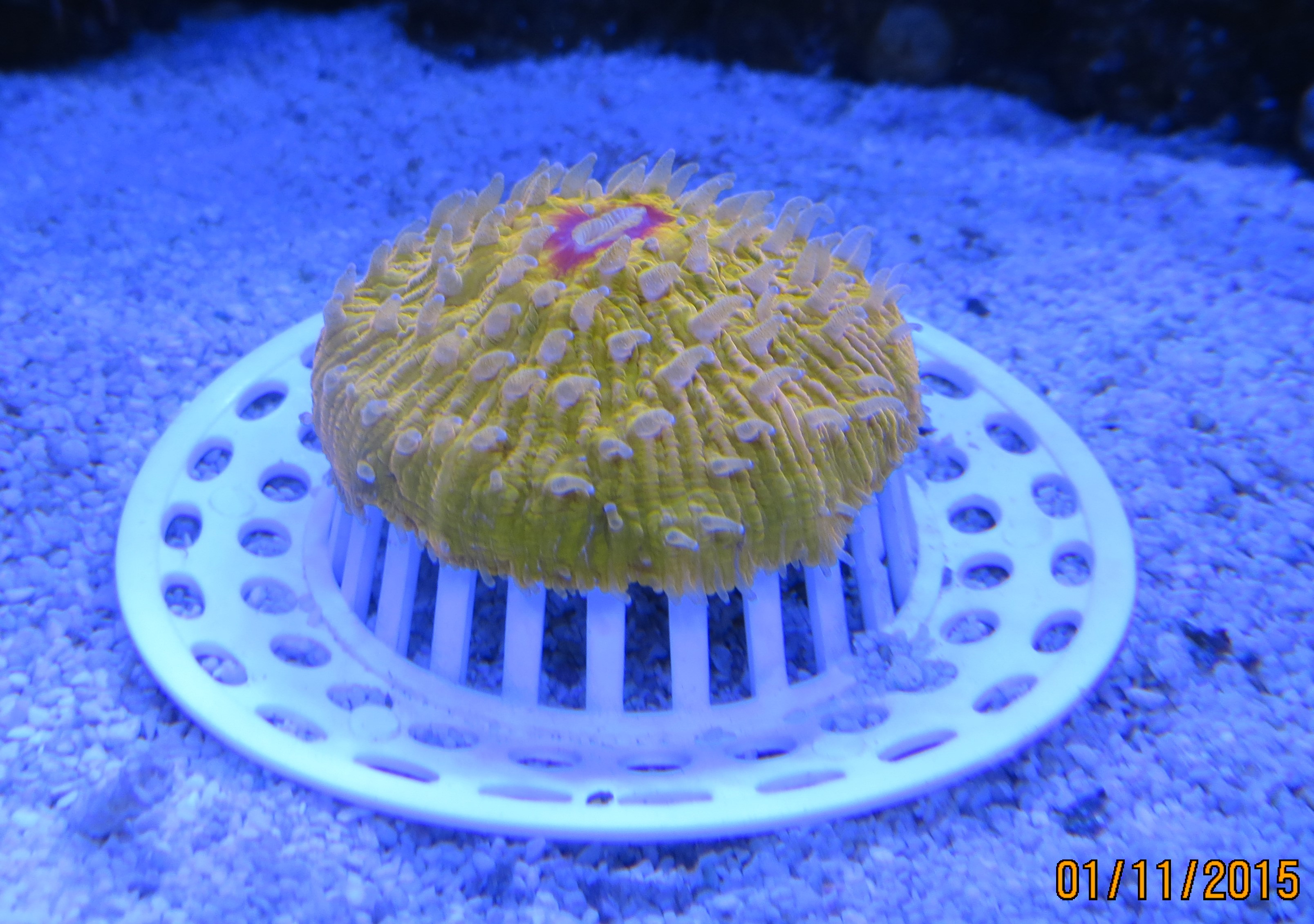 Kauf einer mini Fungia im Januar 2015 mit besonders schöner Farbe. Ein besonders leuchtendes Orange mit einem roten Mund.