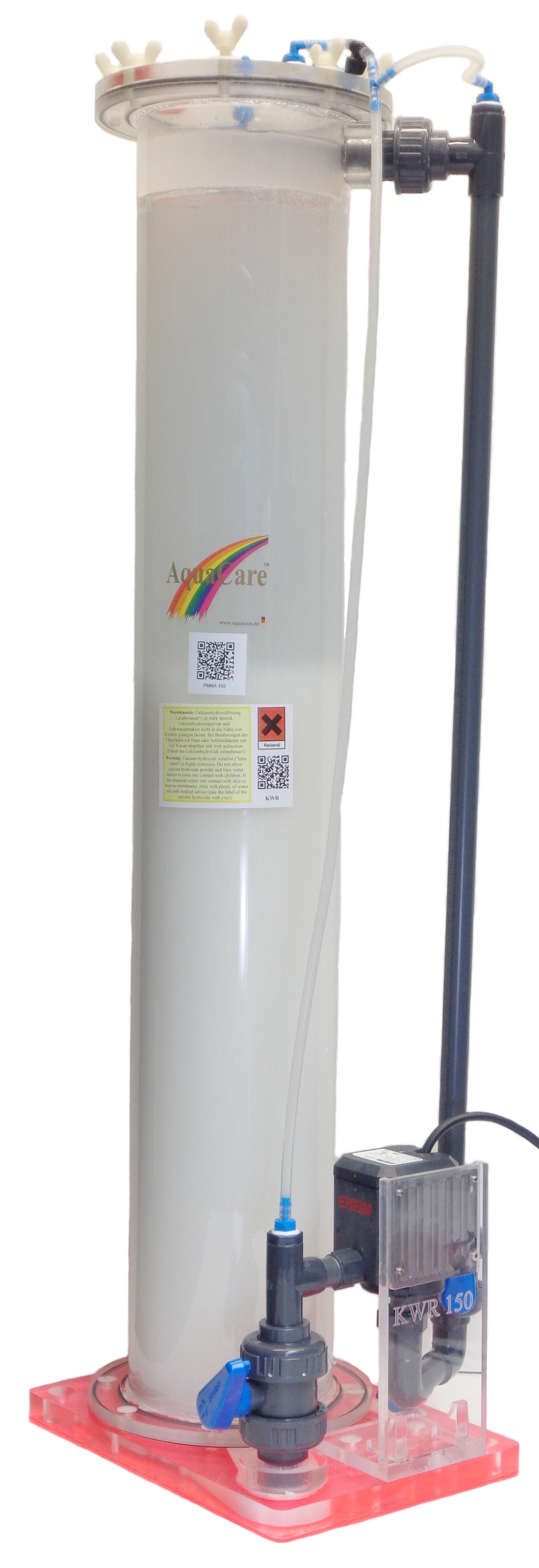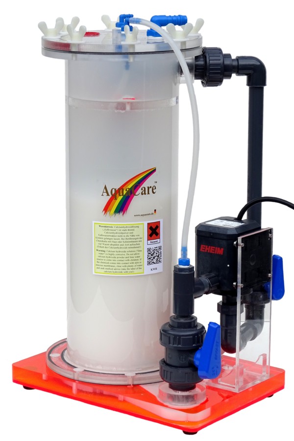 In sogenannten Kalkwasserreaktoren wird eine größere Menge Calciumhydroxid als sogenannte Kalkmilch in Schwebe gehalten. Frisch zufließendes Umkehrosmosewasser* wird sofort mit Calciumhydroxid gesättigt und kann in das Aquarium dosiert werden. Vorteil: es wird wesentlich mehr Kalkwasser pro Calciumhydroxidfüllung hergestellt, als bei der manuellen Methode (bei AquaCare KWRs ca. 25mal mehr).