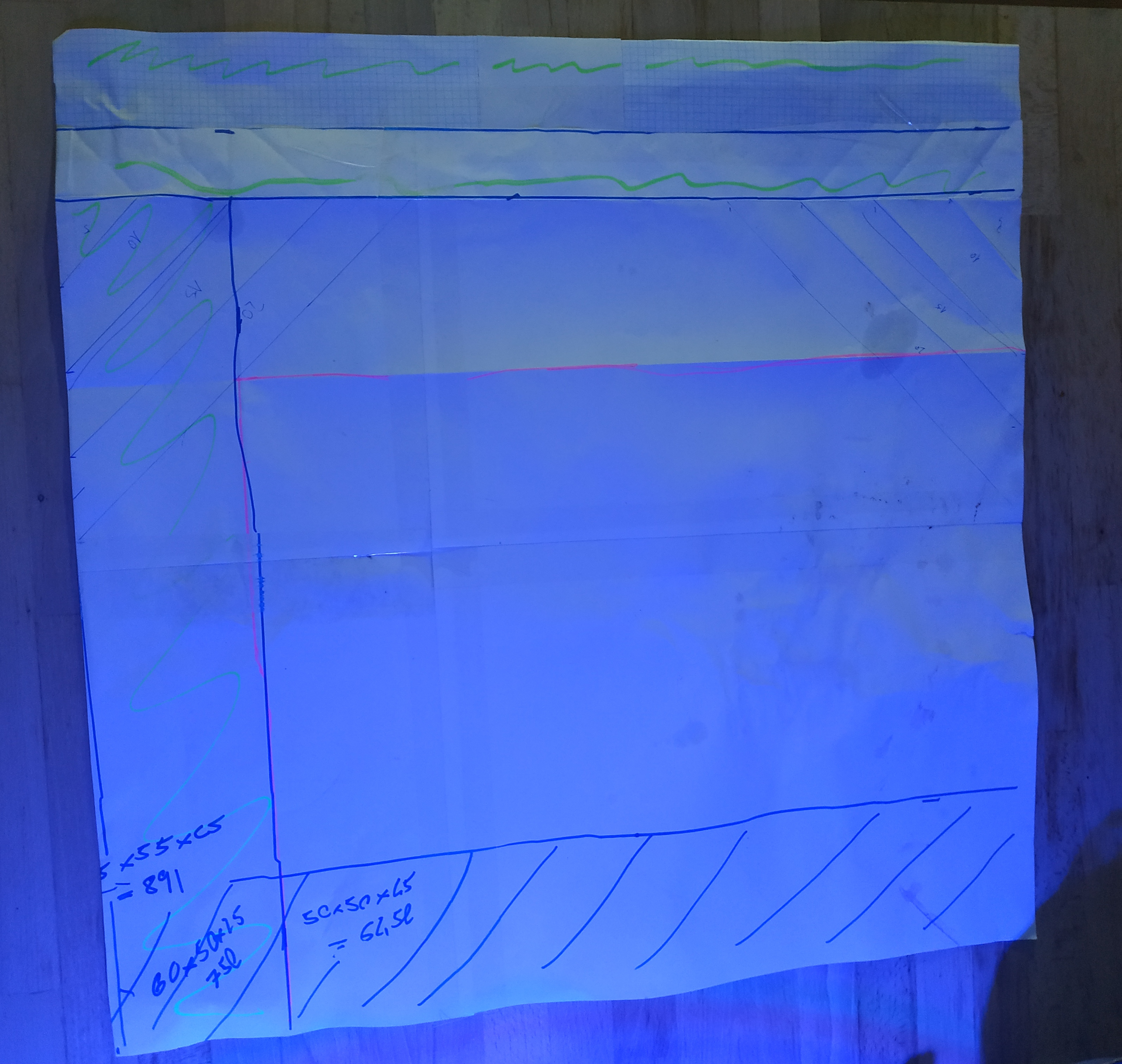 ) und viele viele mehr! Im Endeffekt war da aber nichts 100%iges dabei, deshalb lasse ich es mir bauen!Erst mal einen Plan aus ein paar Blättern gebaut und ein paar mal drüber geschlafen (sieht man an den Essens-/Aquarienputzflecken!). Heute Abend habe ich es nun endgültig finalisiert! Der Plan ist nun 60x60x28cm ~ 100,8l! Hinten eine Filterkammer rein, darauf will ich nachdem Nuvo einfach nicht mehr verzichten. Sie soll 8cm Breite haben und mit schwarzem Glas abgetrennt werden. Ich werde mir die Tage einen KVA erstellen lassen; mal schauen wie groß die Differenz ist, wenn ich die Front aus Weißglas nehme. Möglicherweise werde ich das Becken noch mit etwas Holz aufbocken, damit es nicht direkt auf dem Tisch steht, gefällt mir beim dem Nuvo auch sehr gut.