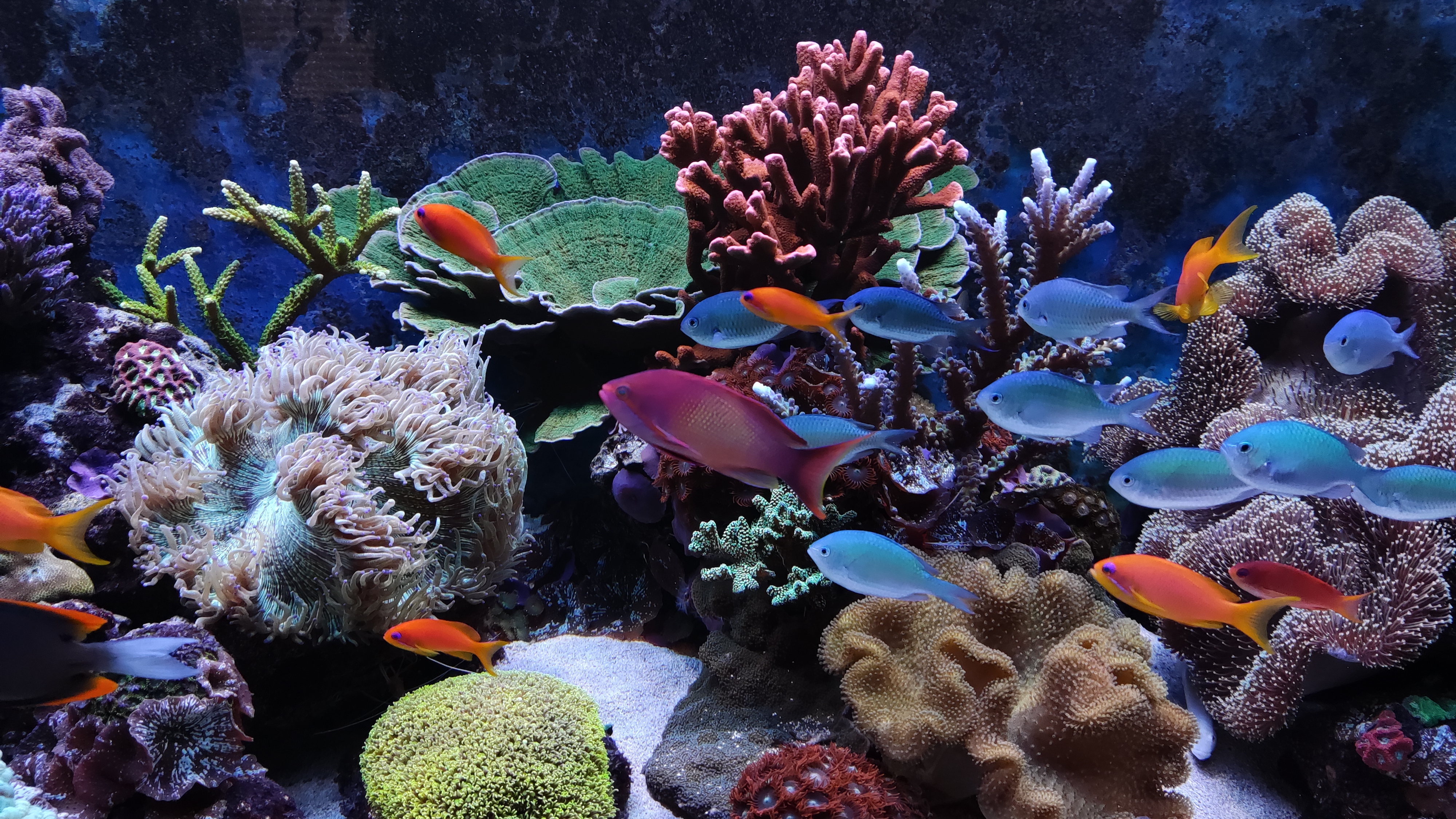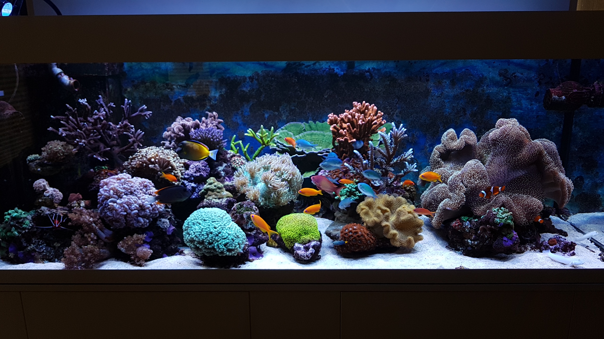 mal zum Vergleich was sich so getan hat in einem halben Jahr. Einige Werte stimmen sogar mit meinem z.B. Hannah Po4 Checker überein und es läuft bereits Po4 Adsorber im Filter mit, der Wert ist Tendenz fallend. Im groben habe ich keine Probleme im Becken bis auf mein LPS Problem. Anbei mal ein aktuelles Bild vom Aquarium, leider musste ich mir ein neues Handy kaufen und das macht keine schönen Bilder.#