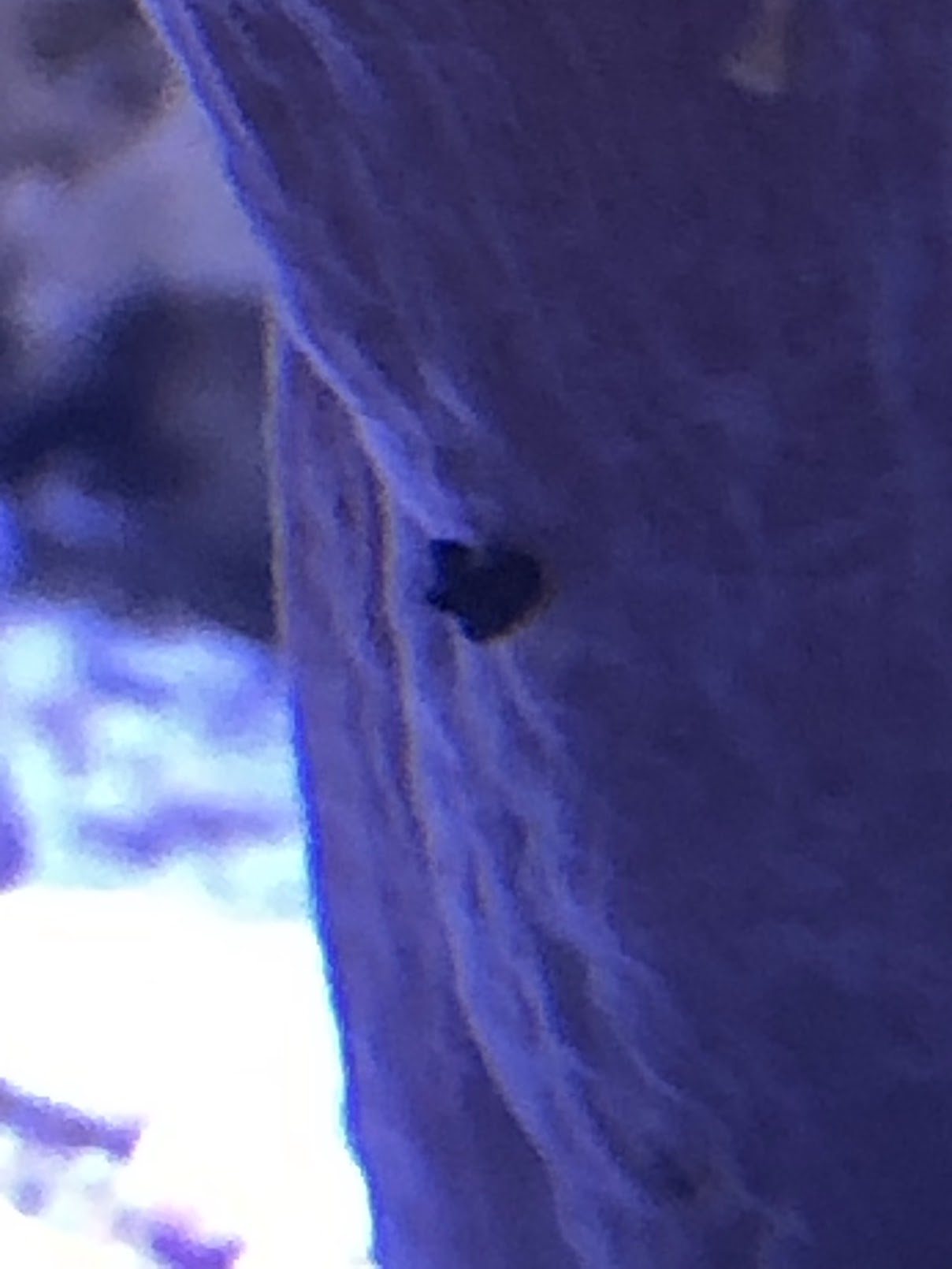 Hm, vielleicht war es nur ein kleiner schwarzer Stein vom Vorbesitzer? Konnte man jedenfalls doch recht leicht abmachen und fühlt sich an wie ein Stein. Vielleicht lag die Koralle mal irgend wo und ist daran festgewachsen. Zurück bleibt eine kleine schwarze Stelle...