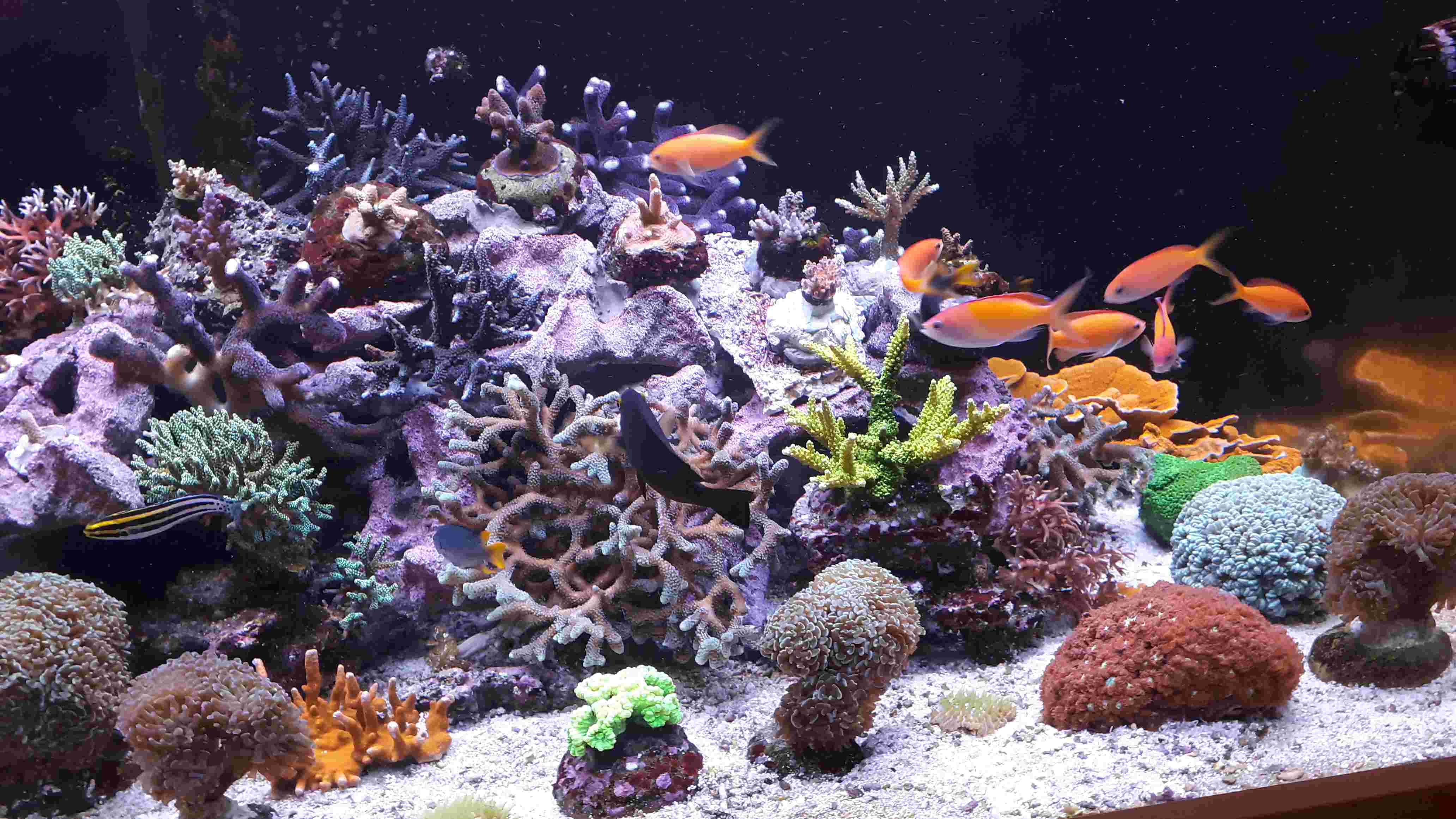 Ozon auf niedrigster Stufe im Dauereinsatz. Anfänglich wird PO4/CA/KH täglich und NO3/Jod wöchentlich getestet.
