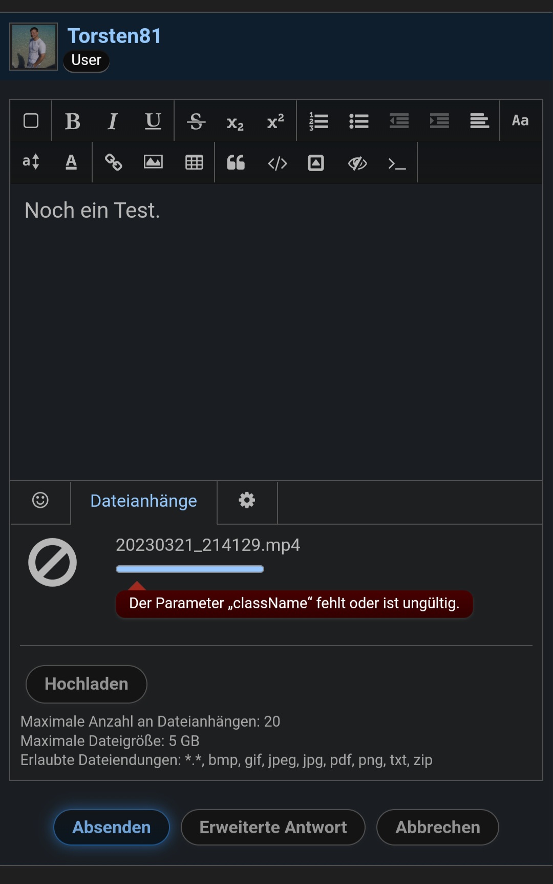 Datei hochladen und Beitrag absenden, dann im abgesendeten Beitrag die Video Datei kopieren.