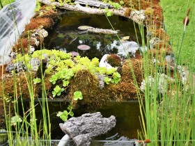 So sieht es - nach einigen Jahren - aus, wenn man in einem 840-Liter-Aquarium im Freien die Glasstege mit Wurzelholz bestückt und mit verschiedenen Moosen bepflanzt. Der Rest ist angeflogen: