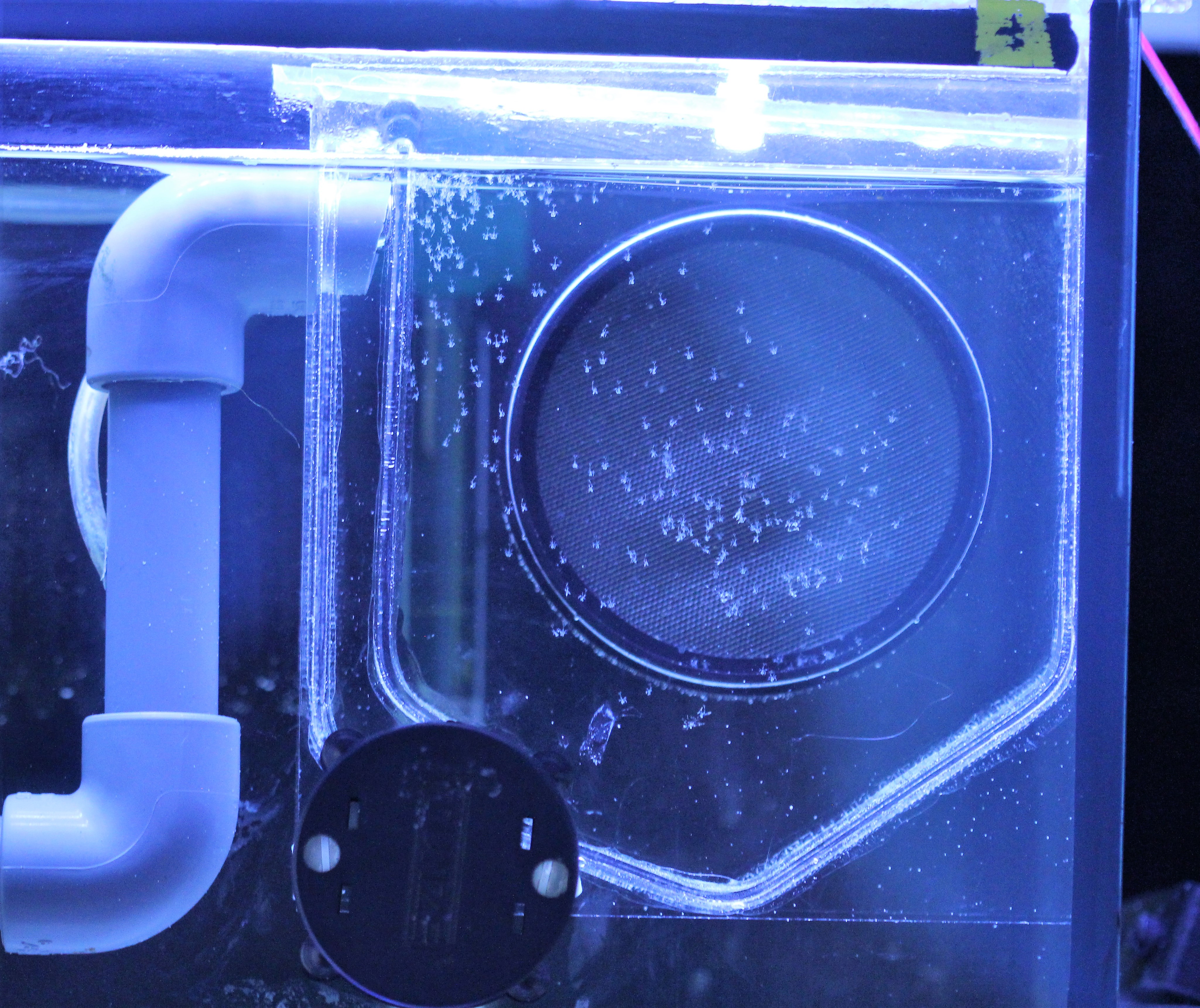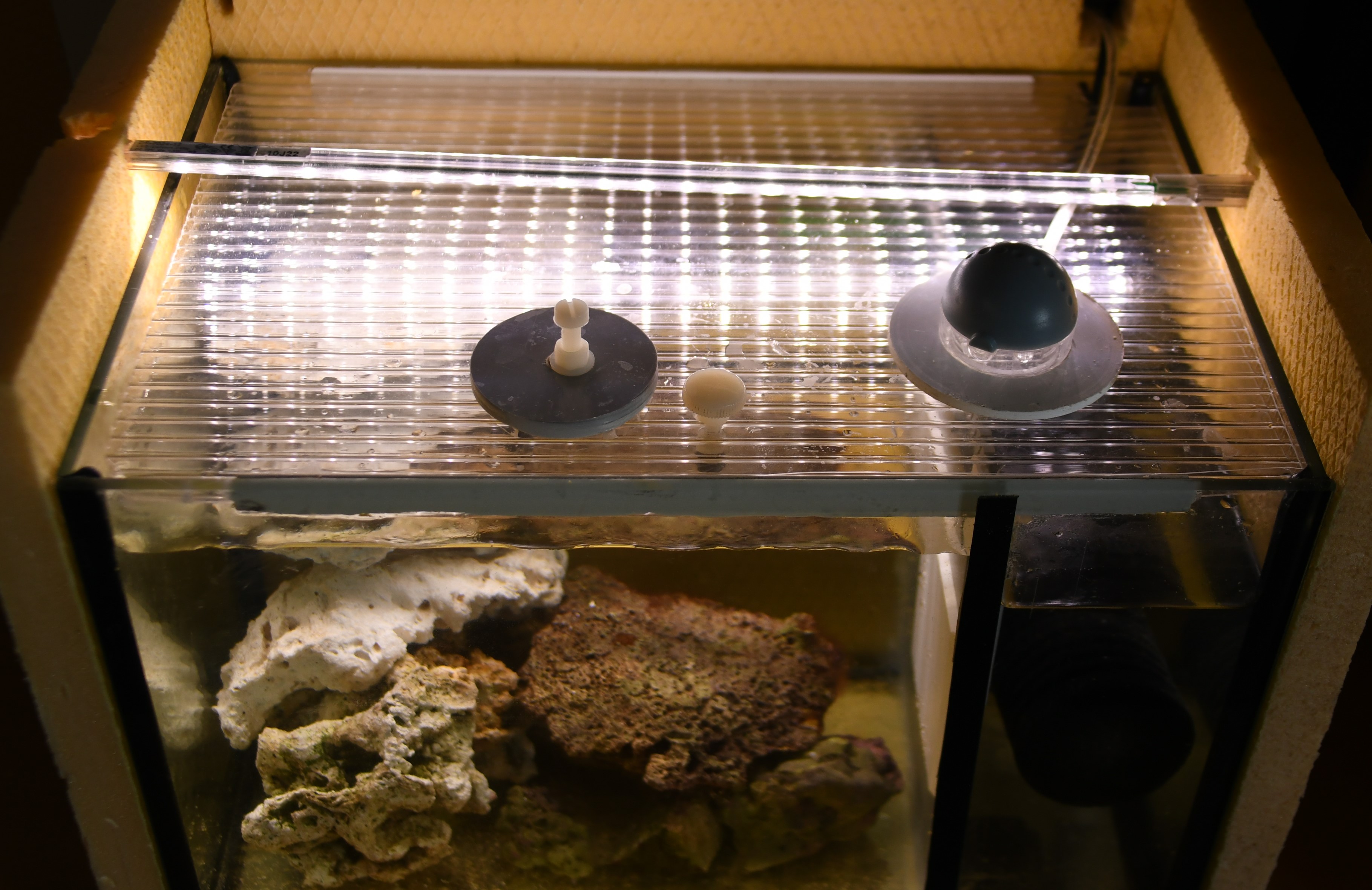 Die Zucht habe ich die letzten Jahre leider links liegen gelassen, so dass ich tatsächlich (vermutlich) nur noch ein Männchen und ein Weibchen im Aquarium habe. Das Weibchen trägt wieder einmal Eier und ich möchte doch versuchen, noch einmal ein paar Palaemon großzuziehen. Im großen Becken klappt das natürlich nicht, also muss das Weibchen kurz umziehen und ihre Jungen müssen vor den Fressgelüsten der Mutter in Sicherheit gebracht werden. Dafür habe ich z.B. schon einfache Gitterbehälter benutzt, die das Muttertier nicht verlassen kann, die Larven aber schon. Das ist aber nicht recht komfortabel für das Alttier und auch nicht völlig sicher für die Jungtiere. Elegant war ein Larvenkreisel, der im Aquarium befestigt war und die Larven automatisch dort hinein beförderte, nachdem sie mit einer LED zur Ansaugöffnung des Lufthebers (auf dem Bild nicht zu sehen) gelockt wurden.