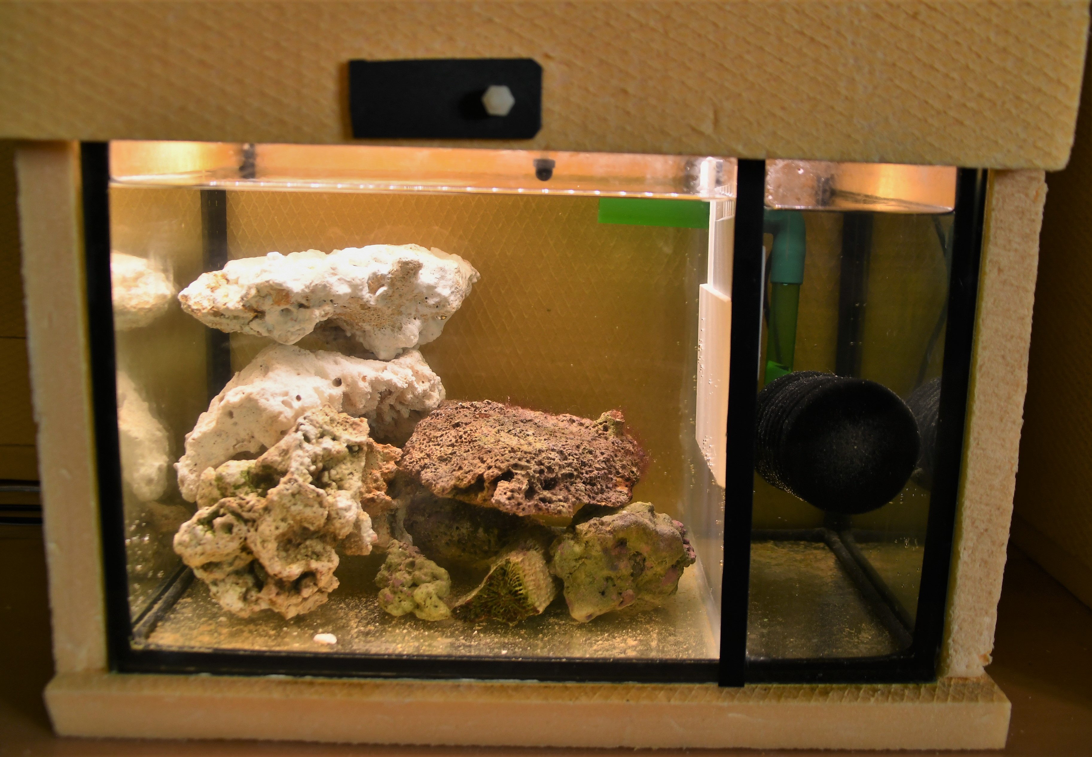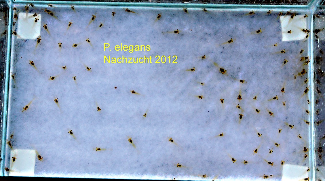 Leider ist diese Eigenkonstruktion nach einem Sturz in das Reich der Plexi-Scherben eingegangen und auf die Schnelle kann ich keinen Ersatz schaffen. Zudem sind Kreisel für die Aufzucht von P. elegans m.E. eh suboptimal. Also habe ich schnell aus einem alten 30x20x20-Becken eine Art Entbindungsstation gebaut.