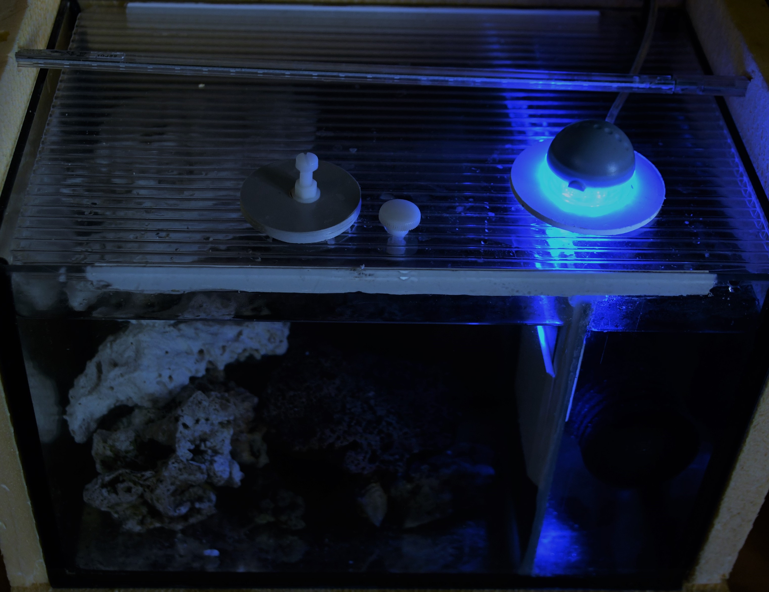 . Tagsüber wird das Ganze mit einer stinknormalen LED-Leiste beleuchtet. Zu helles Licht mögen die P. elegans eh nicht. Gefüttert wird durch den kreisrunden Ausschnitt in der Abdeckung.Im rechten Abteil werkelt eine Minipumpe mit vorgeschaltetem feinem Filterschwamm. Die Trennwand enthält einen höhenverstellbaren Überlaufkamm. Nachts beleuchtet eine blaue LED exakt diese Überlaufstelle.