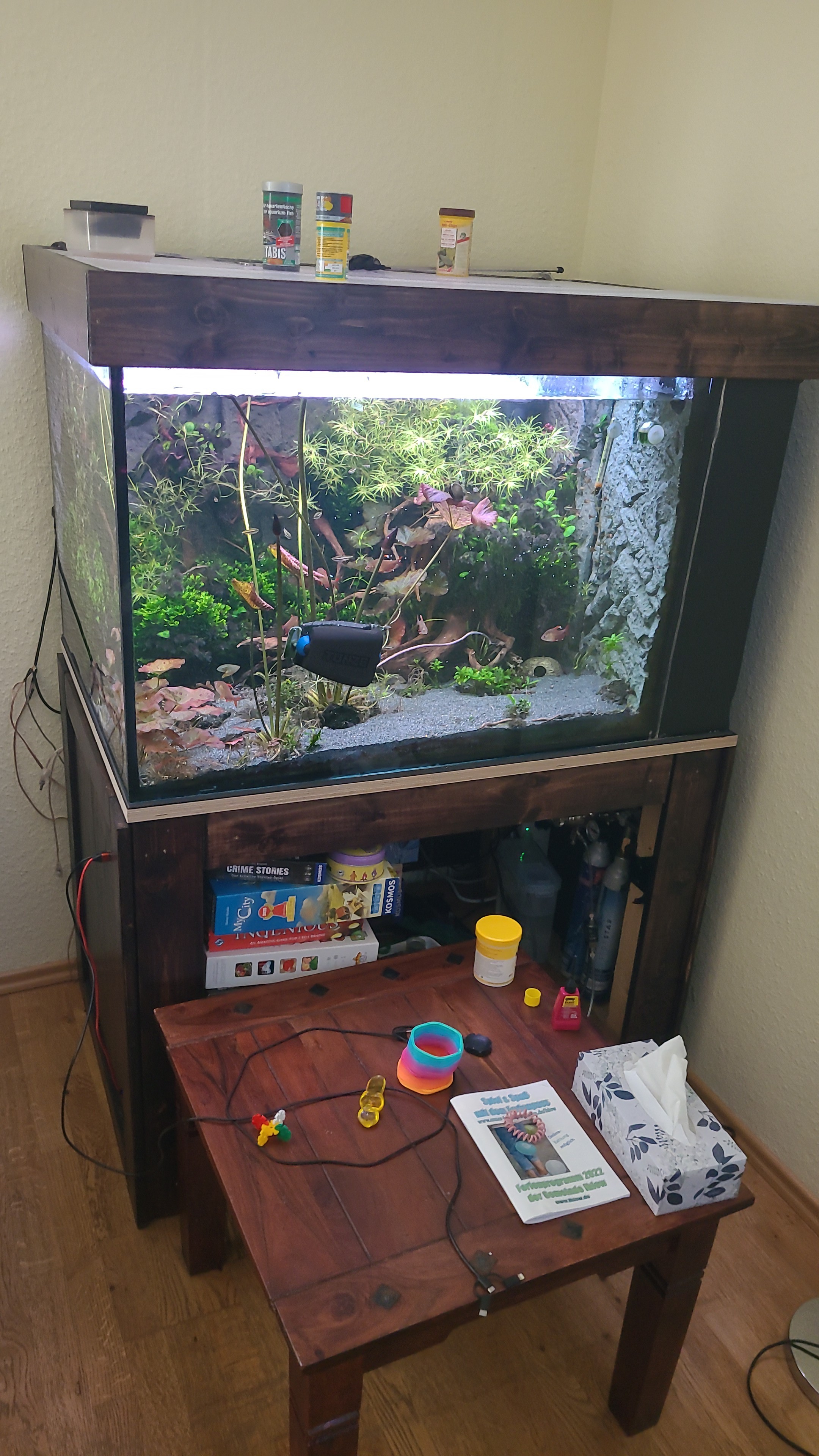 Durch die Temperatur (27-28 Grad) und den Besatz ist es schwer das Becken zumindest weitgehend Frei von Algen zu halten. Lange Zeit war auch der Innenfilter sehr Wartungsintensiv, das konnte ich aber beheben.