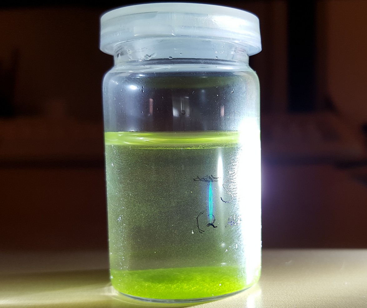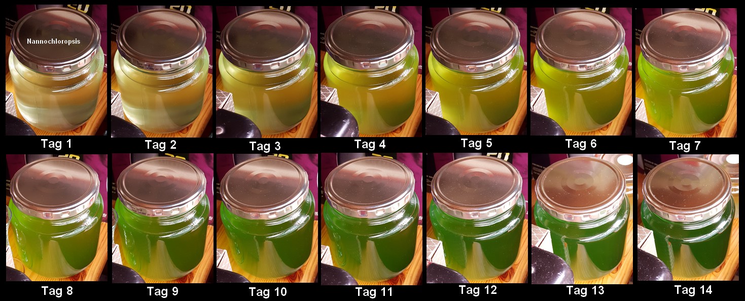 Also war die Aufgabe herauszufinden, ob man Nannochloropsis auch ohne Belüftung testweise in einem 500 ml Glas halten/züchten kann. Das hat besser funktioniert als ich mir vorgestellt habe: Es wächst seit über einem Monat darin problemlos. Zweimal am Tag rühre ich mit einem Löffel alles auf, aber es setzt sich kaum was ab. Habe bisher nur einmal testweise mit einer Pipette etwas vom Grund abgetragen. Die Kultur hat 5% Salinität da ich gelesen habe, dass dies unerwünschte "Mitbewohner" fernhalten soll. Das hat auch gut funktioniert: Die Kultur ist, bis auf wenige Bakterien, sauber und rein (siehe Fotos). Ich habe Zugriff auf ein Labormikroskop und konnte die Kultur daher immer genauestens beobachten. Durch die fehlende Belüftung dauert es etwas länger bis zum Dunkelgrün werden und der Effekt ist begrenzt, da die hinteren Zellen in der Lösung stundenlang nicht optimal mit Licht versorgt werden - bis zum erneuten Umrühren. Mal von der mangelnden CO2-Versorgung abgesehen. Gedüngt wurde mit Dünger f/2 nach Guillard.