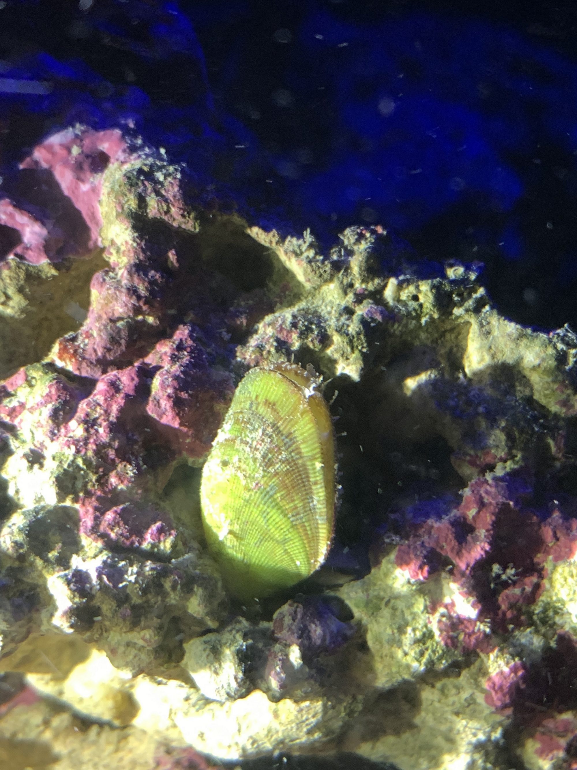 ich habe seit langem diese Muschel im Riff. Sie hat auch die schlimmsten Zeiten überlebt, wo Cyanosis alles andere platt gemacht haben (also fast, die Kalkrotalgen haben es auch überlebt).