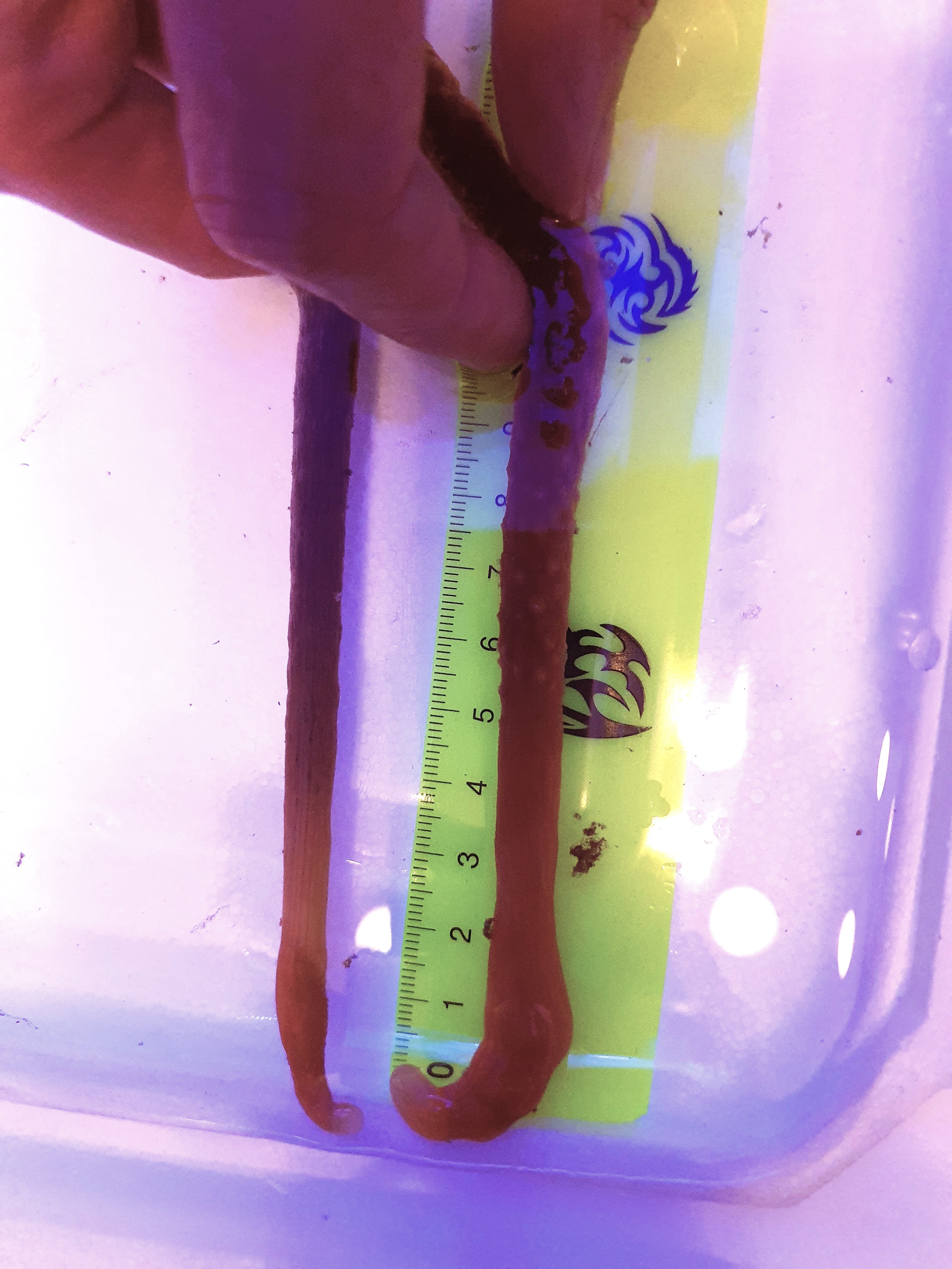Als ich meine Seefedern zu Hause hatte, versuchte ich zunächst zu bestimmen, wie lang das im Tier enthaltene Skelett ist.