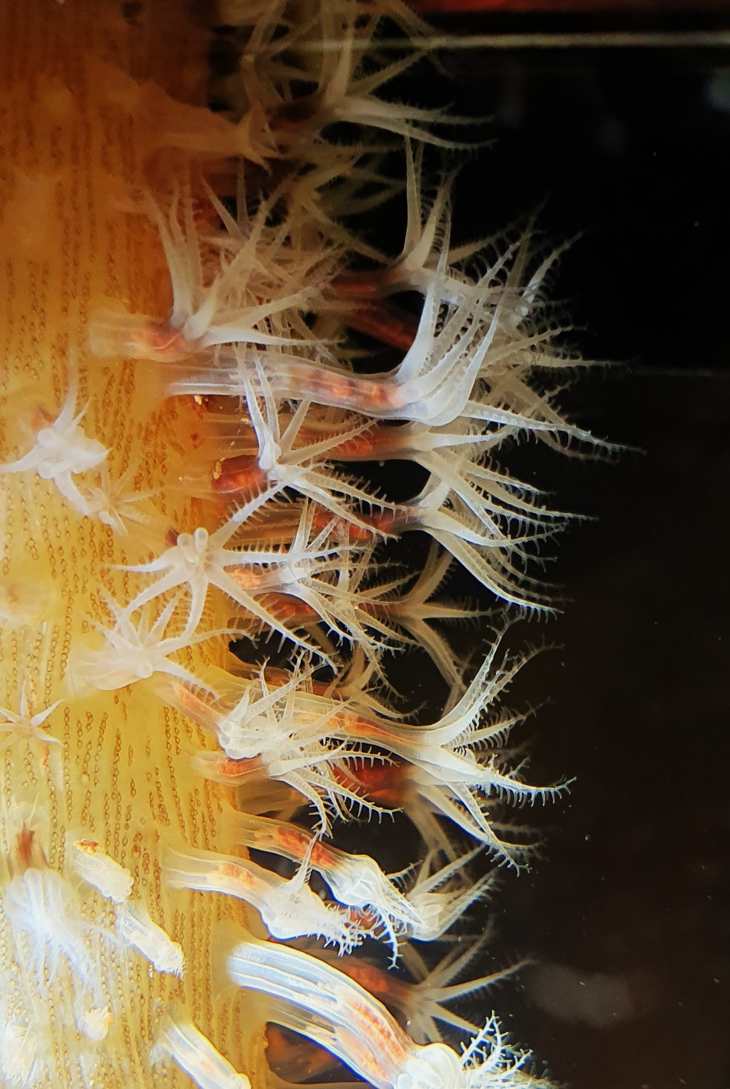Nahaufnahme von Polypen, die bereits Futterpellets aufgenommen haben. Die Polypen werden immer größer, je länger sie gefüttert werden.