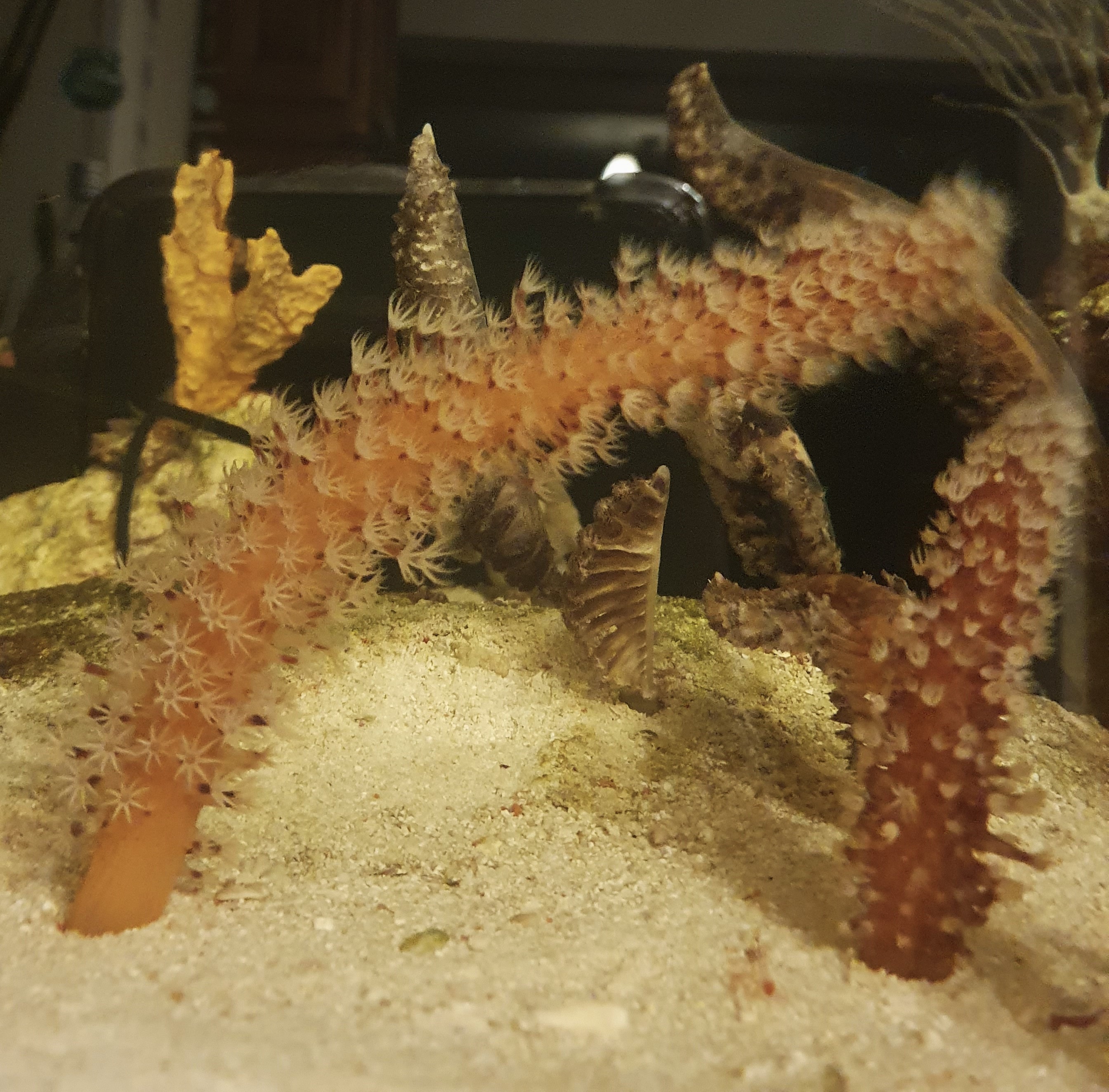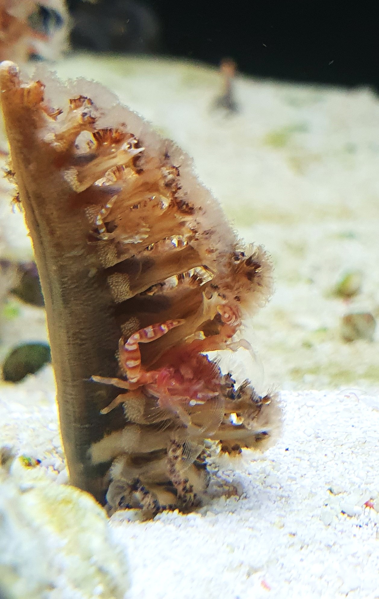 Vor Jahren hatte ich bereits eine dem Tode geweihte Seefeder aufgepäppelt, bis sich eine Anemonengarnele anfangs unbemerkt an ihr zu schaffen machte. Durch die Attacken verendete das Tier und es blieb nur ein Skelett zurück.